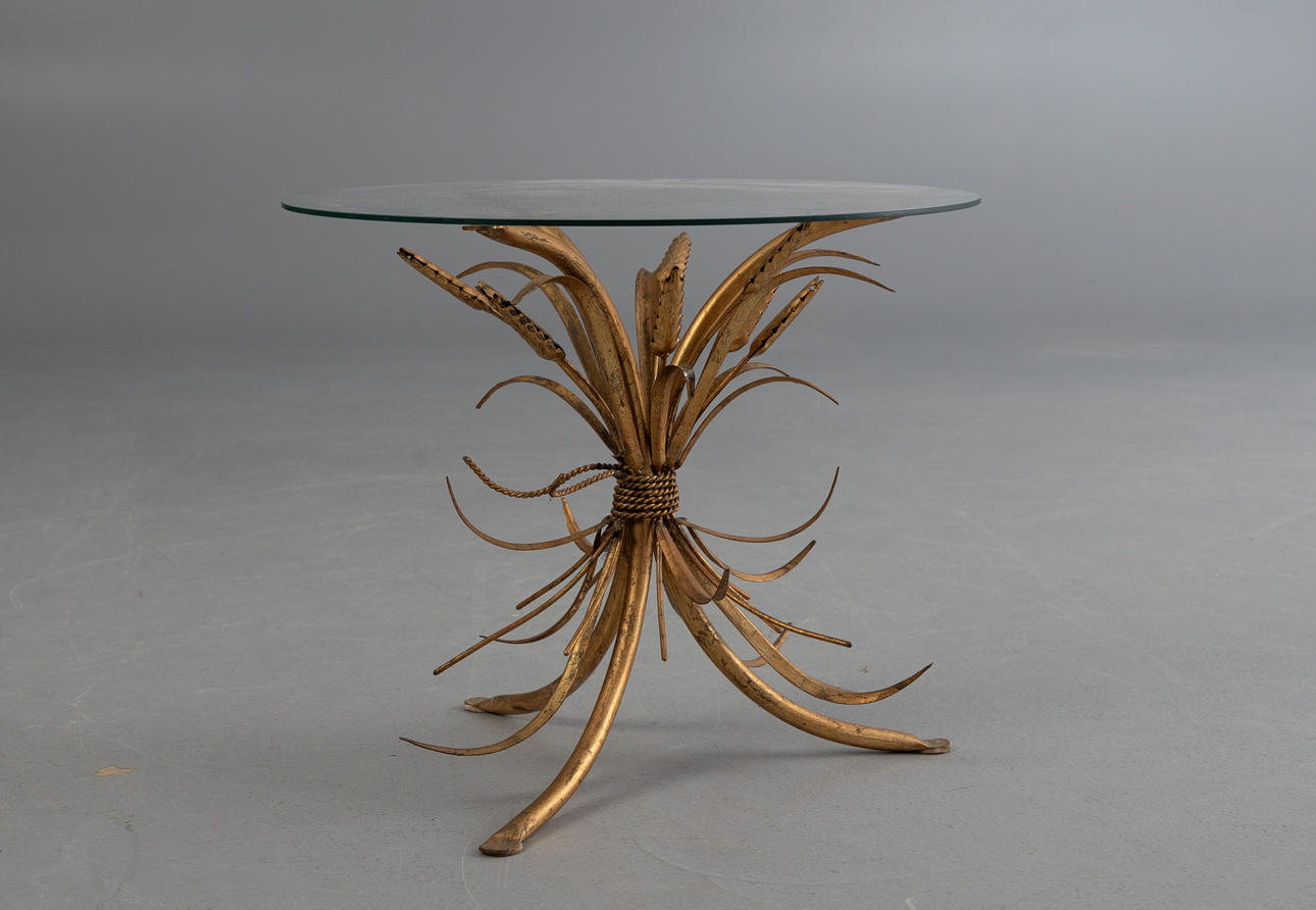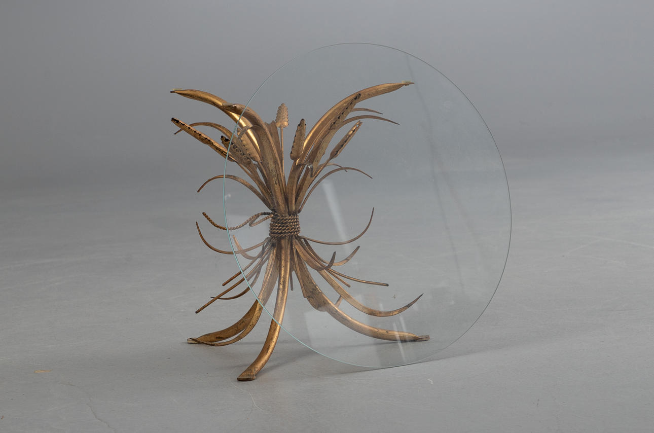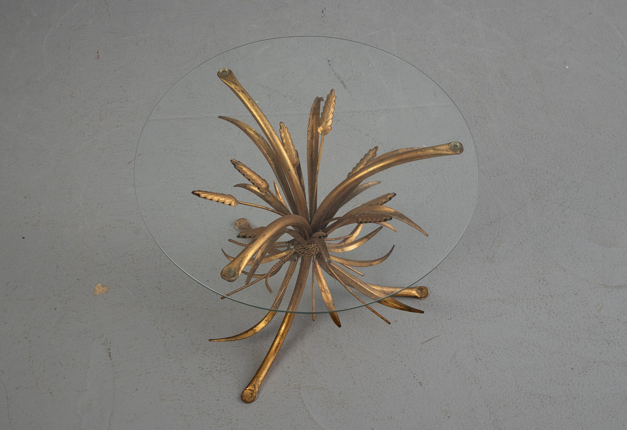 Coco Chanel style coffee table, 1960s. Ear-shaped base in gold leaf gilded metal. Loose round table top made of glass.