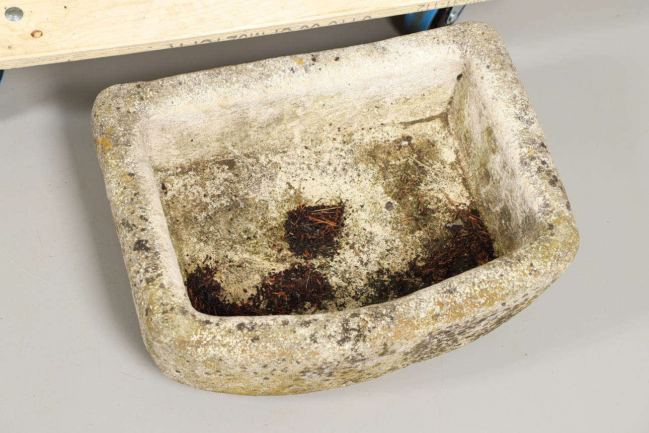 A SHALLOW CONCRETE TROUGH AND TWO SQUARE PLANTERS.