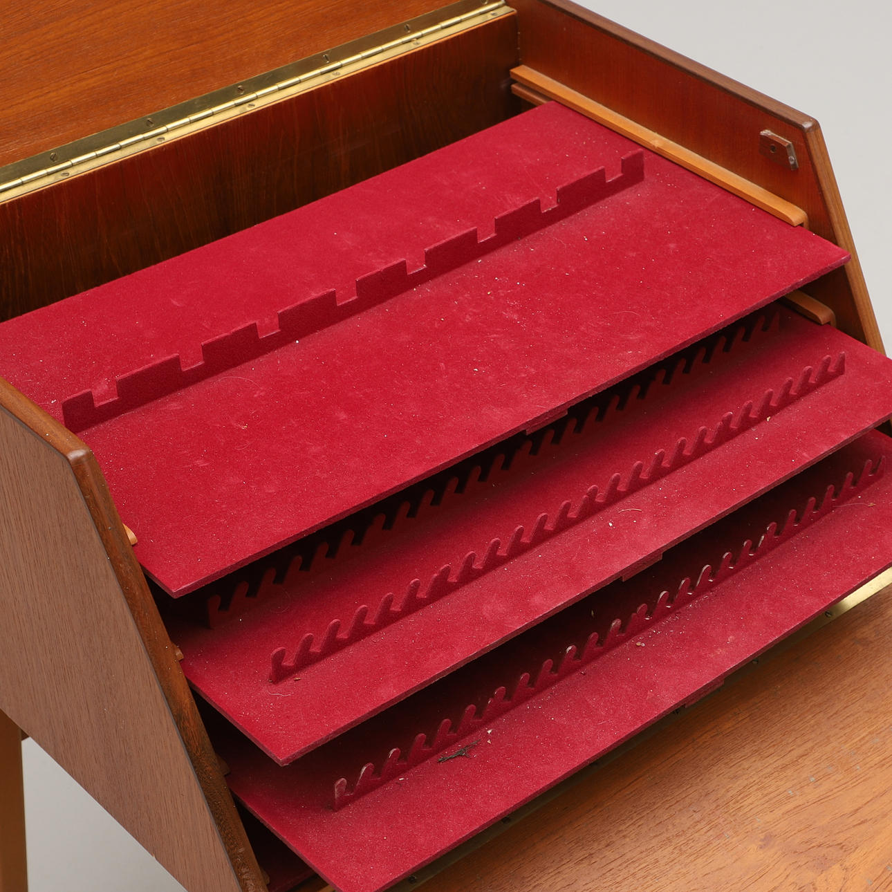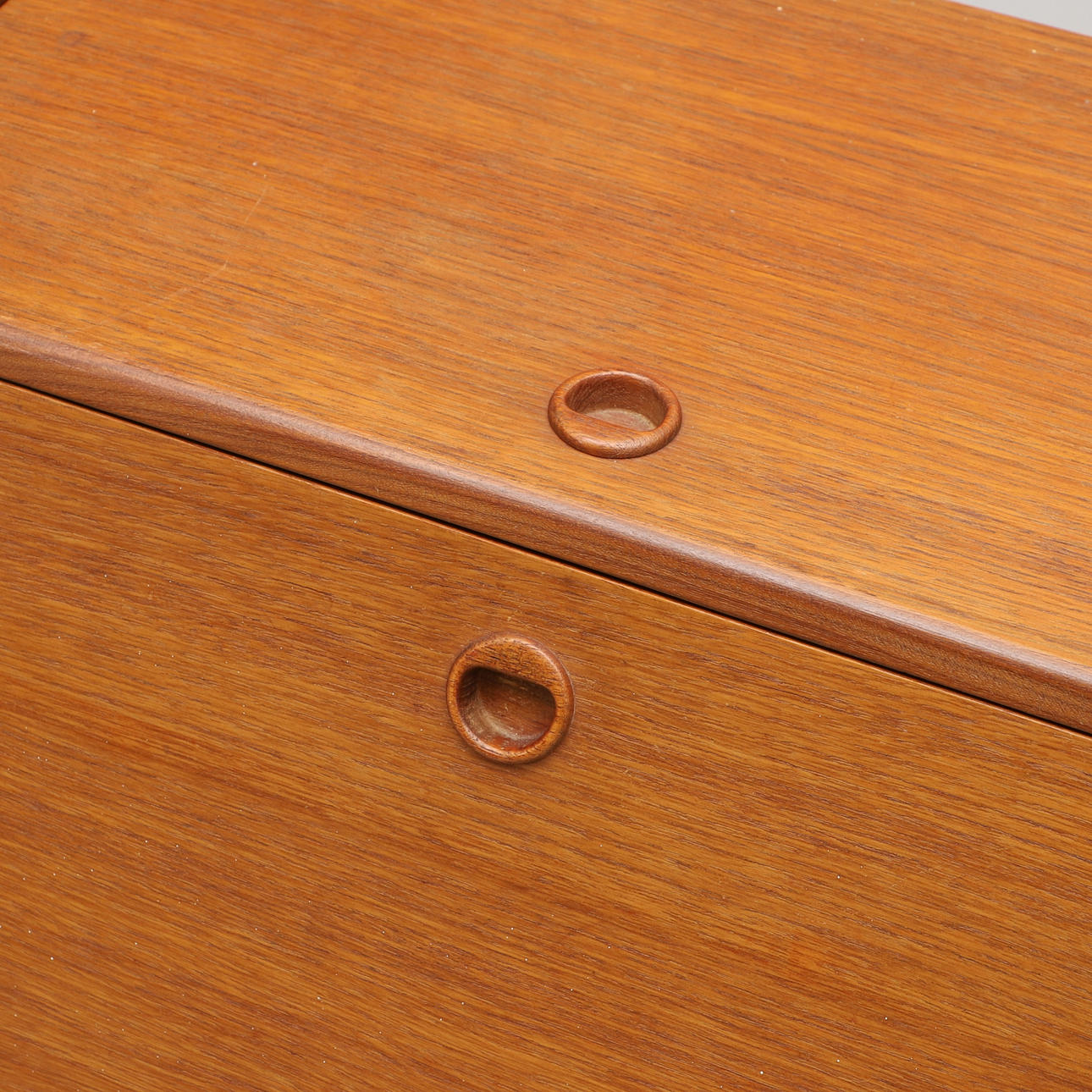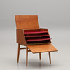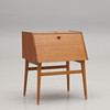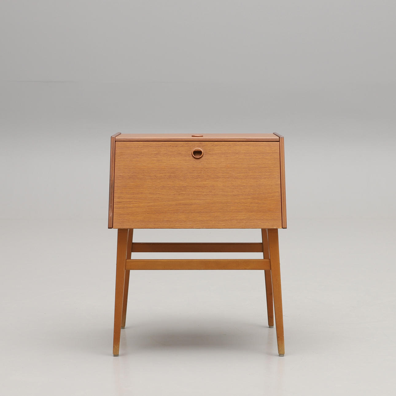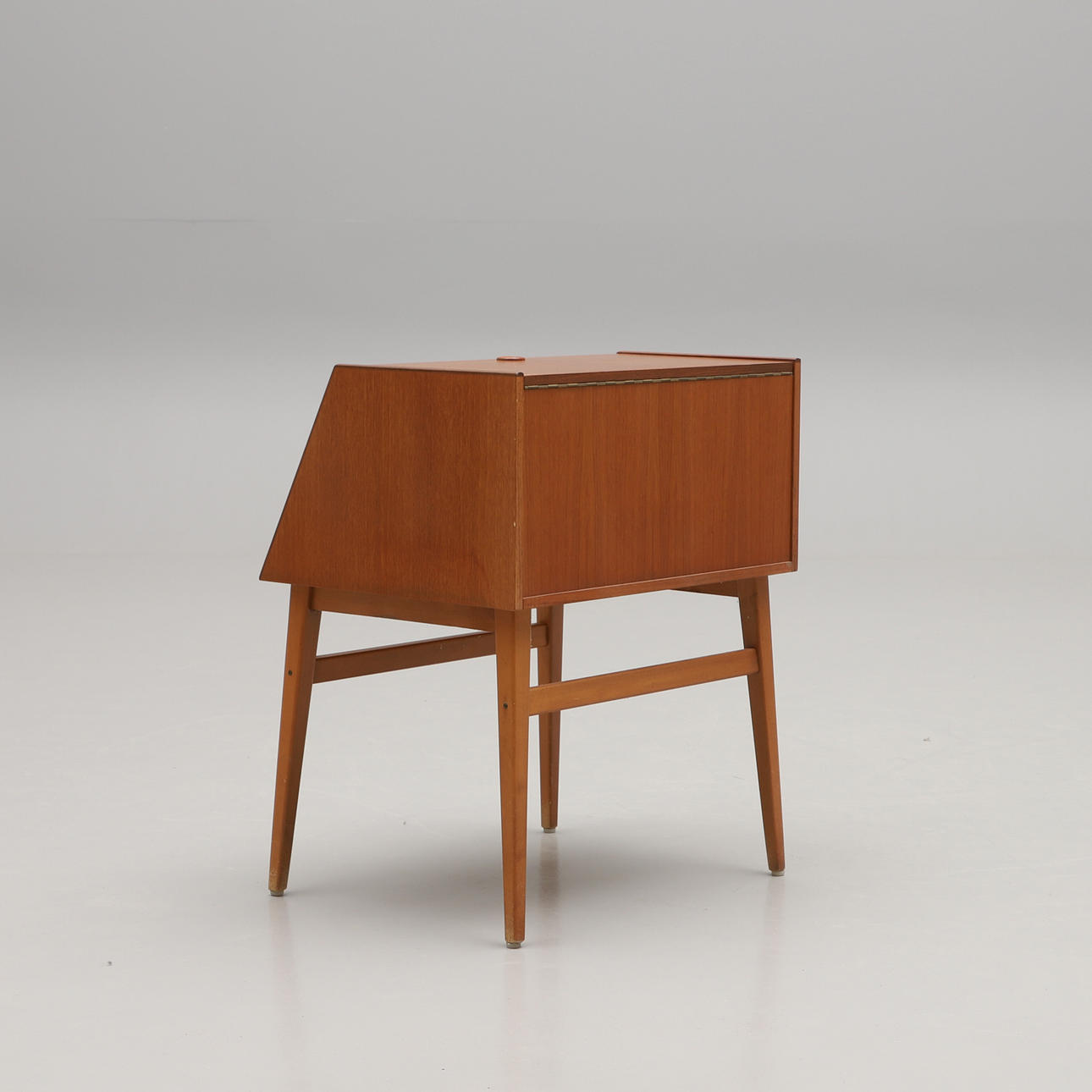 Frame veneered in teak. Undercarriage in beech. Two hatches. Width 55 cm. Depth 44 cm. Height 68 cm.