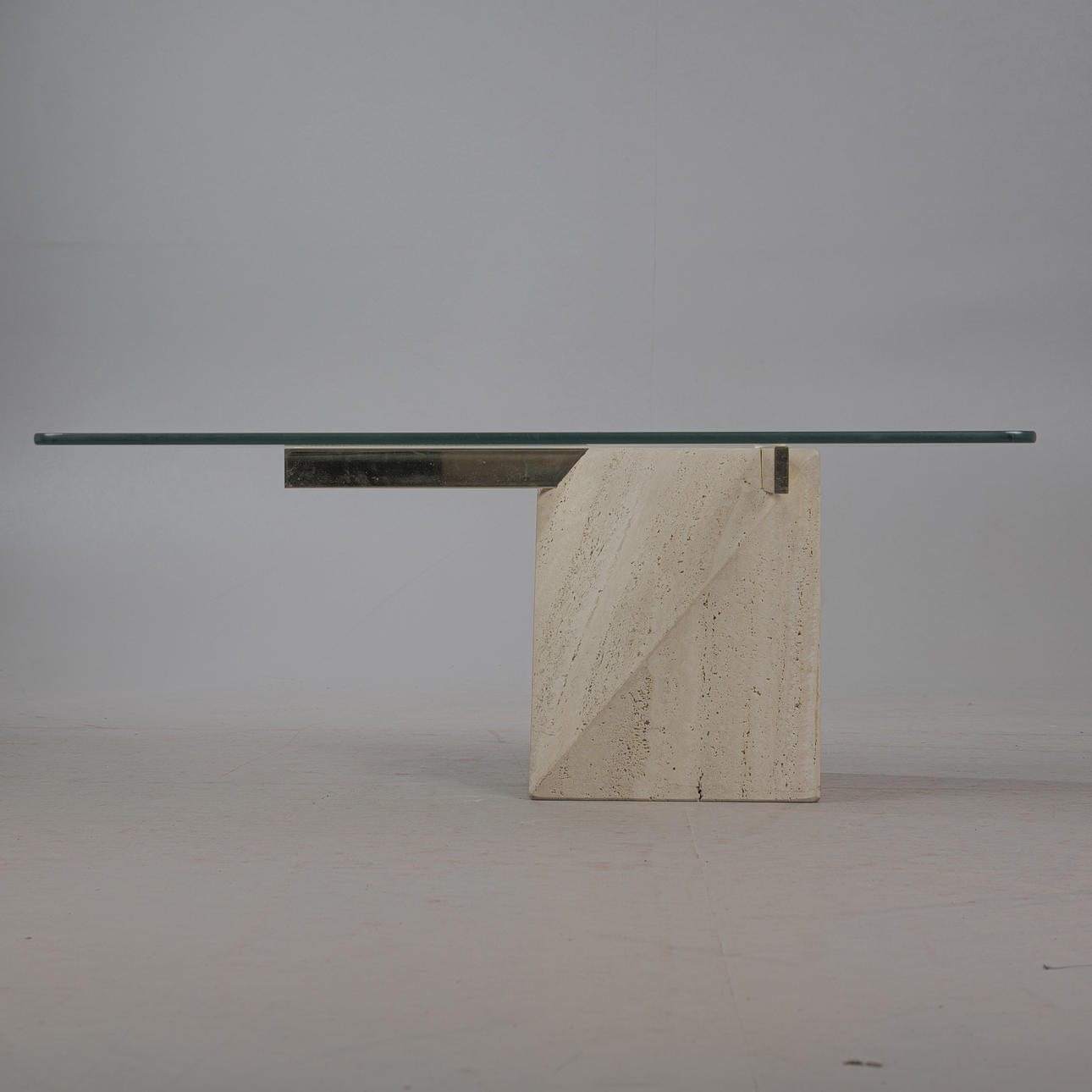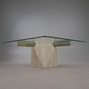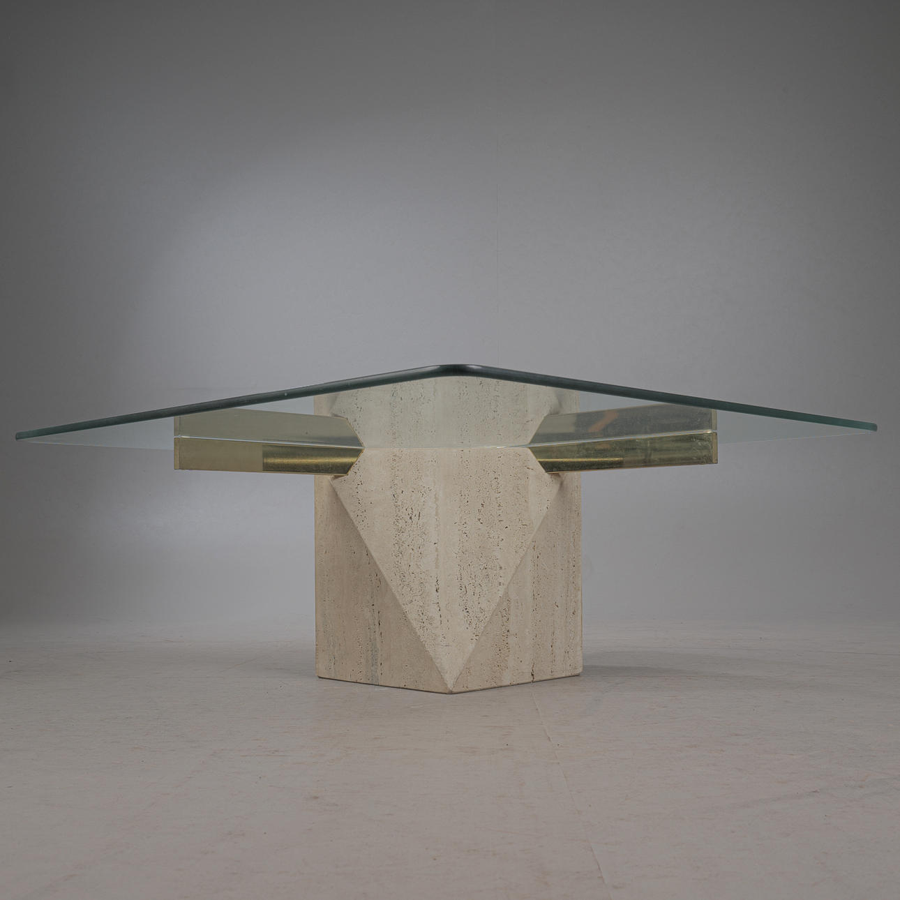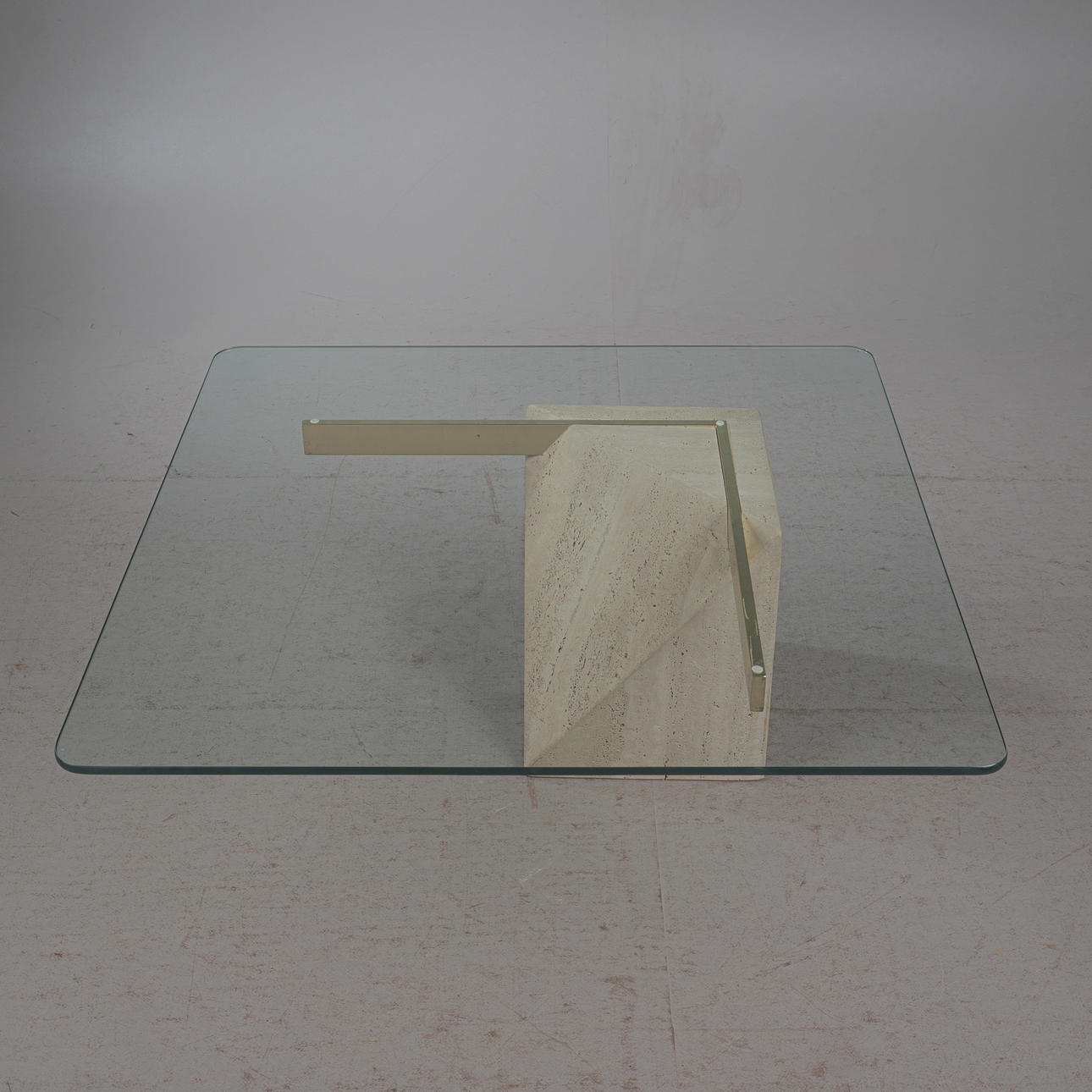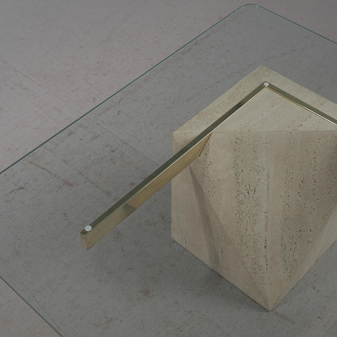 Artedi, coffee table / side table, travertine, brass, 1970s, Italy. Structure with a pentagonal pillar made of travertine, a rectangular bracket made of shiny brass embedded in it and a loosely placed tabletop made of glass with rounded corners, H.42cm, L.100cm, W.100cm.