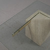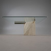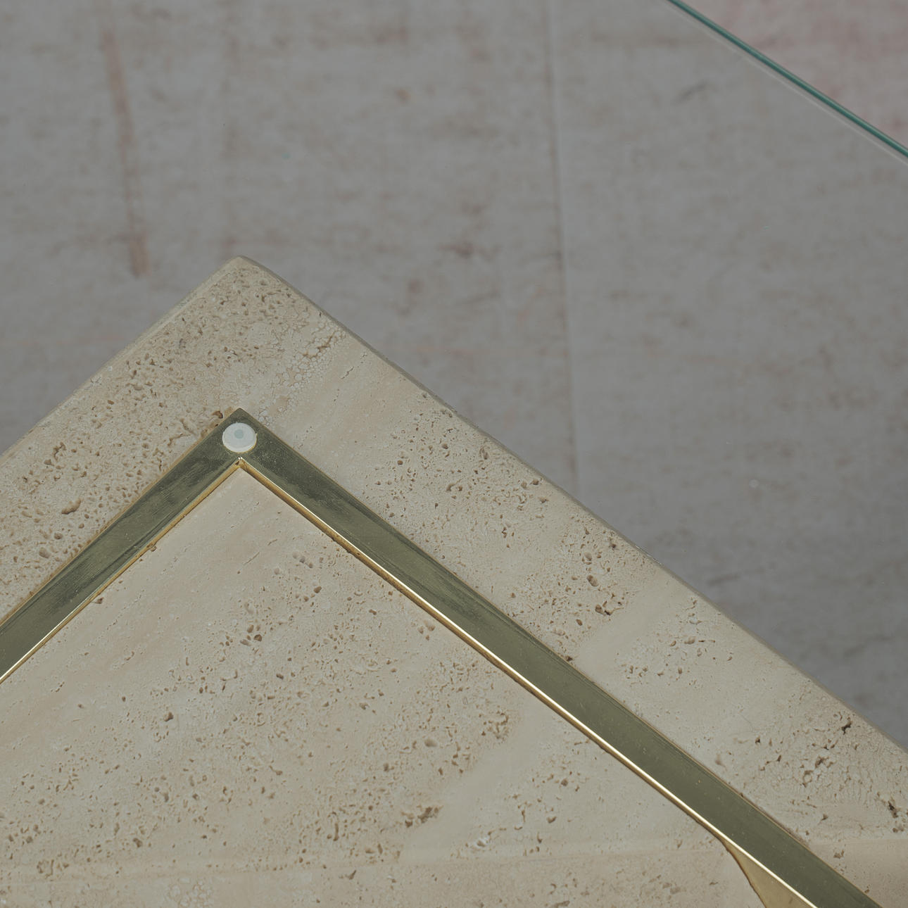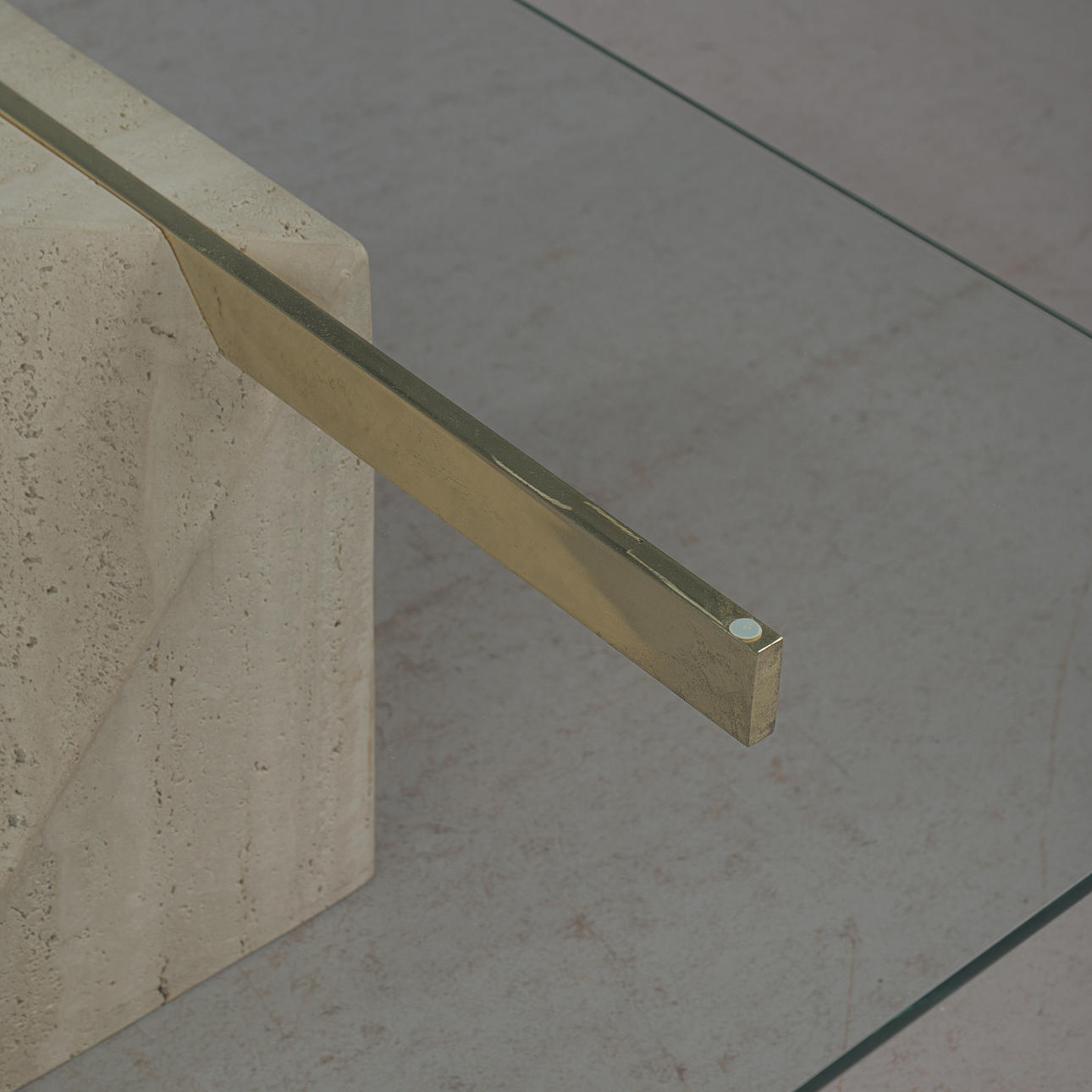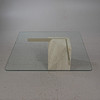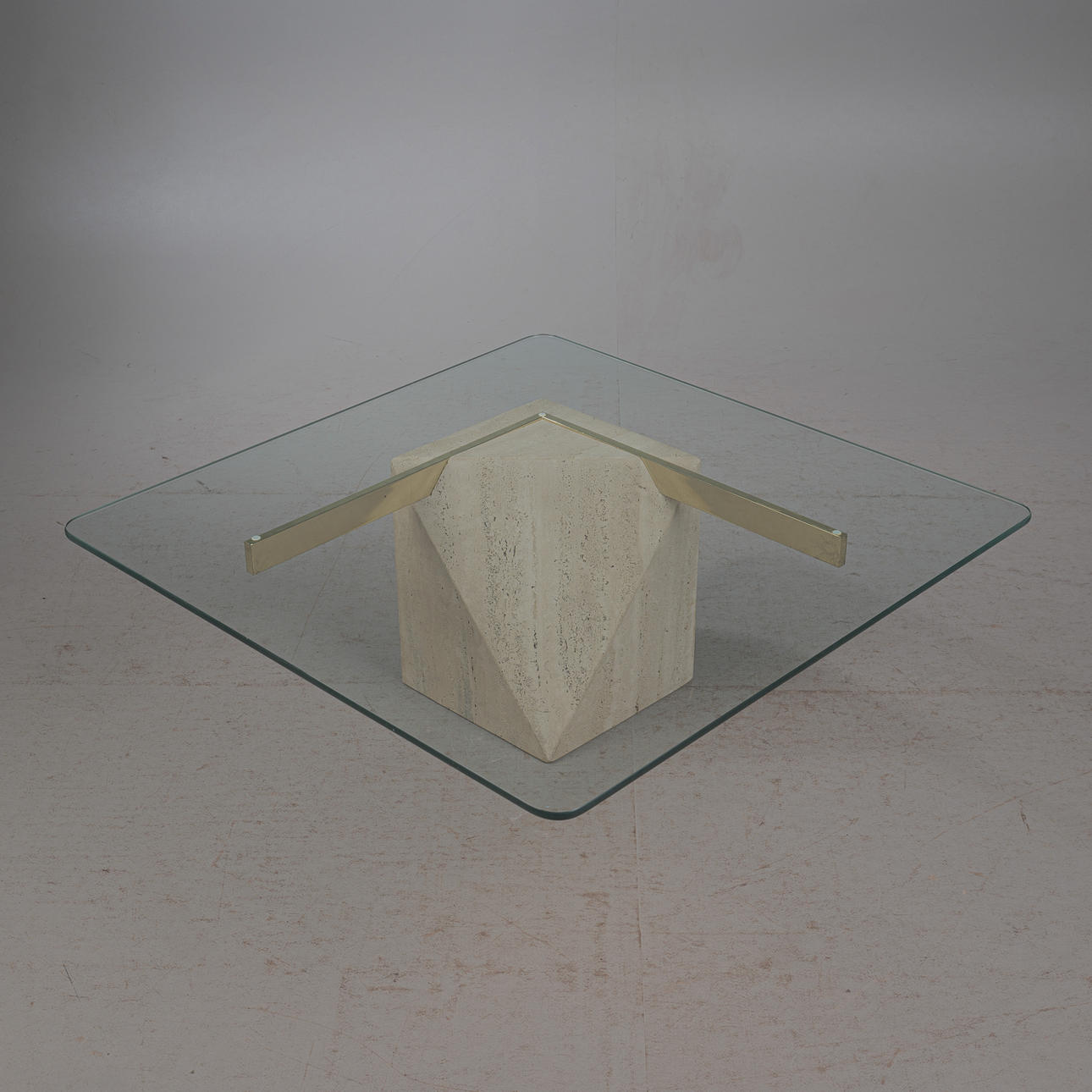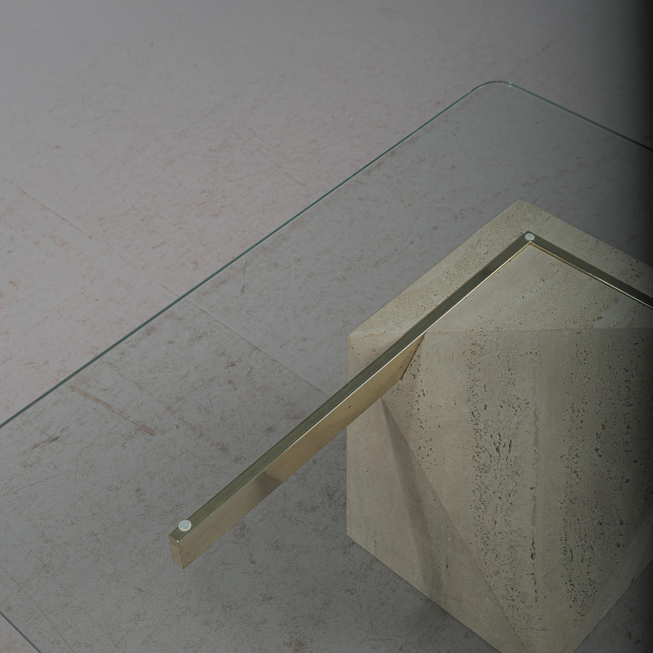 Artedi, coffee table / side table, travertine, brass, 1970s, Italy. Structure with a pentagonal pillar made of travertine, a rectangular bracket made of shiny brass embedded in it and a loosely placed tabletop made of glass with rounded corners, H.42cm, L.100cm, W.100cm.