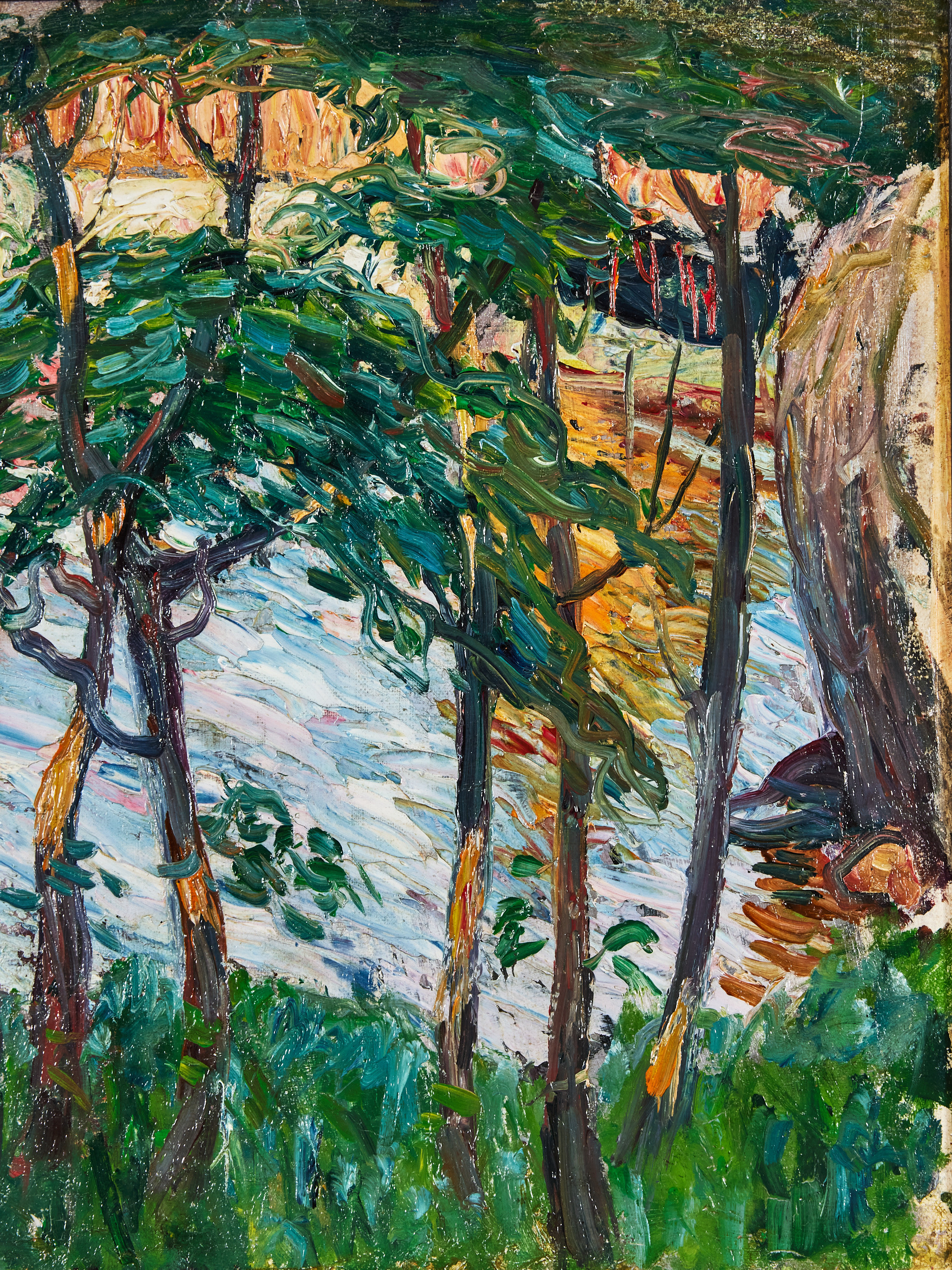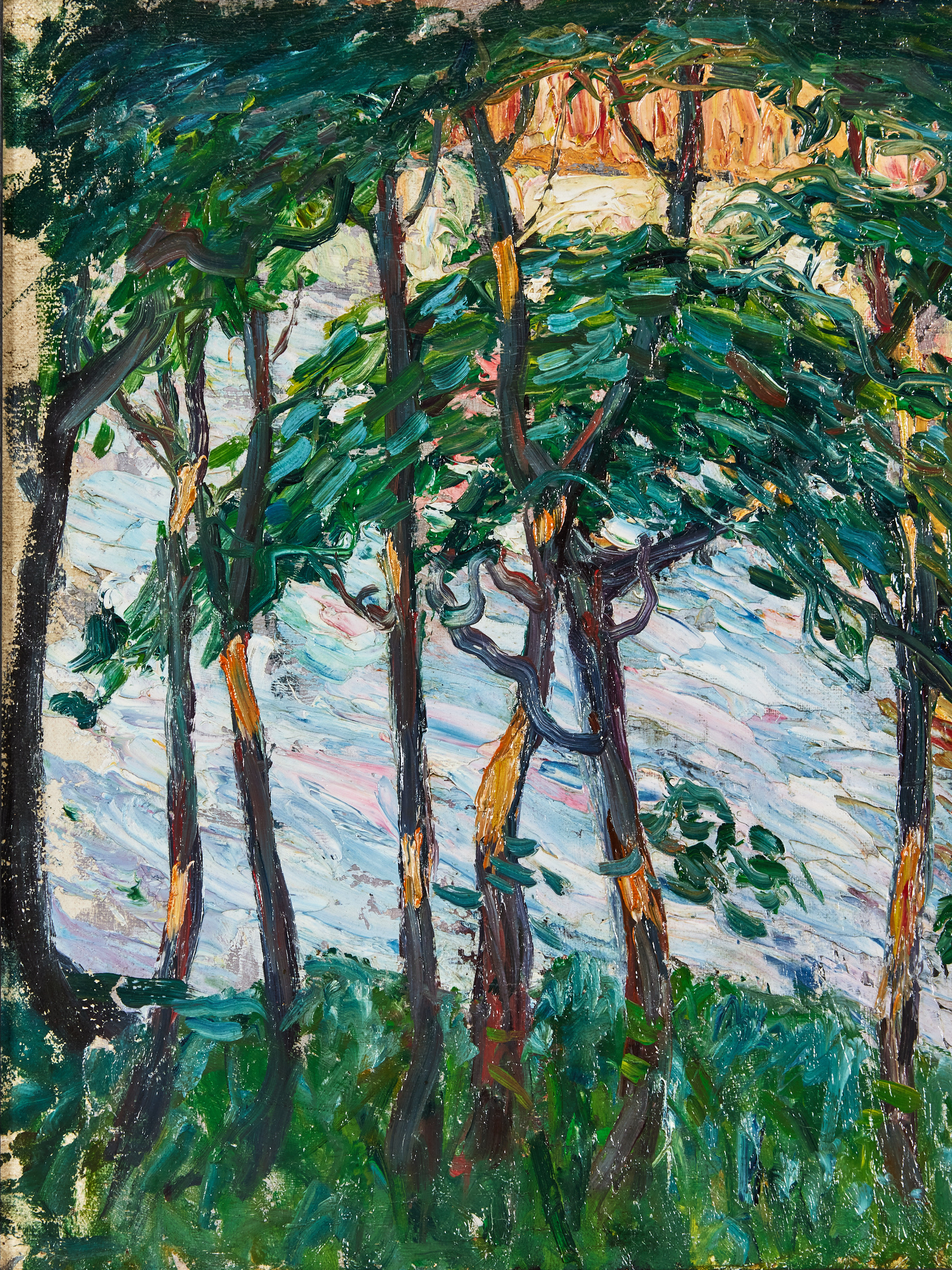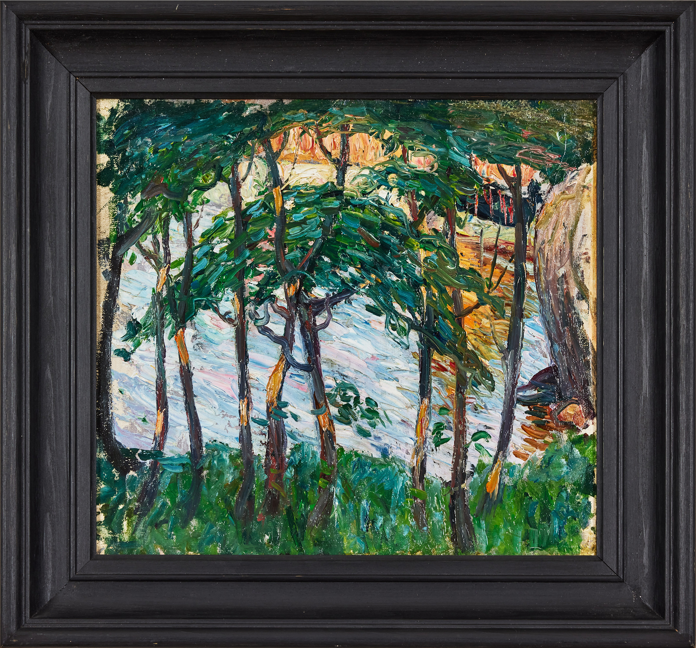 18. 2967786. OIDENTIFIERAD KONSTNÄR, OMKRING 1900. Trees and rocks by river.