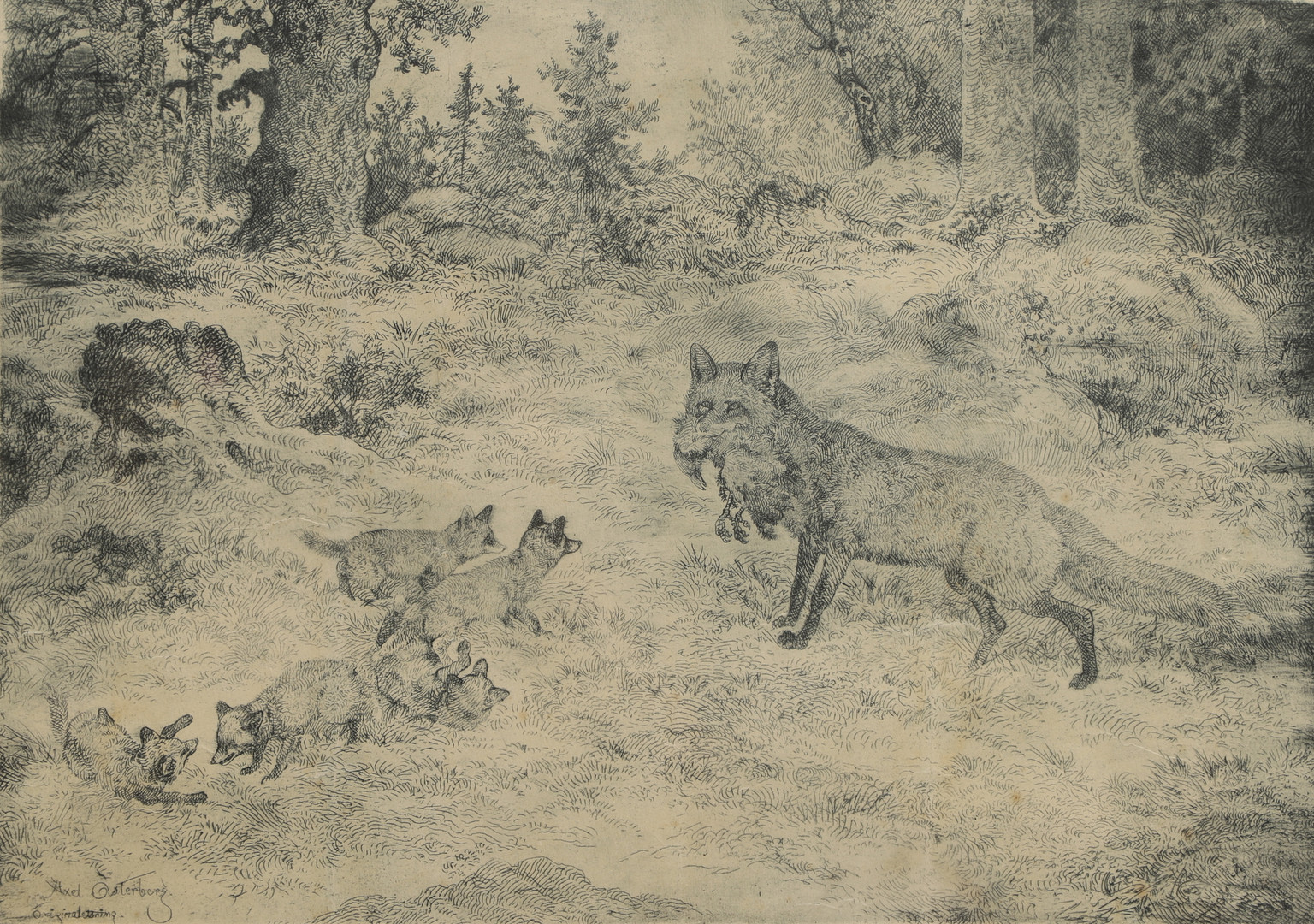2968280. AXEL ÖSTERBERG. original etching, fox with cubs, signed.
