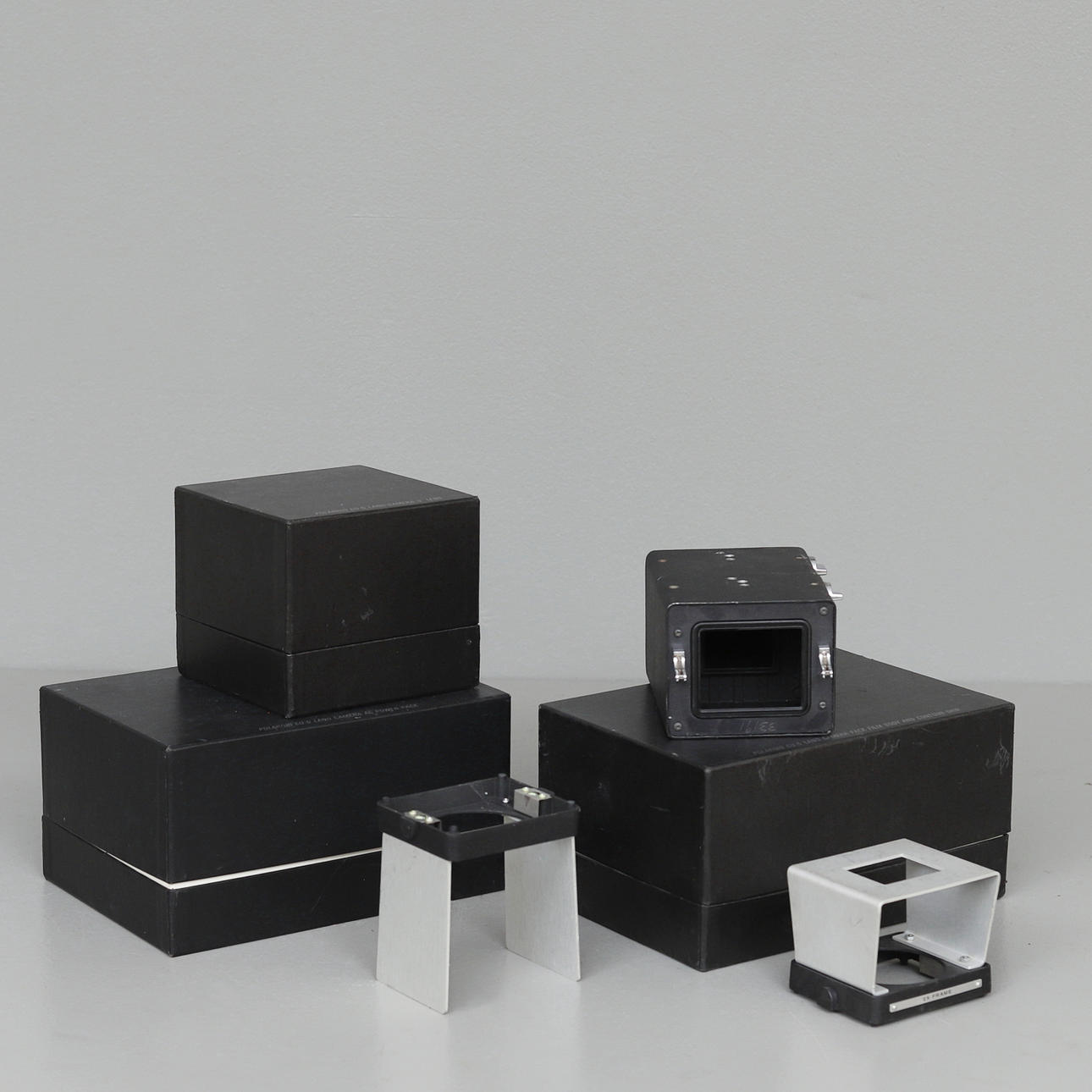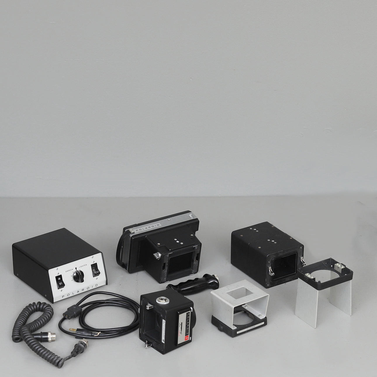 Polaroid CU-5 camera with contour grip Polaroid #88-3 lens module with lens Tominon 4.5/75 mm Polaroid AC Powerpack power supply 2 multipliers and stand for 1:1 and 2x magnification With original boxes.
