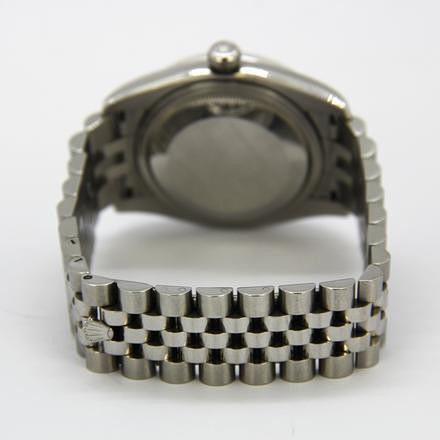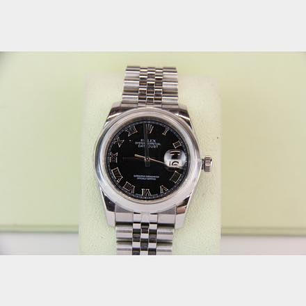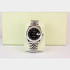 A boxed black-faced Rolex Oyster datejust stainless steel wristwatch.