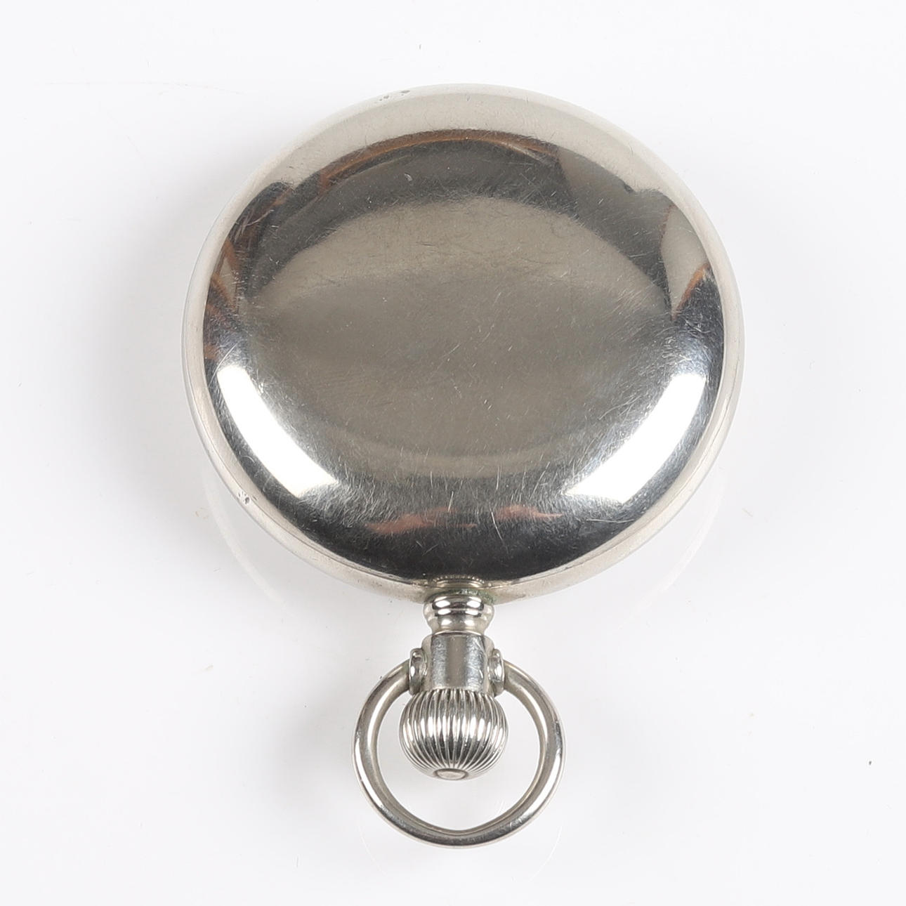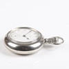 Omega pocket watch with steel case, white dial with Arabic numerals and seconds display. Manual movement, case Ø 59 mm Weight 160 g.