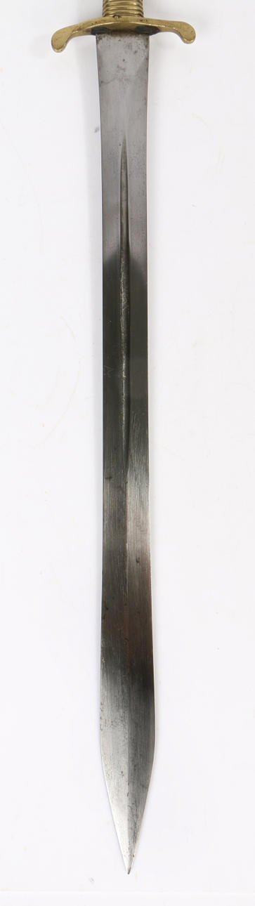 British Pattern 1837 Brunswick Sword Bayonet, double edged, fullered, steel blade, brass crossguard, ribbed brass grip with slot fitting, no military markings or inspection marks which would suggest this weapon was Volunteer issue, scabbard absent, blade length 55 cm.