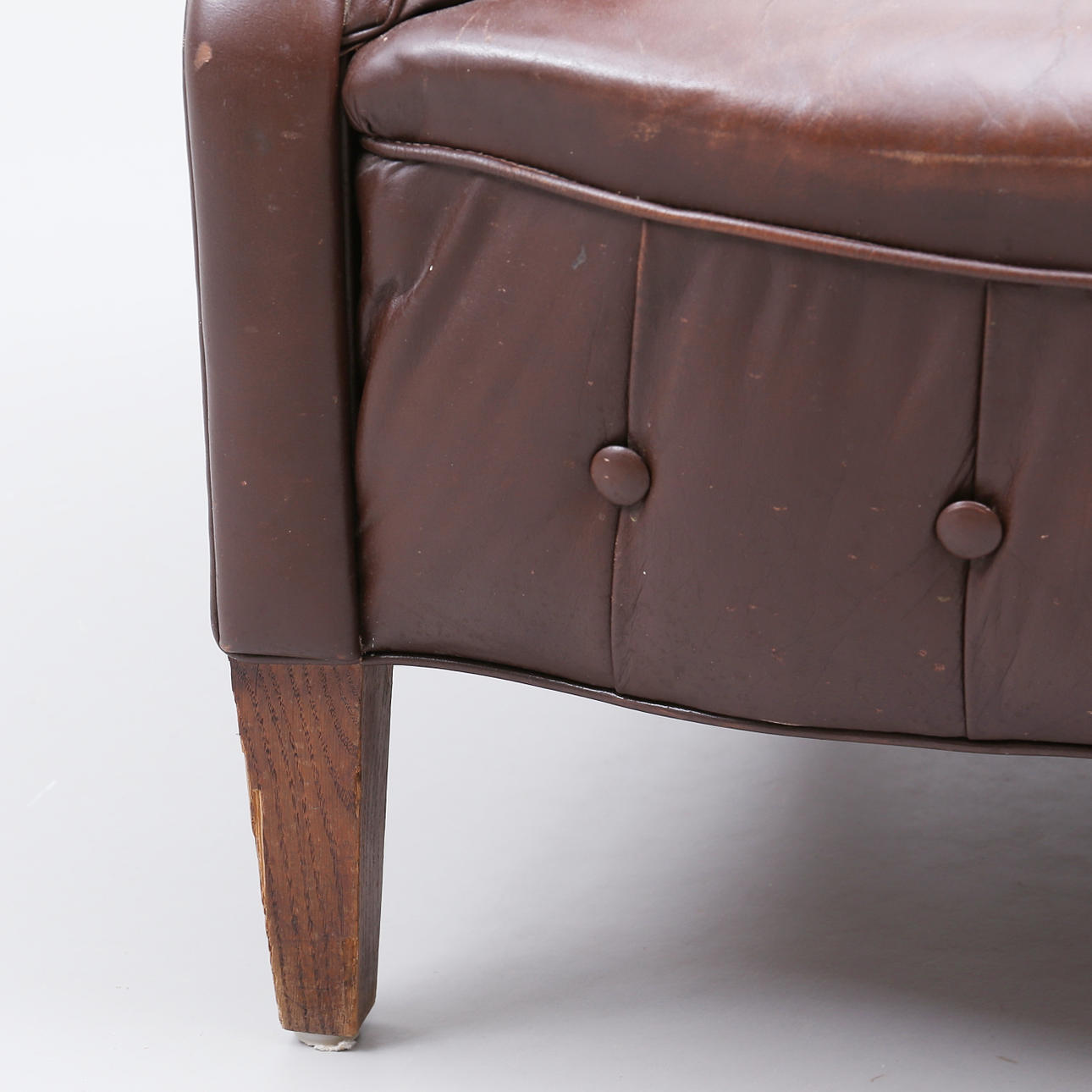 Rough wear on armrests. Dry cracks. Stains, scratches. Injuries, marks on legs.