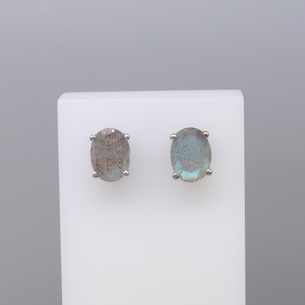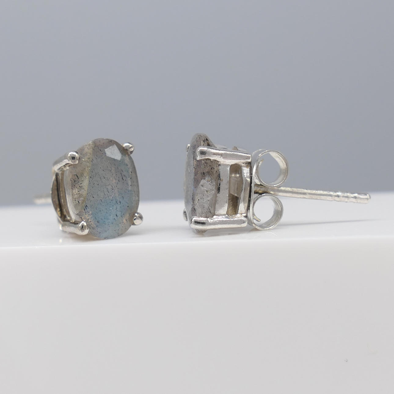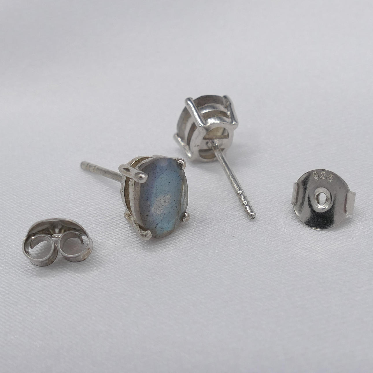 A pair of sterling silver ear studs set with oval-cut labradorite gemstones, fitted with butterfly backs.