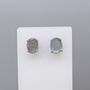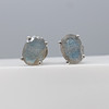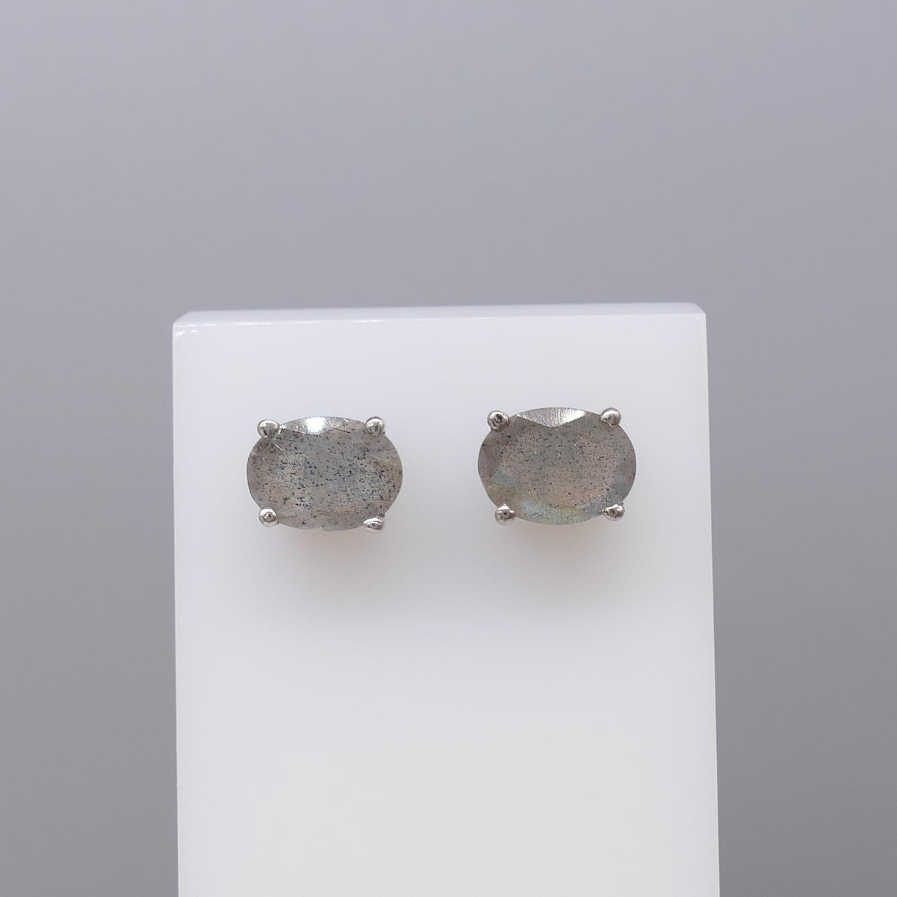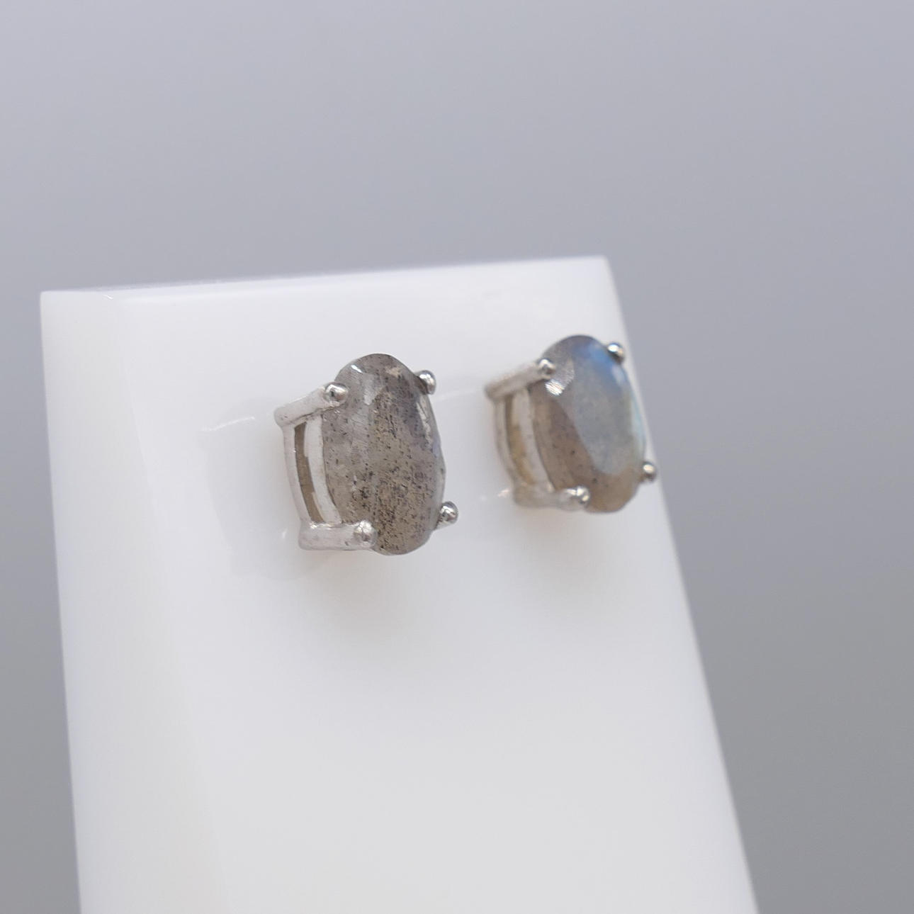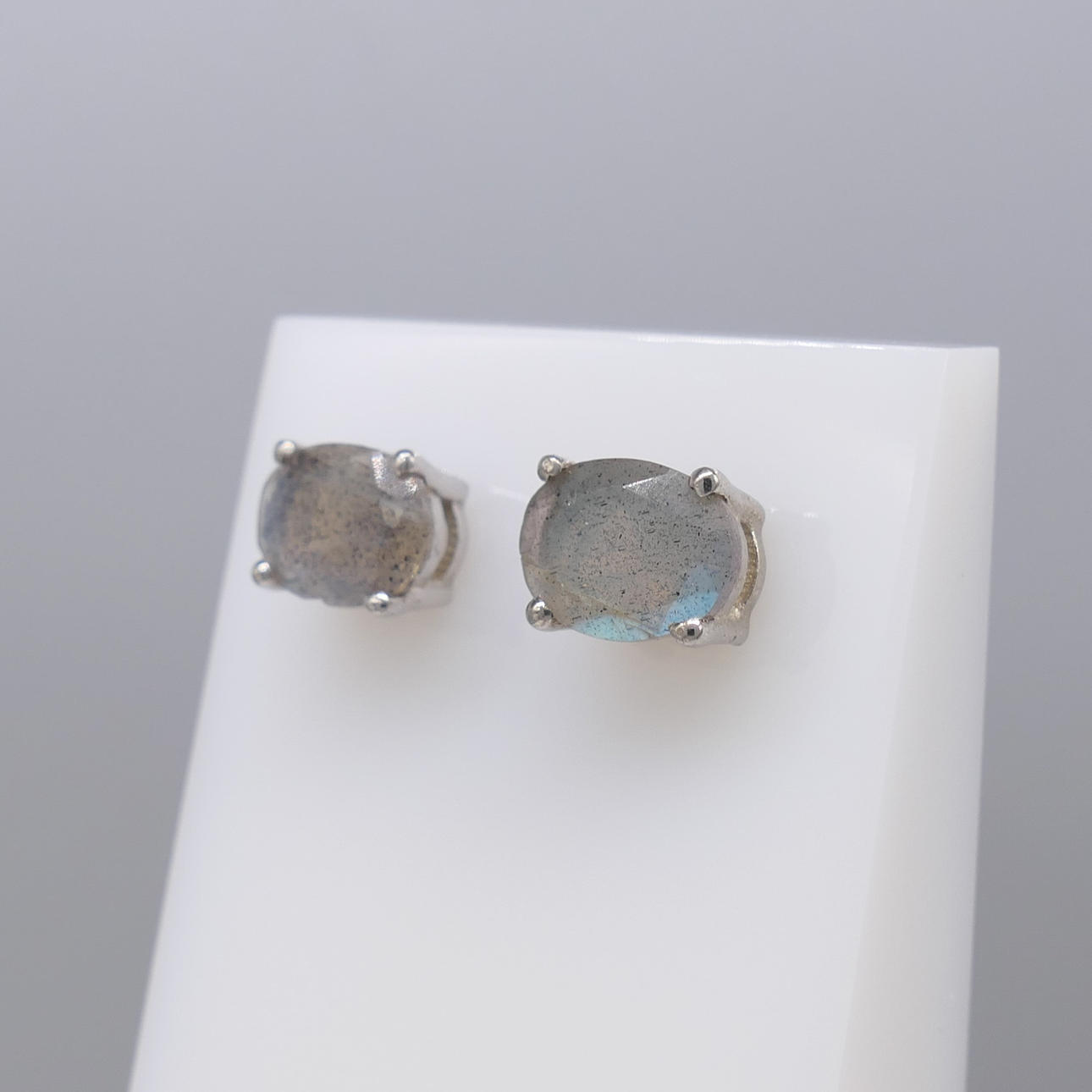 A pair of sterling silver ear studs set with oval-cut labradorite gemstones, fitted with butterfly backs.