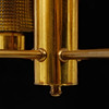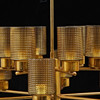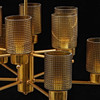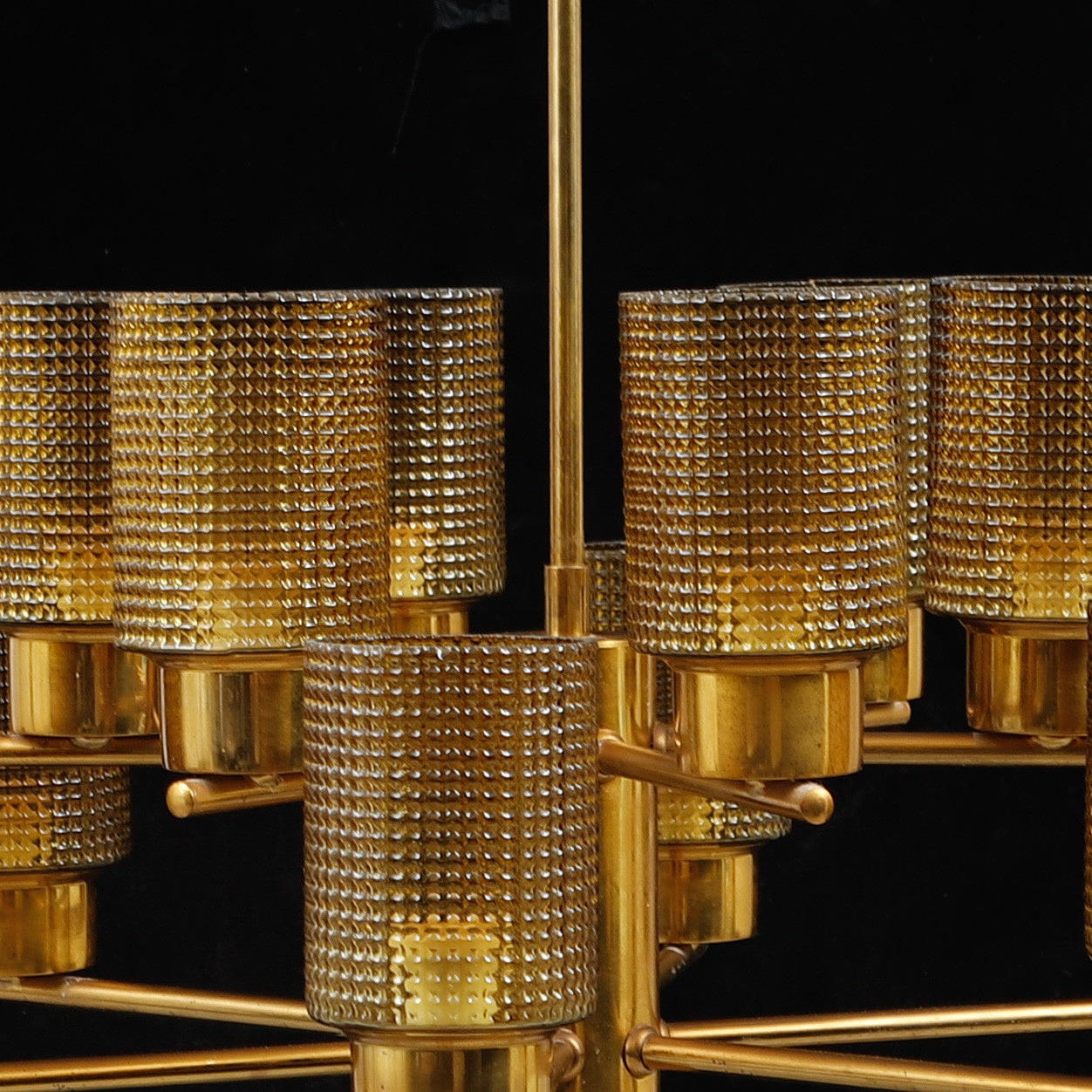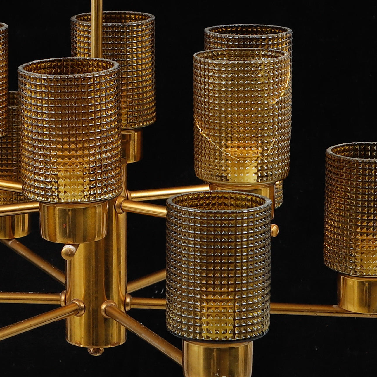 Frame in brass. 12 candlesticks with smoke-coloured glass cups. Height 60 cm, diameter 52 cm.