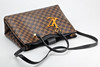 in checkerboard canvas with yellow-plated metal detailing, black suede interior with a zipped center compartment. Main compartment closed with magnetic closure. Detachable shoulder strap with carabiners. Large monogram pendant in plated metal and orange ribbed rubber (protective plastic not broken on the back of the pendant). Marked LOUIS VUITTON PARIS, made in Franve, and serial number DU4168 (year of manufacture 2018). Original box included.