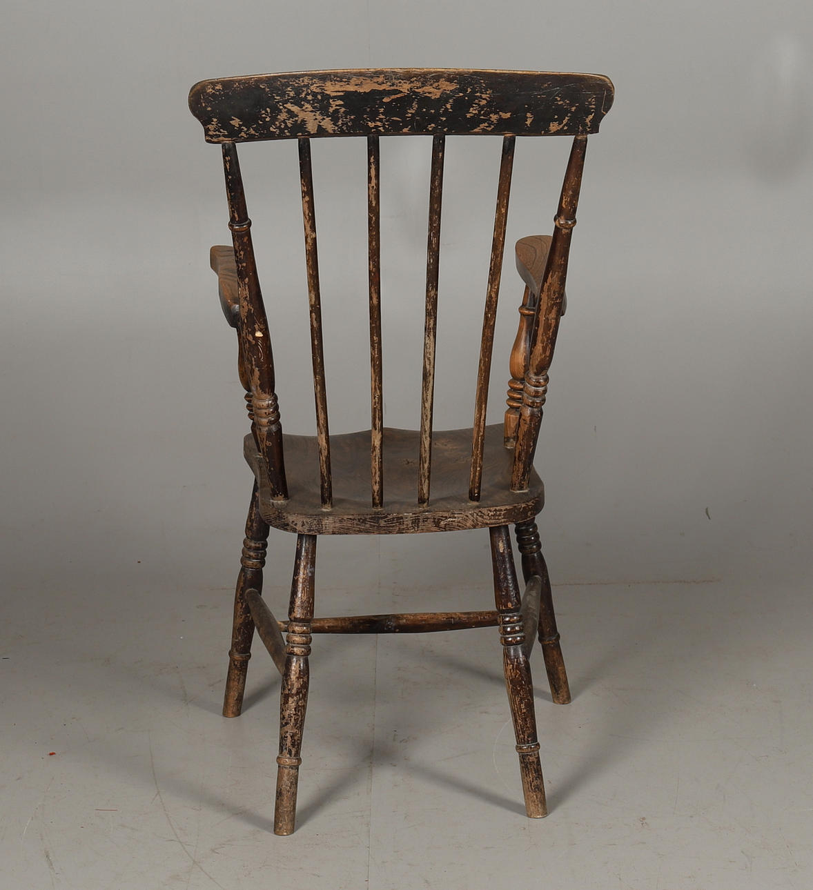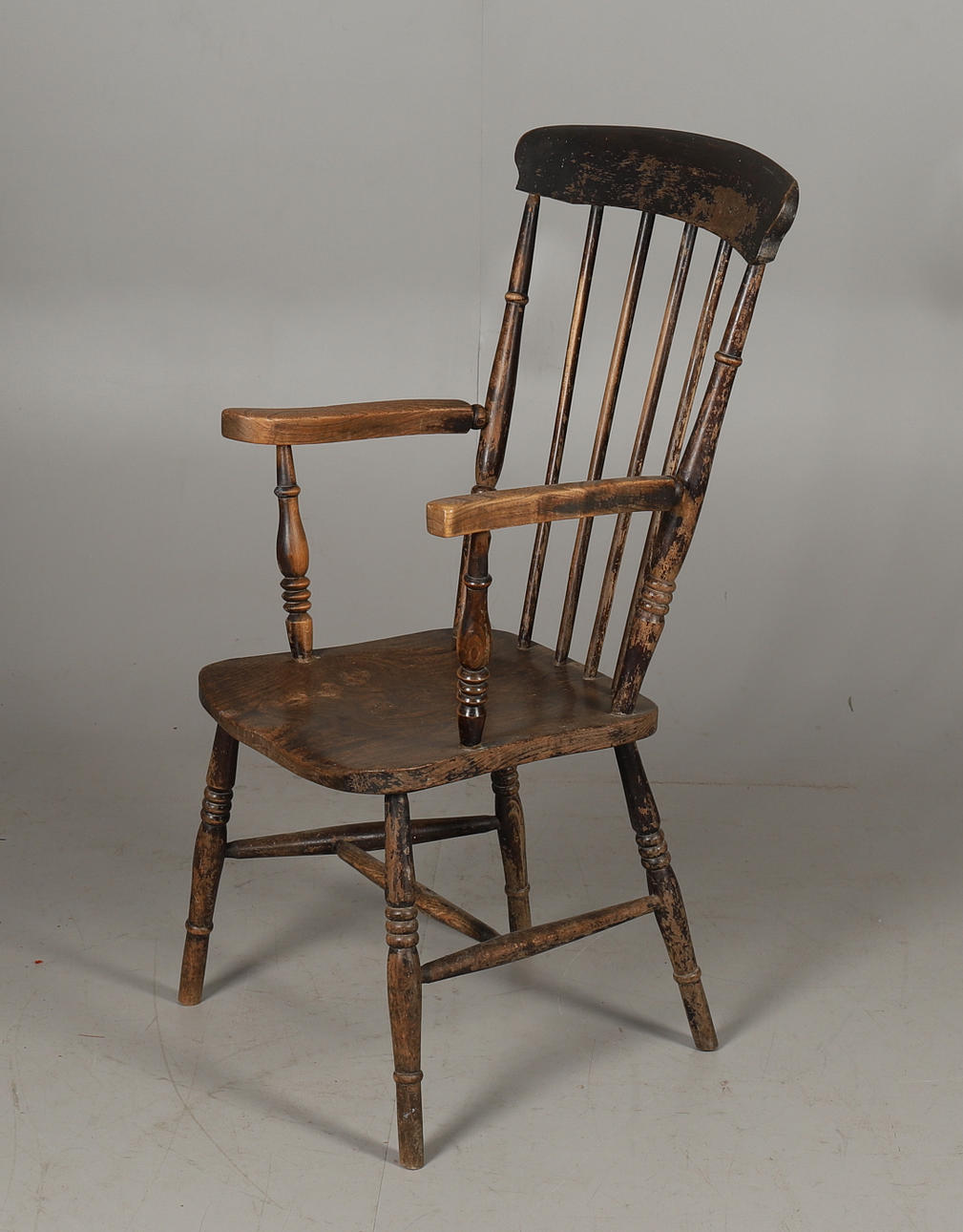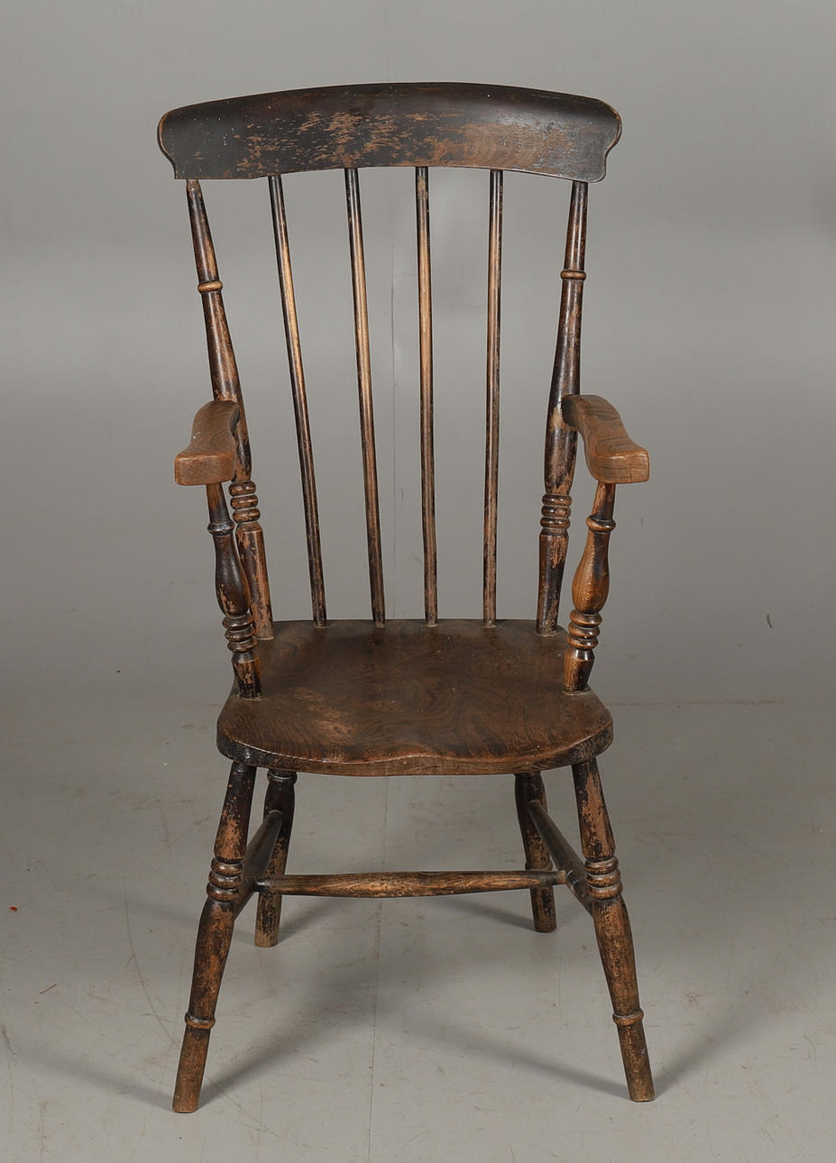 Beech frame with elm seat and arms, 106cm high x 50cm wide x 50cm deep.