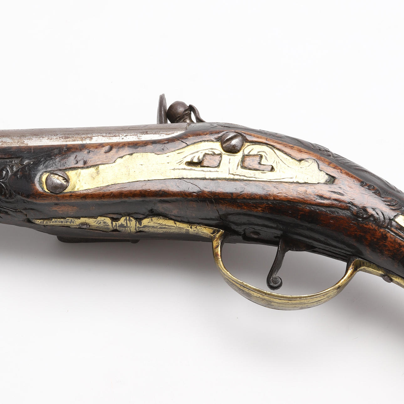 Stock with cut decoration and decorated brass fittings. Length: approx. 48 cm.