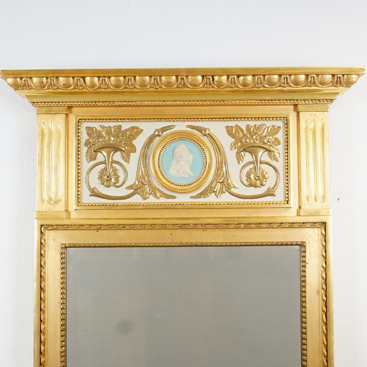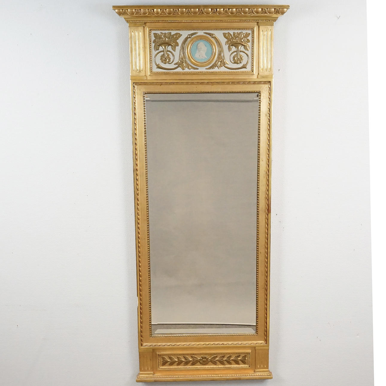 Mirror, with facet-cut glass, decoration of, among other things, pearl border, crest with portrait medallion.