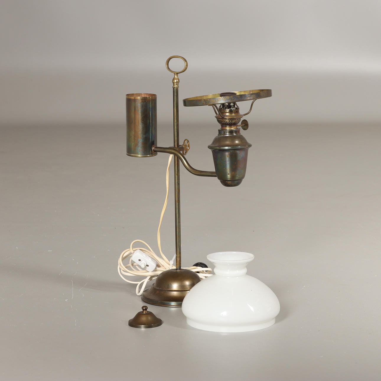 Table lamp, electrified kerosene lamp. Adjustable height. White glass cup Height approx. 50 cm Total width approx. 30 cm Foot diameter 13 cm.