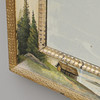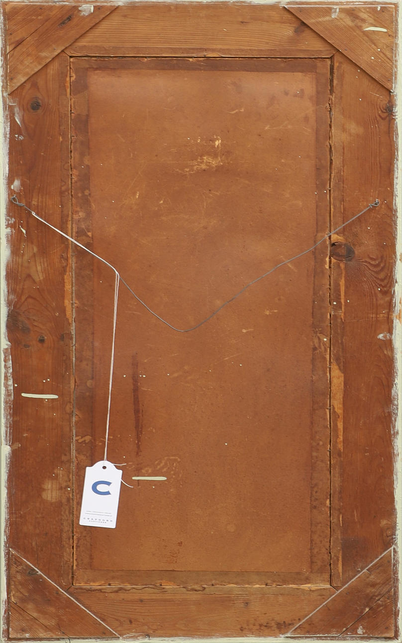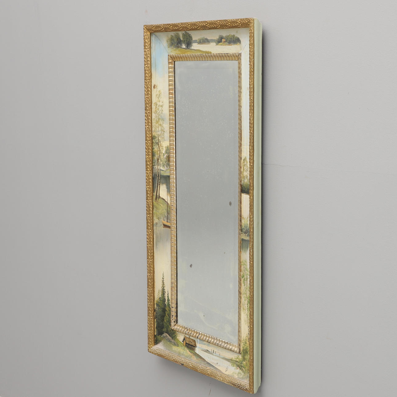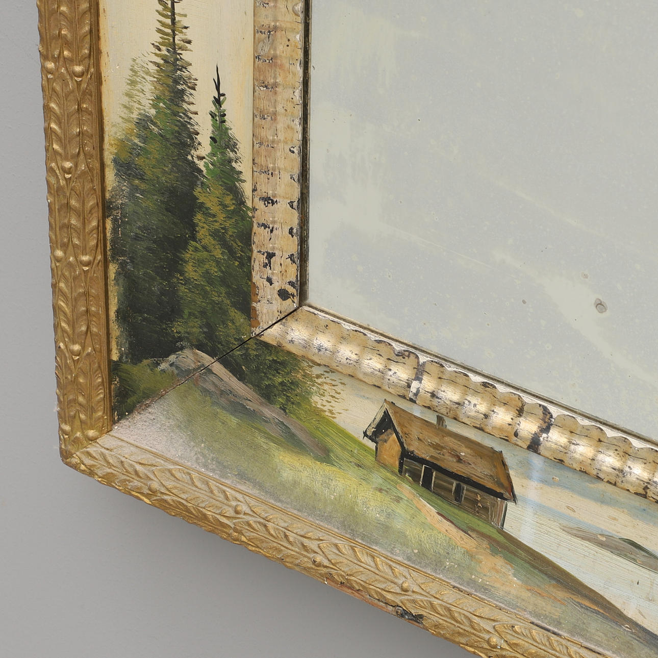 Faceted mirror glass. Decorative painted frame in the form of a landscape. 118x61 cm.