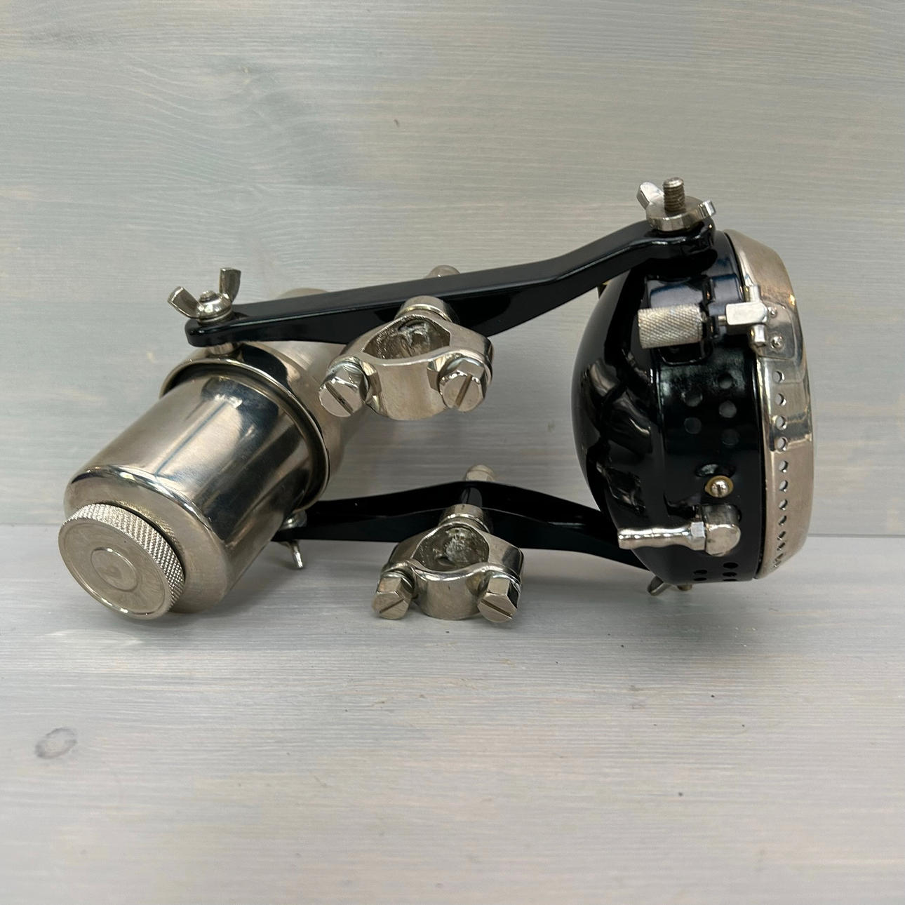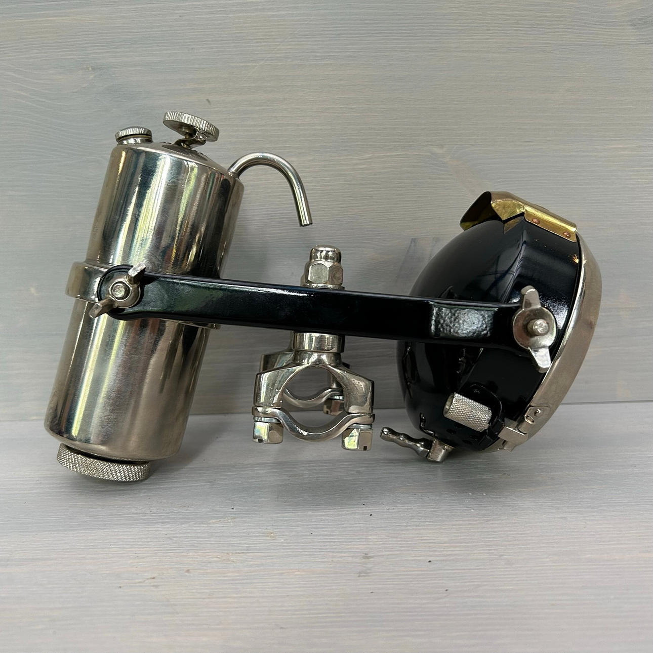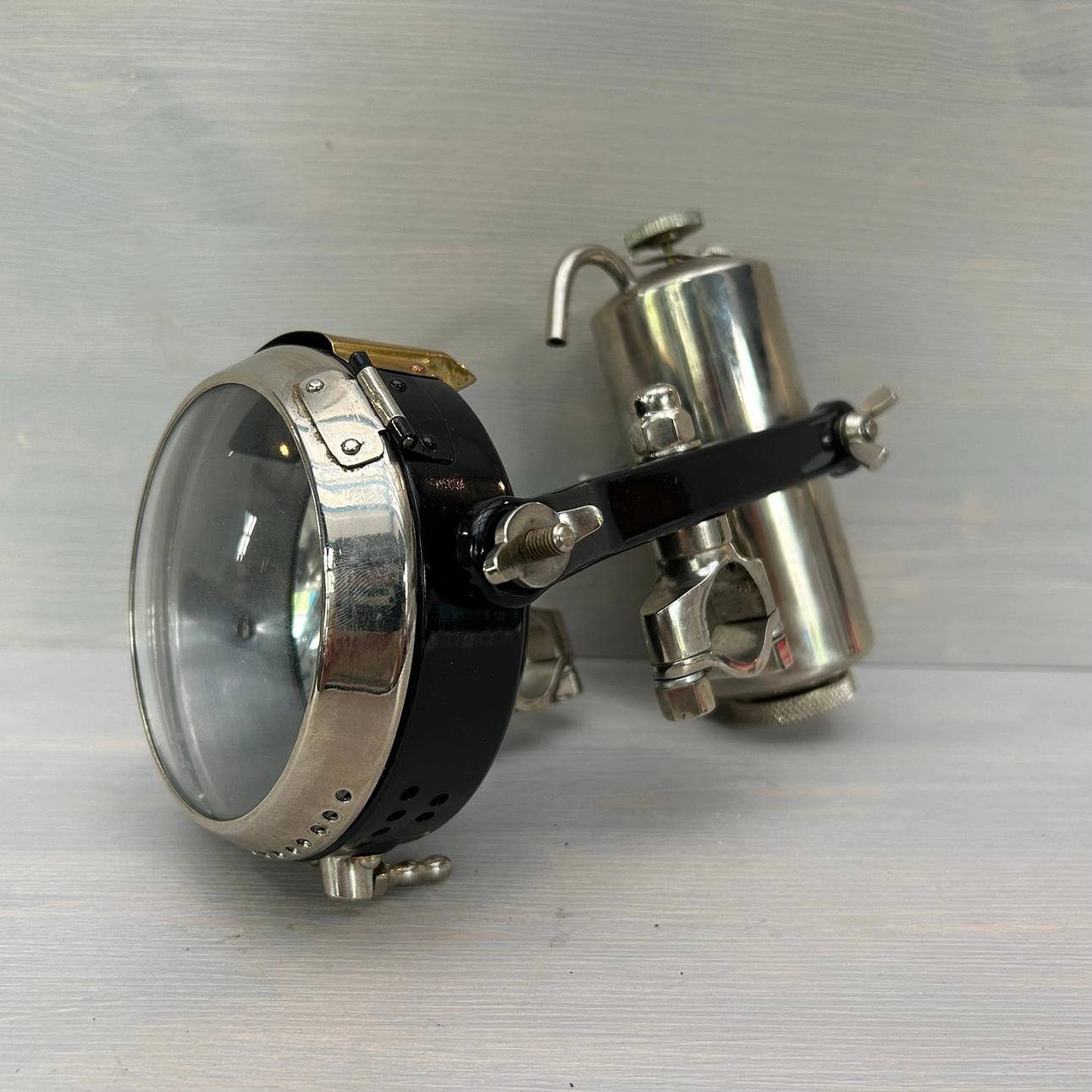 Headlight and carbide generator are new old stock. Rear light older Normal wear and tear, burner loose.