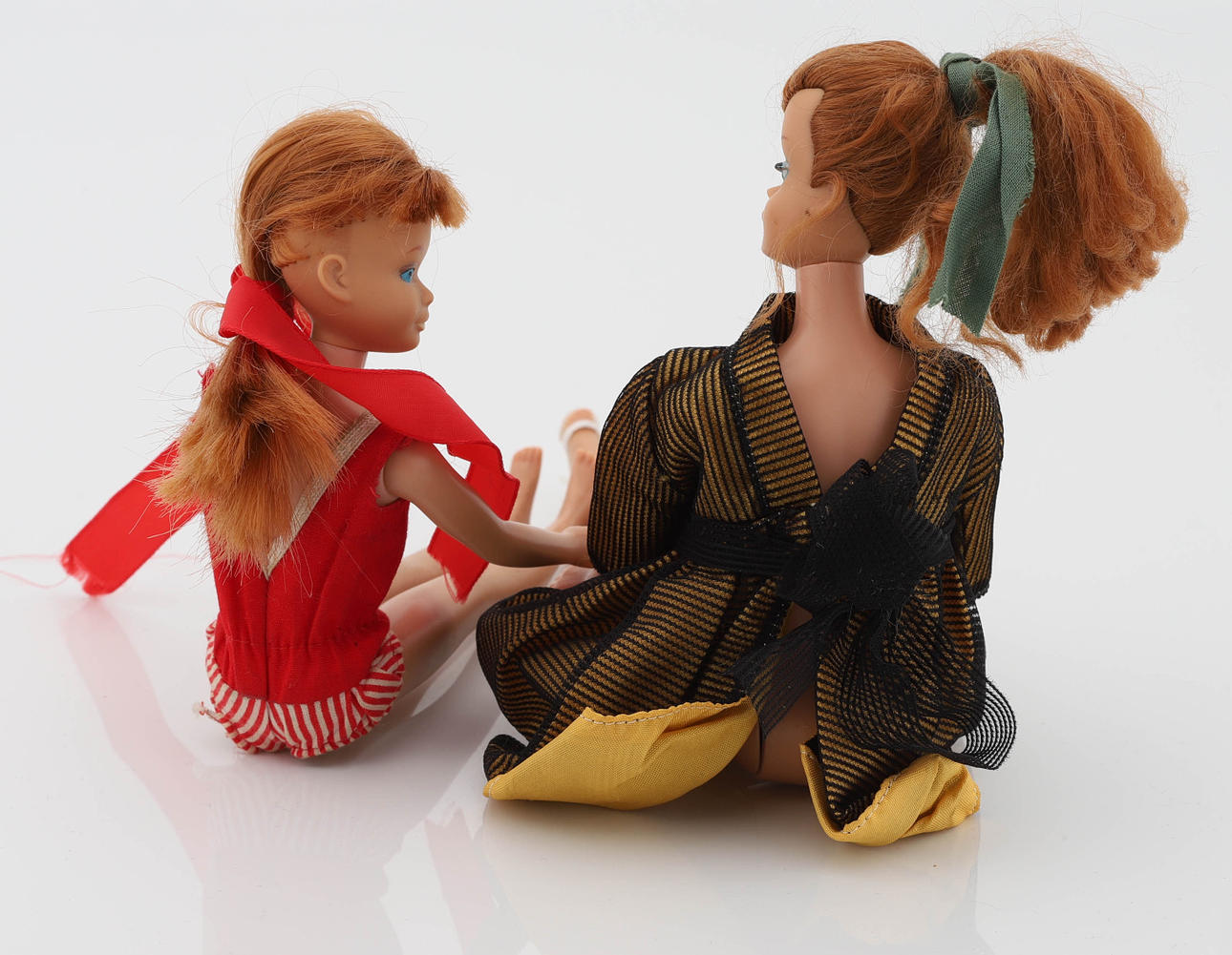 Barbie dolls, Skipper marked 1963, associated stand in original box. Midge, marked 1962. Matching clothing, shoes and bags with brochure.