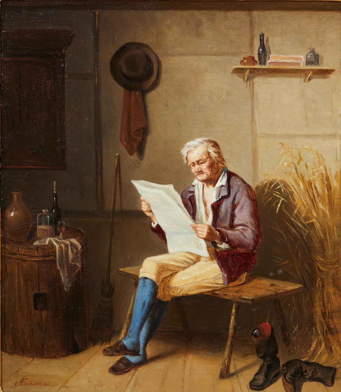 Alfred Erikson (1831-1871), painting, The Reader, 1861, oil on canvas. Depiction of an old man reading on a bench, signed and dated lower left, 46x40.5cm (70x63.5cm).