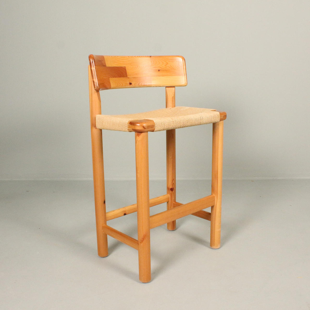 Rainer Daumiller, attributed. Bar stool, 1970s, pine wood construction with a cord weave seat, dimensions: width 53 cm, depth 50 cm, height 91 cm, seat height 65 cm.