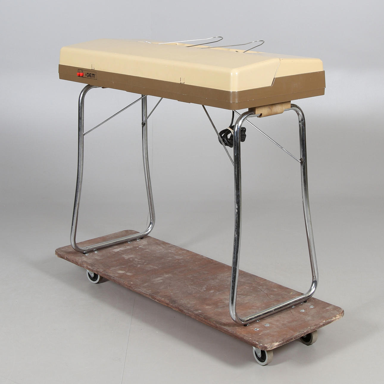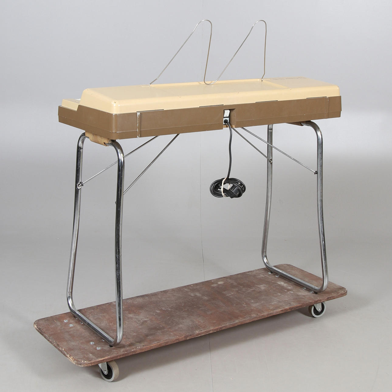 Collapsible leg support made of chromed metal. Length 95, width 42, height 85 cm.