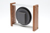 the circular dial bearing a view of the Northern Hemisphere, Arabic numerals, within a chapter ring bearing a date line and various time zones, quartz movement, the case of burnished metal, perspex and mahogany, 20cm high, 23cm wide.