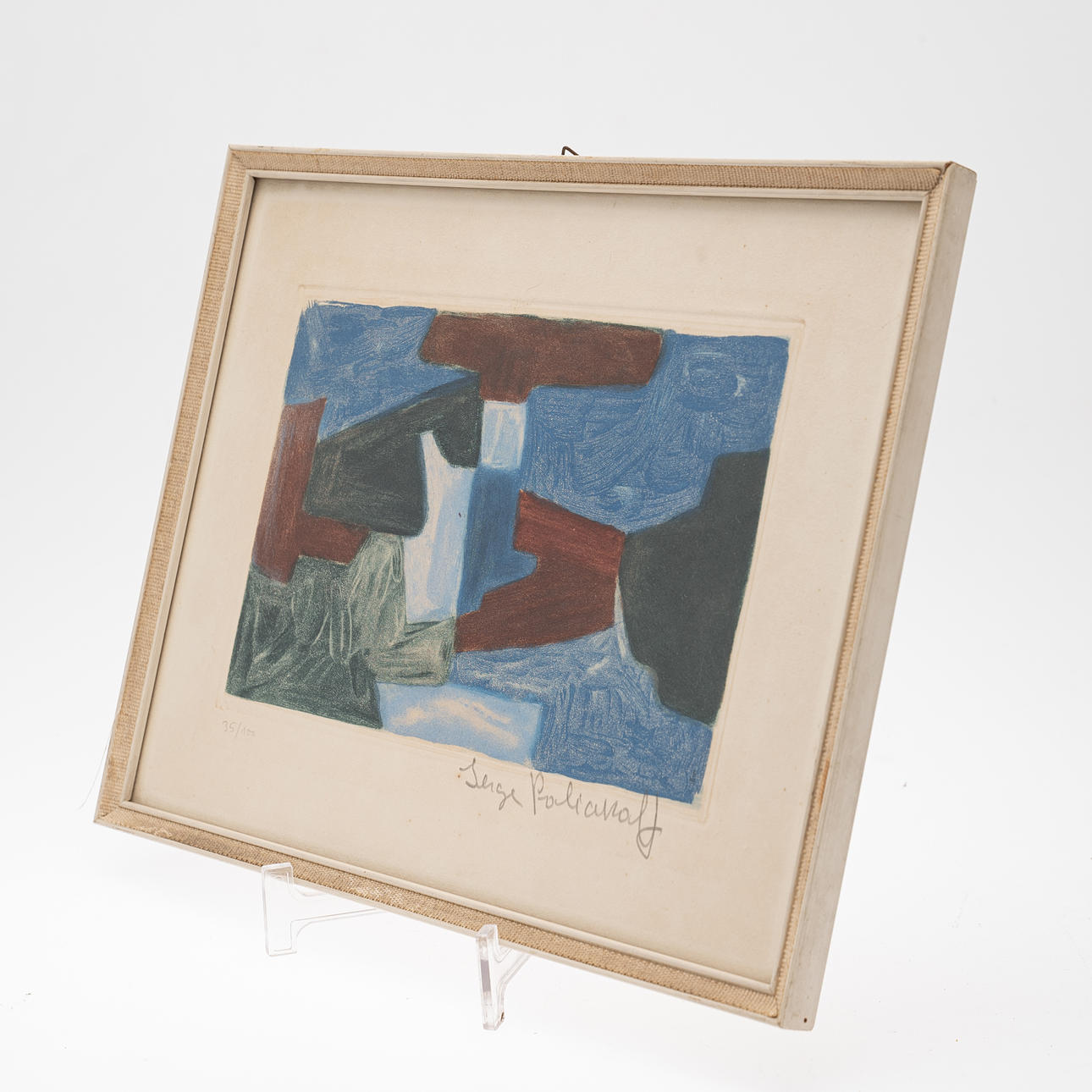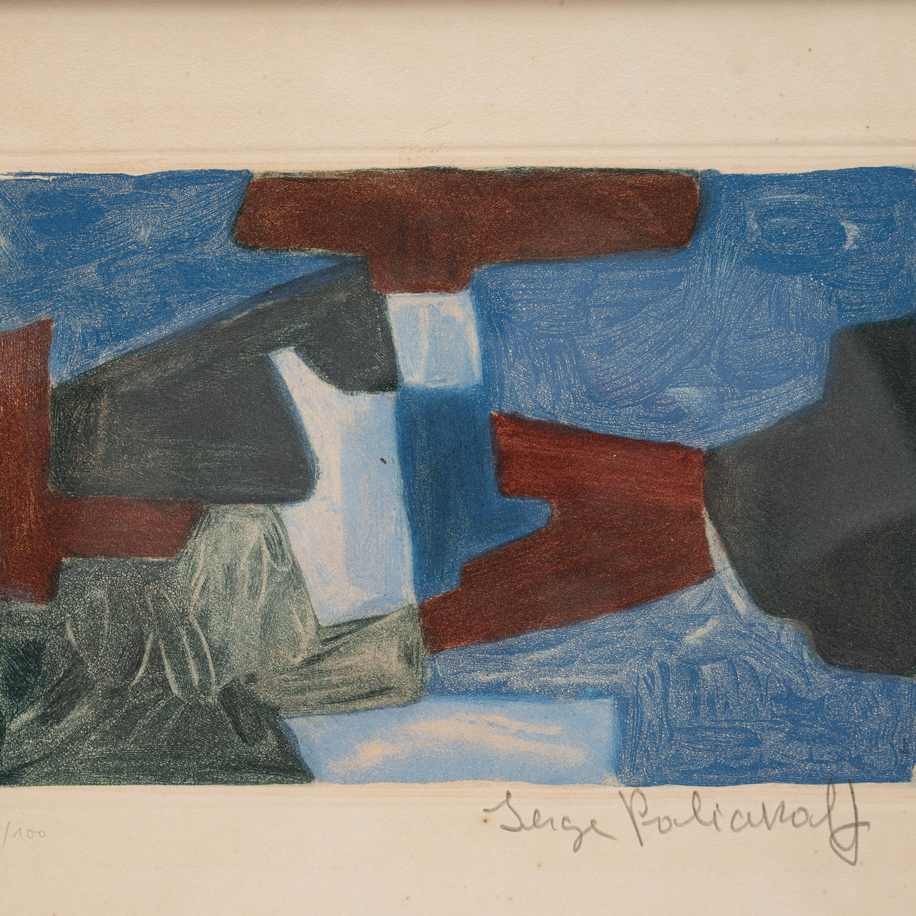 Serge Poliakoff (1900-1969), Color serigraph, Untitled. Representation in blue, green and red, with the artist's monogram on the plate, inscribed in lead as Edition '35/100' lower left and signed in lead lower right, 15.5x23.5cm (25.5x33cm).