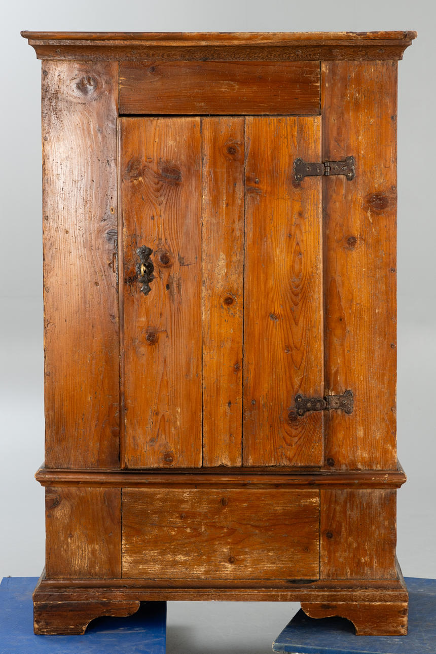 Softwood, brown glazed. Wide frame case with curved, cut feet. The highly rectangular body with a wide door and a grooved gable wreath. HxWxD: approx. 164 x 105 x 47 cm.