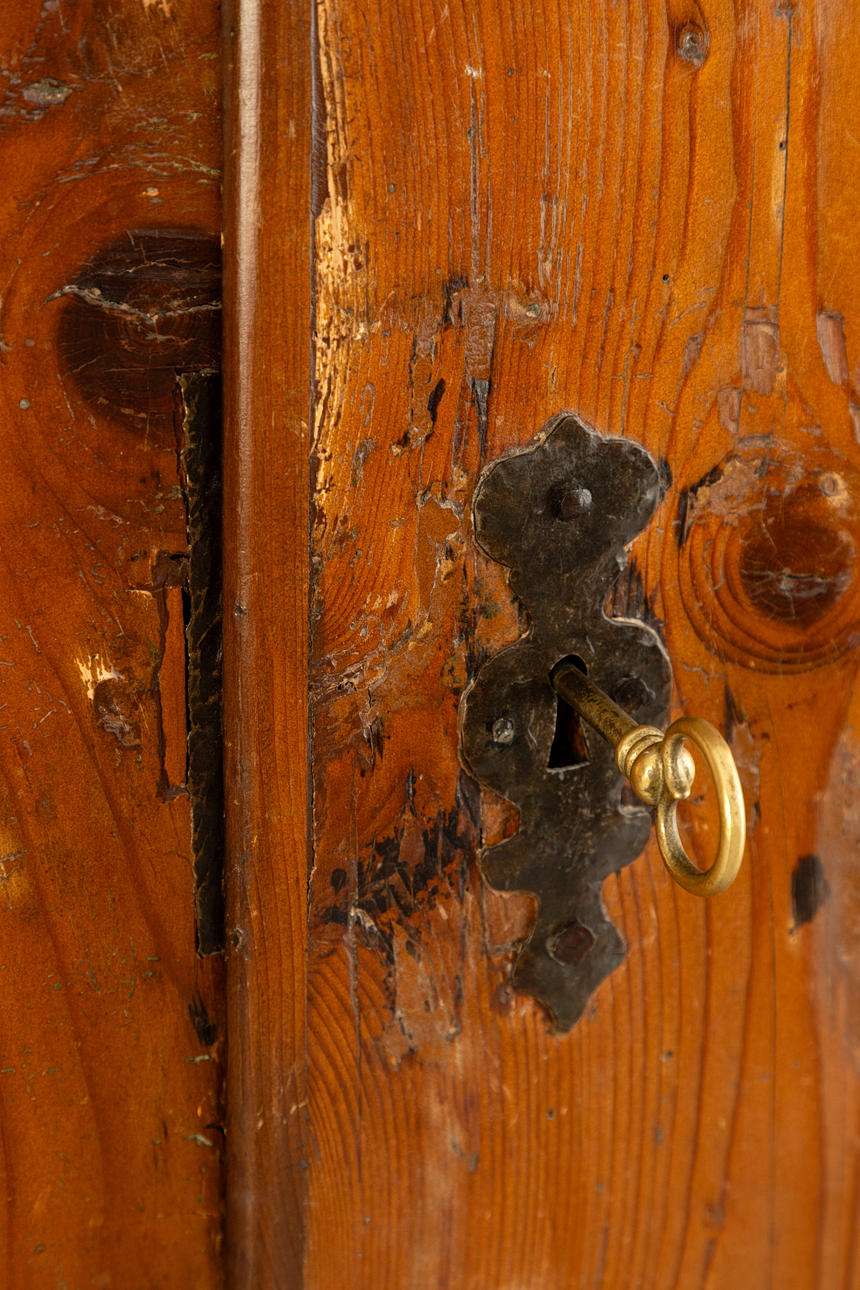 Signs of wear and tear, in some places traces of old worm damage, sometimes minor wood defects, stress cracks, rubbing and scuffing. Stains.