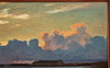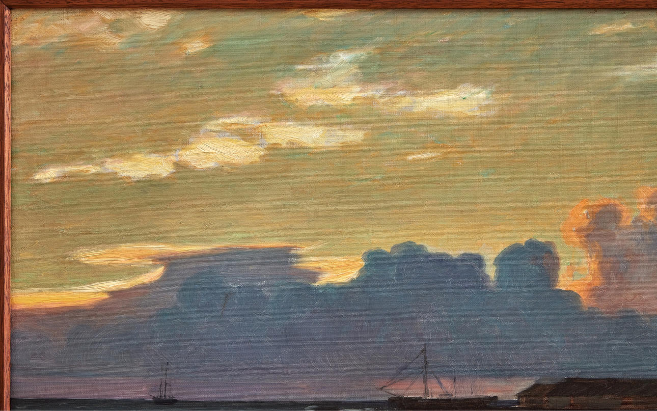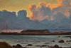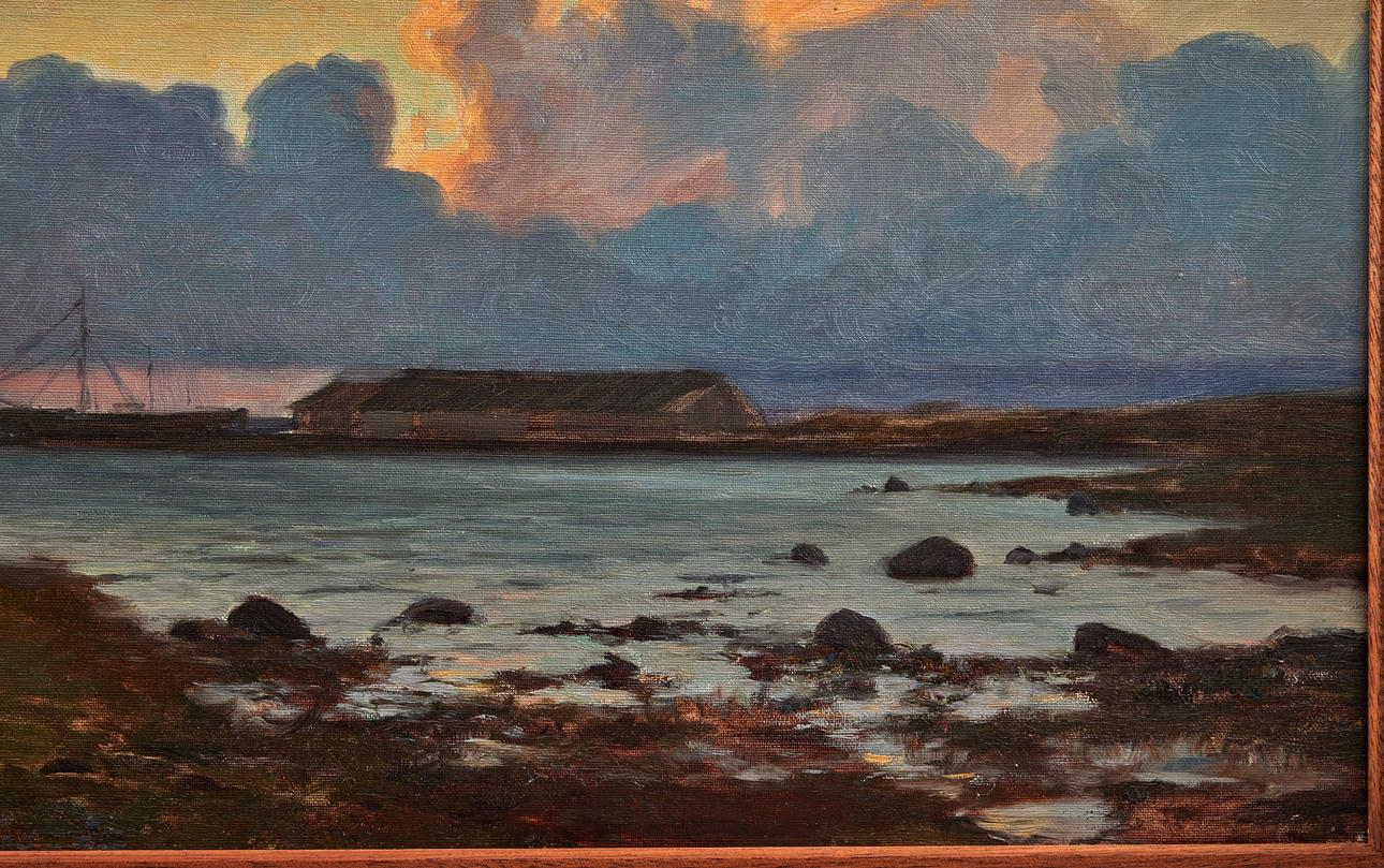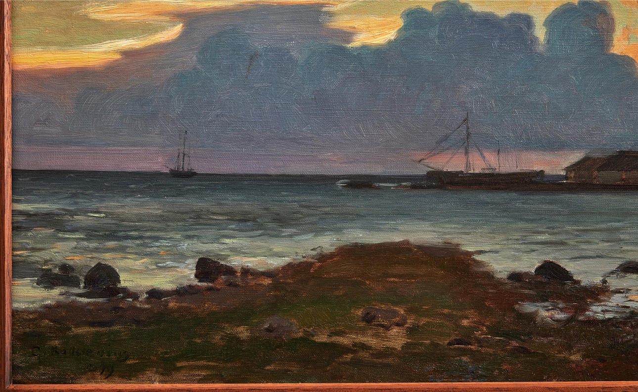 EXHIBITIONS Stockholm, Swedish Artists Association, Eighth exhibition 1900, 1900, no. 84 "Late evening by the sea (Klintehamn) Stockholm, Nordiska Bokhandeln, Gottfrid Kallstenius, 21 April-21 May 1922, no. 5 "Klintehamn 1899" In the summer of 1899, Kallstenius together with his wife and their seven-year-old son rented a house in Klintehamn on Gotland, from the locally practicing doctor Carl Wilhelm Herlitz. According to some sources, the well-known art historian Johnny Roosval (1869-1965), brother of Gerda Roosval-Kallstenius, stayed in Klintehamn at the same time. Kallstenius executed several paintings in Kintehamn. There he began the studies for the work "The Master Comes", completed only several years later, to which the local population were models. On the basis of a sketch made during this stay, in 1900 he executed his famous painting "Moonlight Night. Motif from Klinte, Gotland" (Nationalmuseum NM 1551; occasionally deposited at Gotlands Museum).