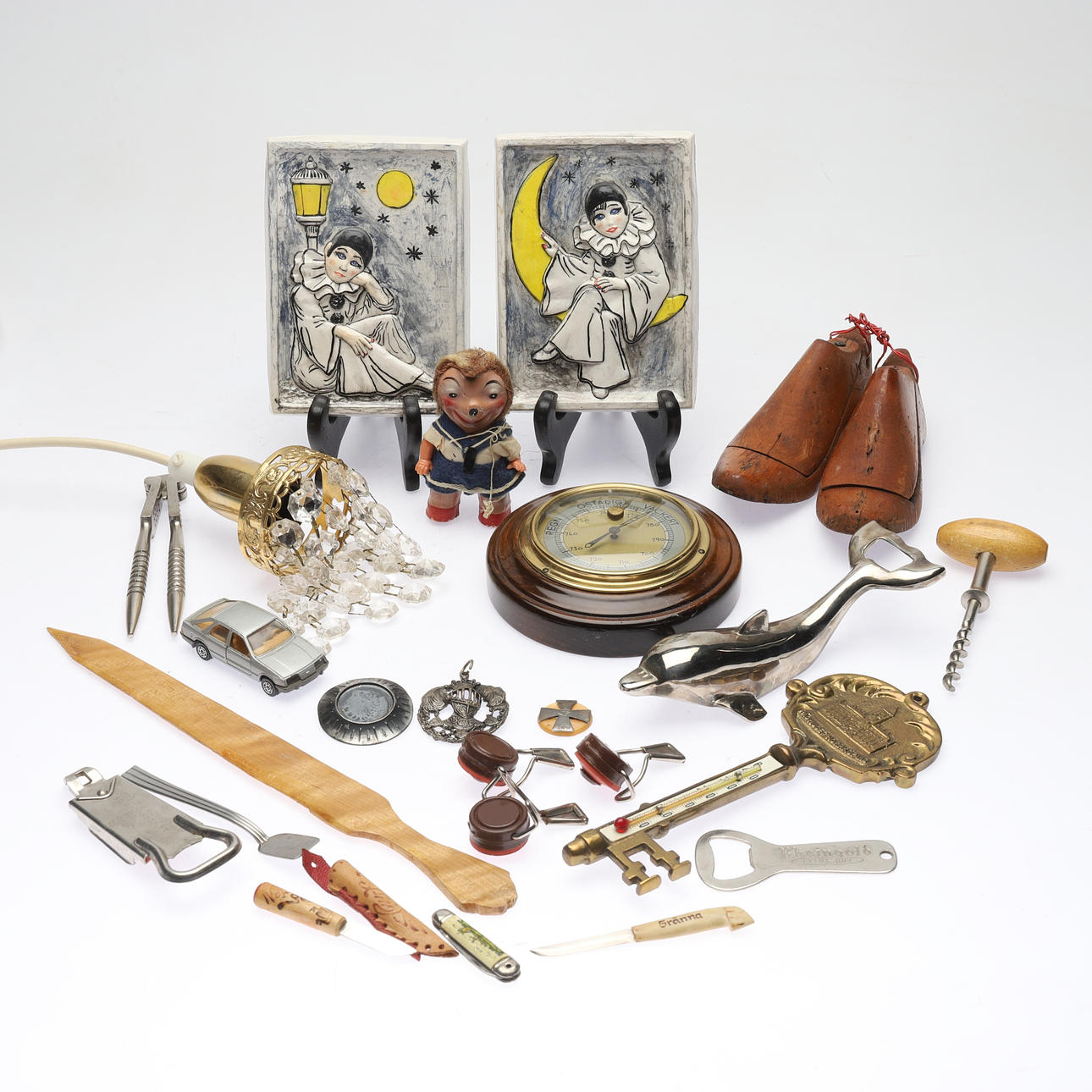 Various objects, i.a. corkscrews and miniature knives, bottle/capsule opener and barometer. Toy animal in the shape of a hedgehog, possibly Steiff.