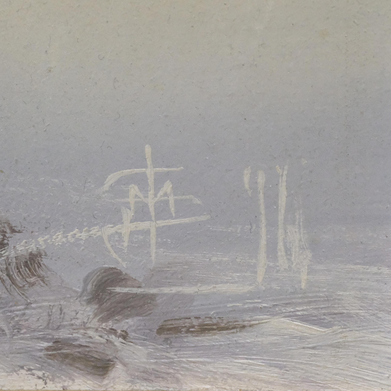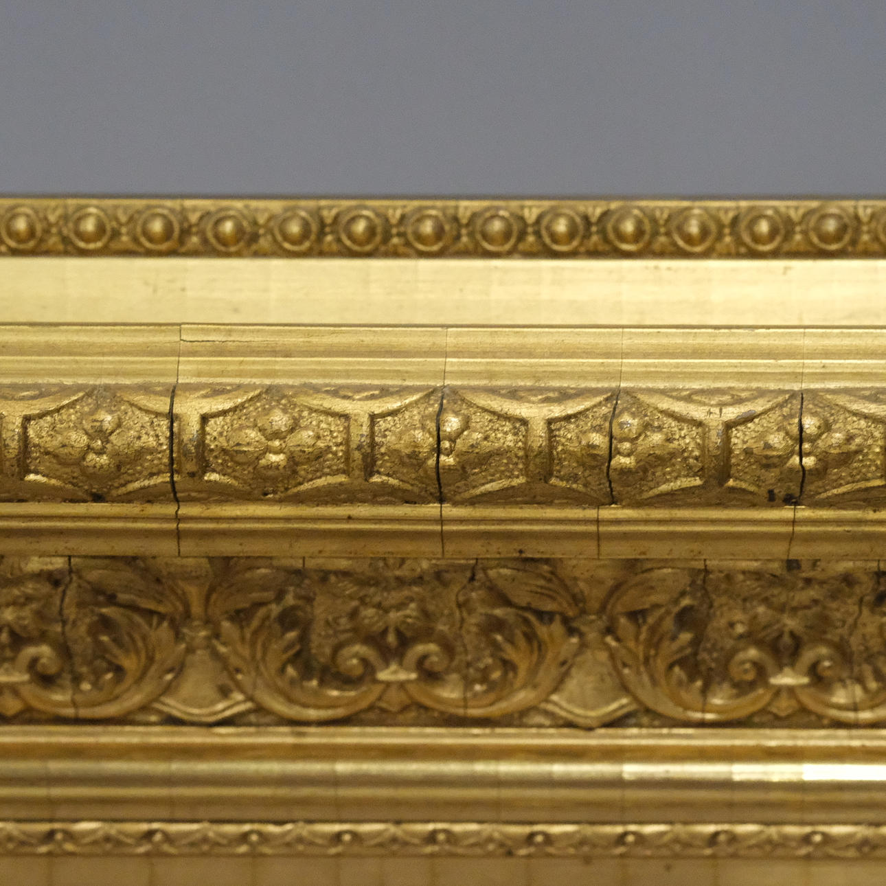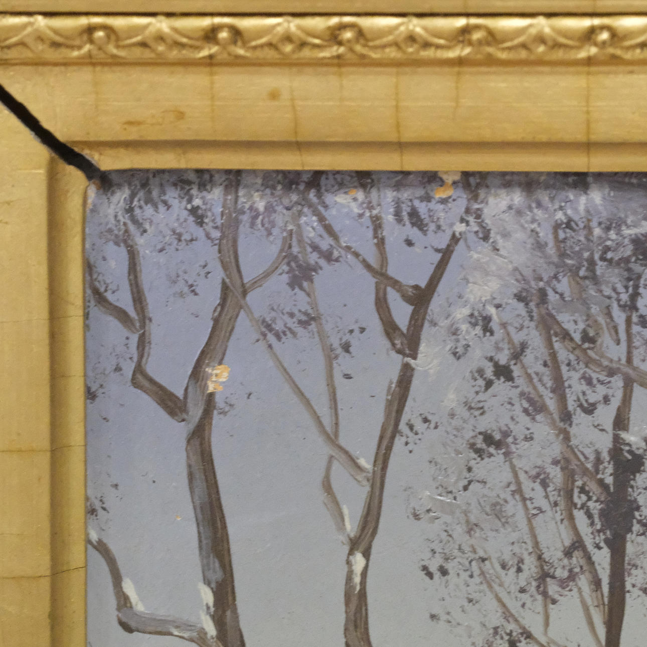 Minor paint loss, frame with veneer damage and cracking.