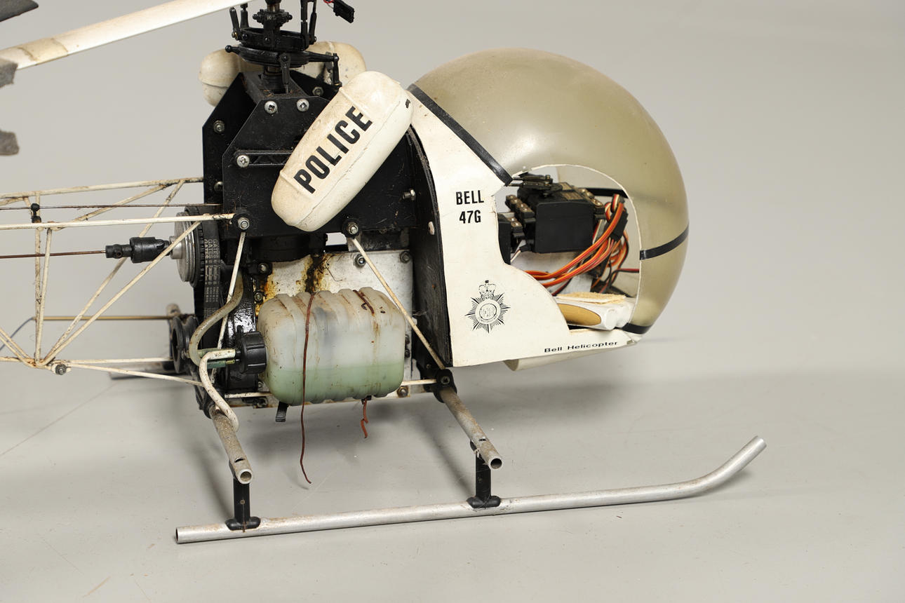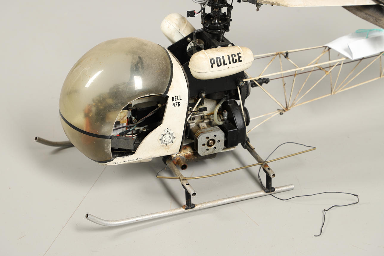 A large remote controlled model of a Bell 47G helicopter, fitted with a petrol engine. 118cms long.