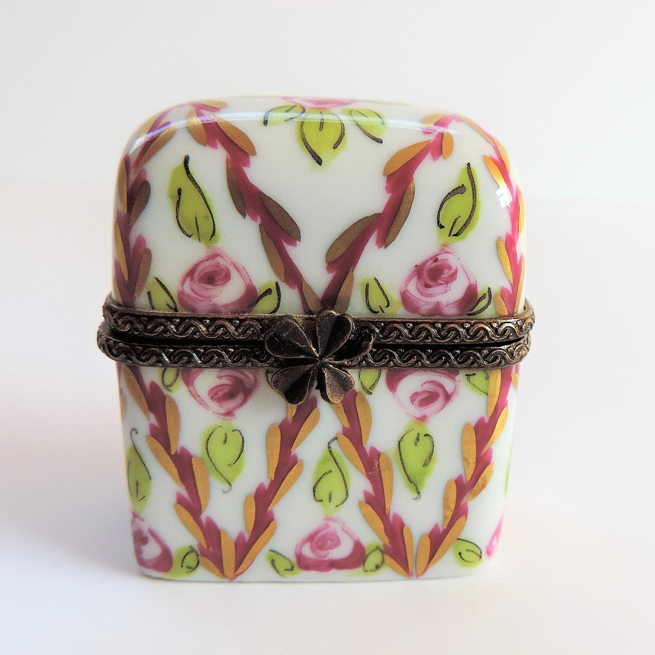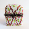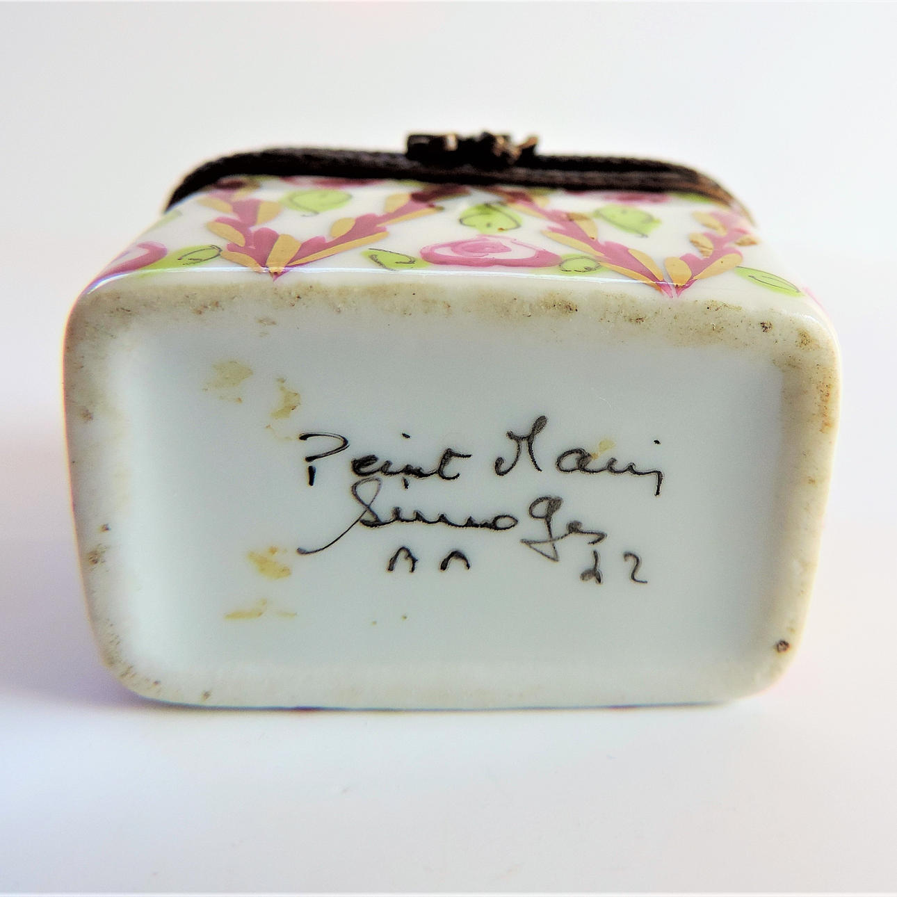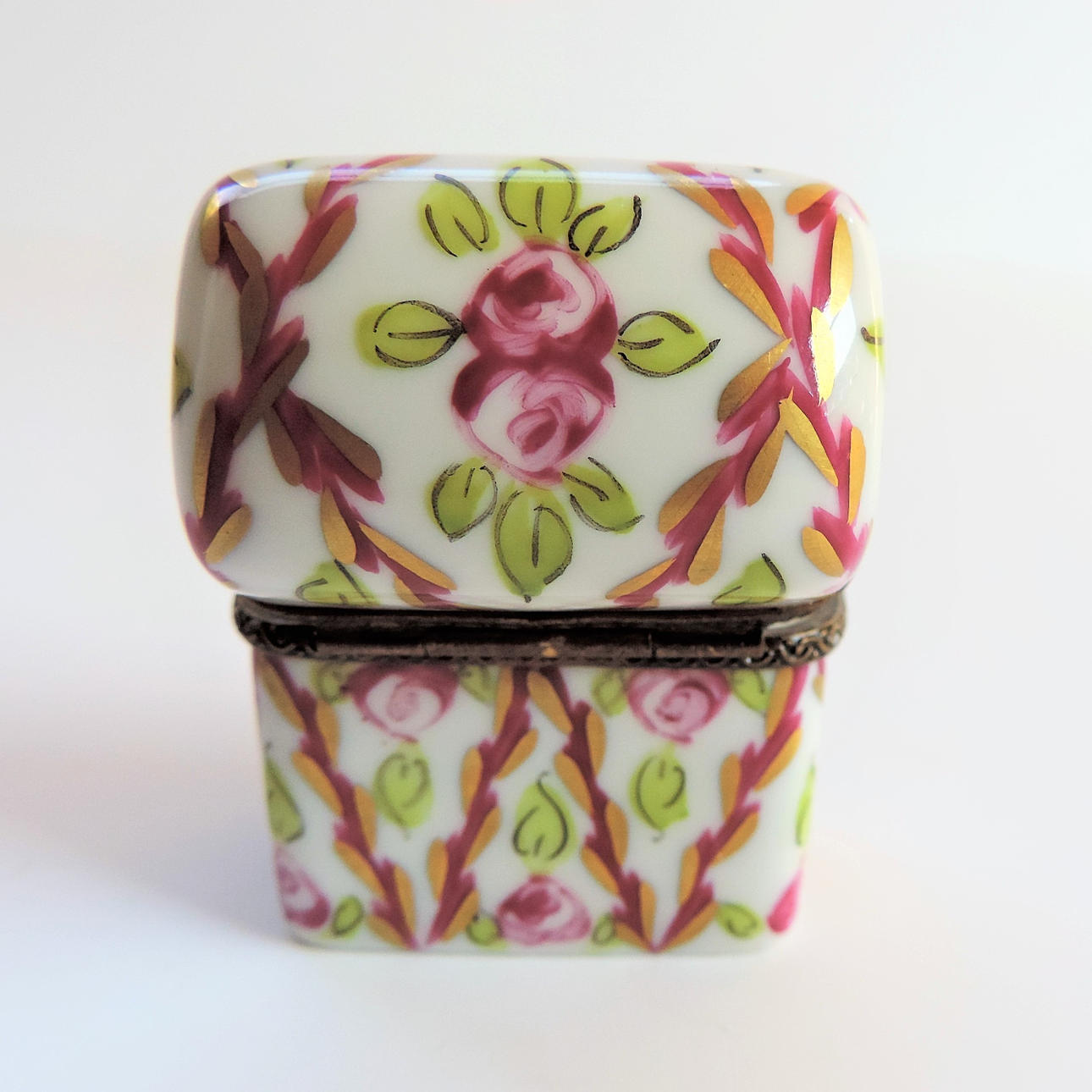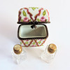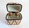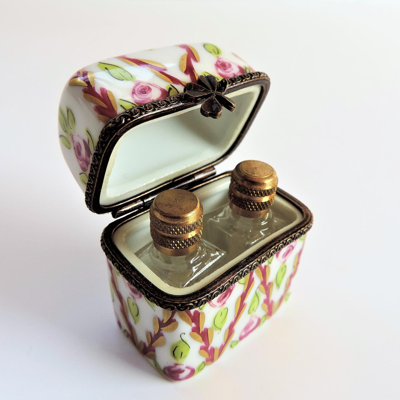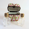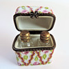 A Limoges perfume box crafted from the finest porcelain in Limoges France by traditional methods. Each box is meticulously hand painted by skilled artists and has a distinctive metal decorative mount. The box has two miniature glass perfume bottles with brass tops. The box measures 5cm high and 4cm long and box and bottles are in excellent condition with no chips or cracks.