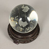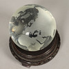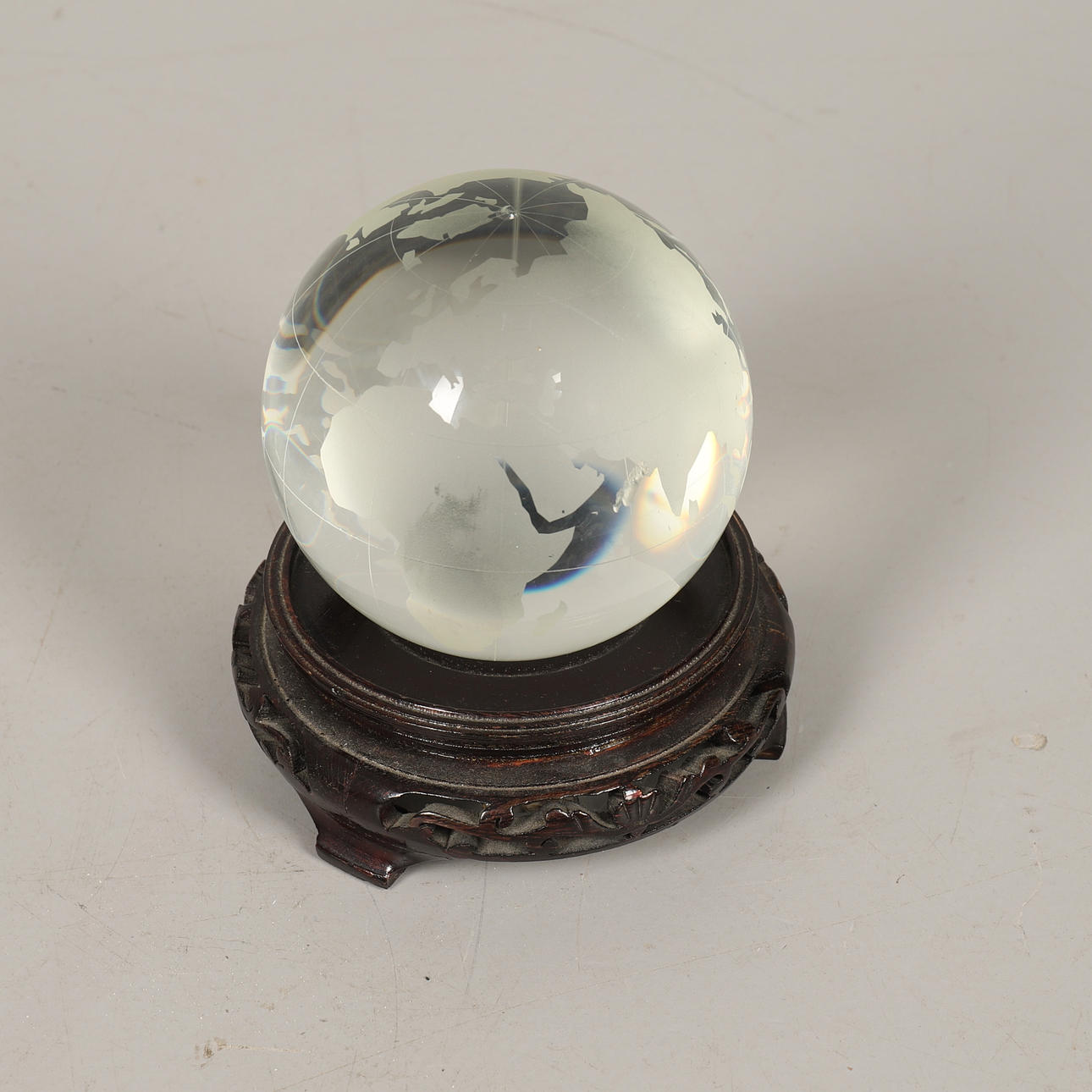 An etched glass globe on associated carved stand, 13cm diameter.