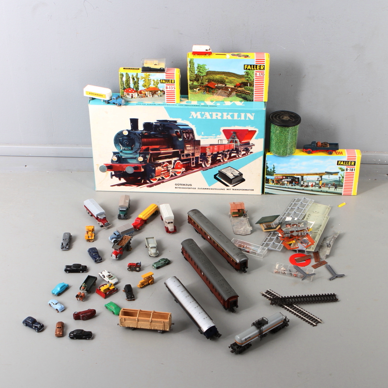 304618. MODEL TRAIN MÄRKLIN train set 2966, WIKING cars, LIMA wagons, FALLER houses and more. Partly in original boxes.