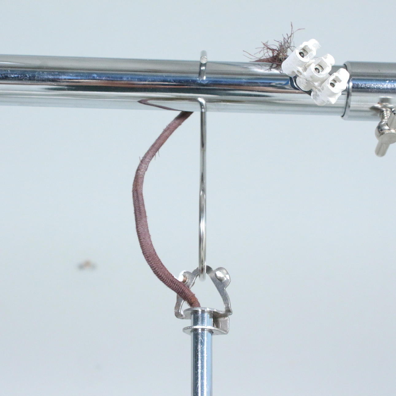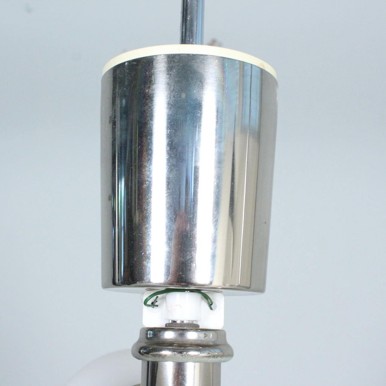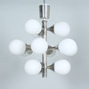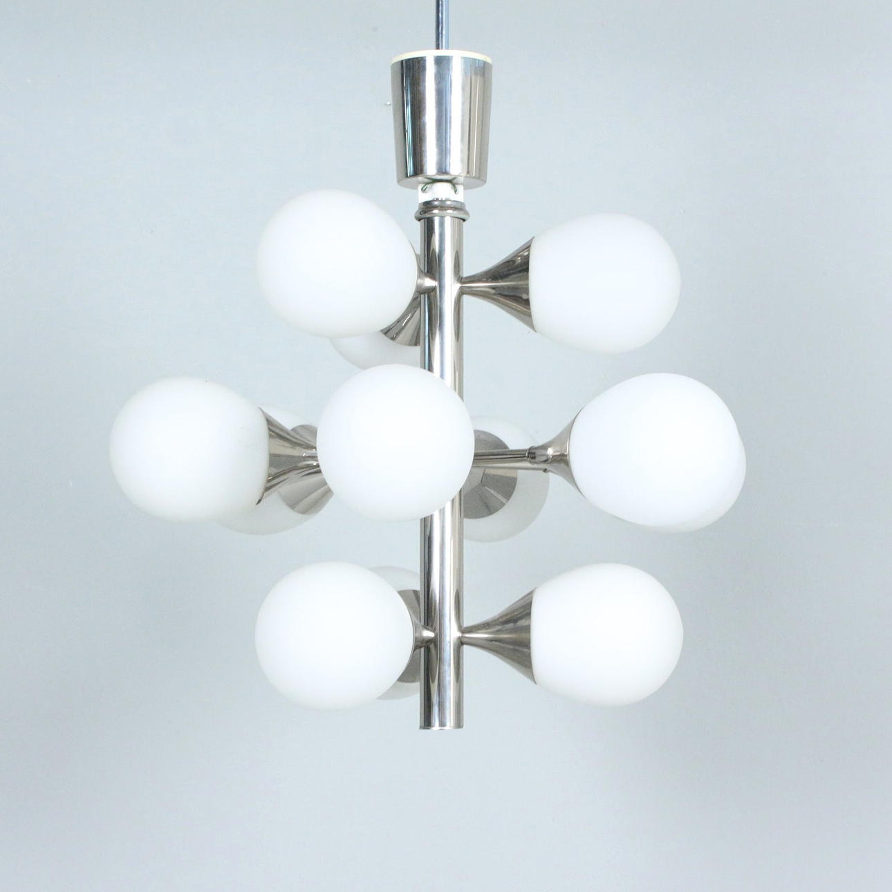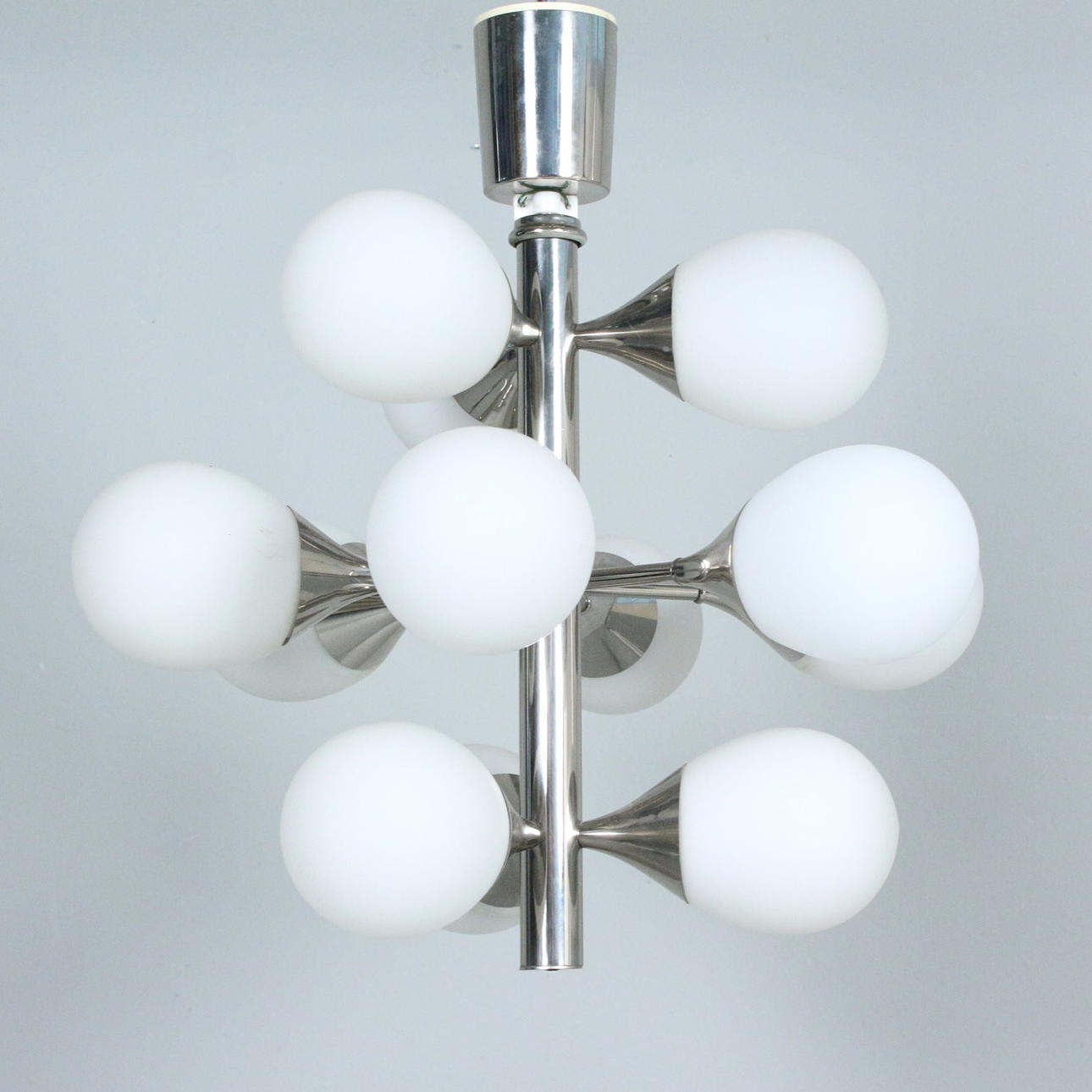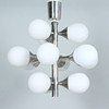 Kaiser, Space Age ceiling light 'Sputnik', chrome-plated metal, glass lampshades, equipped with 12 lamp holders, dimensions approx.: H. 55 cm, Ø 43 cm.