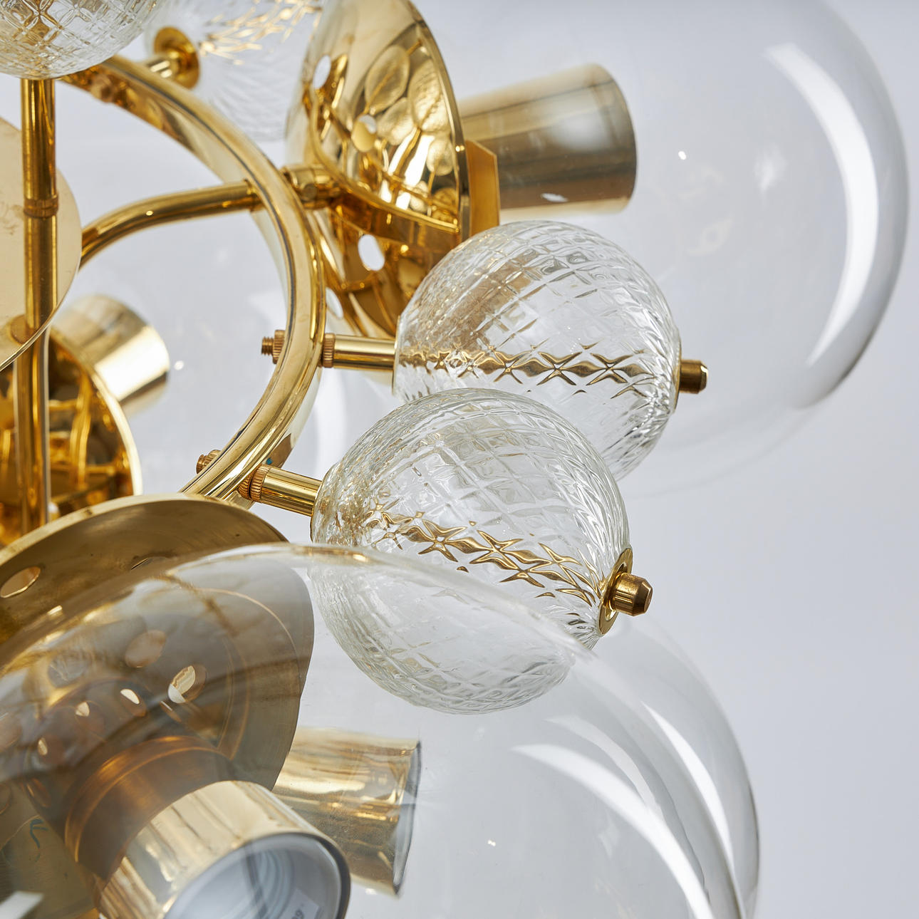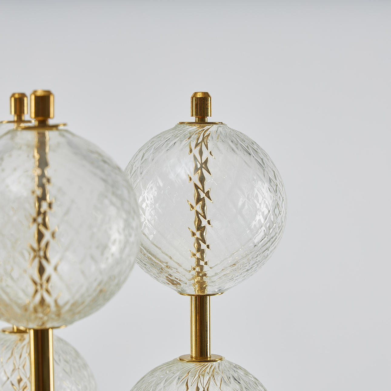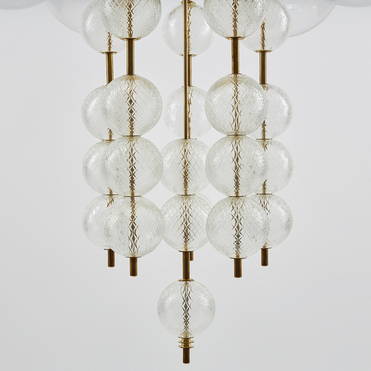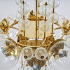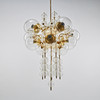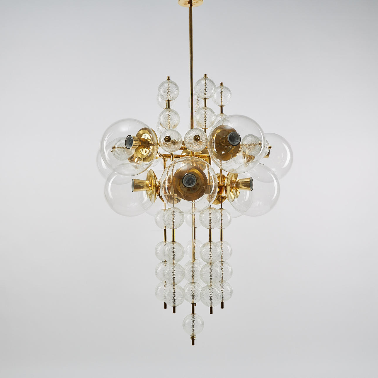 Brass frame, domes of optically blown clear glass, ten light points. Diameter 85 cm. Height 145 cm.