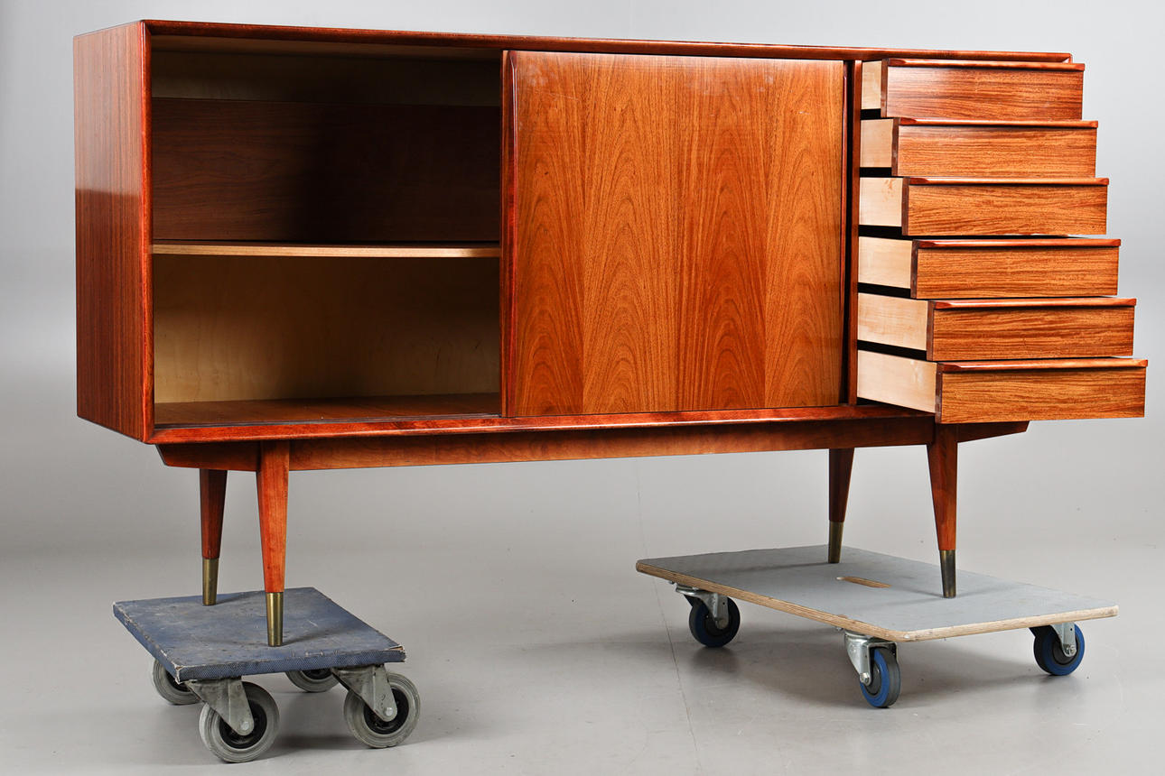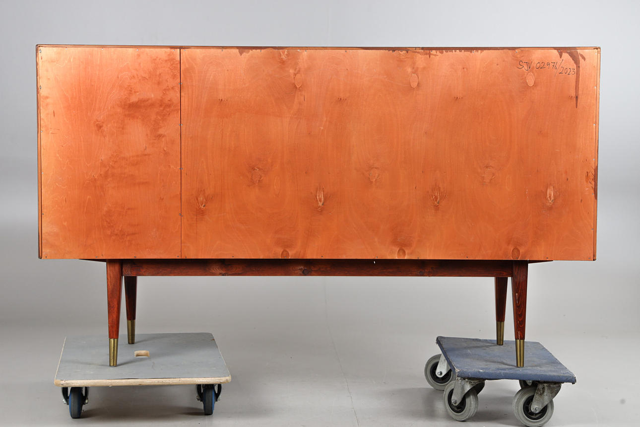 Sliding doors and drawers. Veneered in Rio rosewood (Dalbergia Nigra). Legs, edges etc. in bound book. Brass-clad legs at the bottom. H approx. 96 cm. 165 x 46 cm.