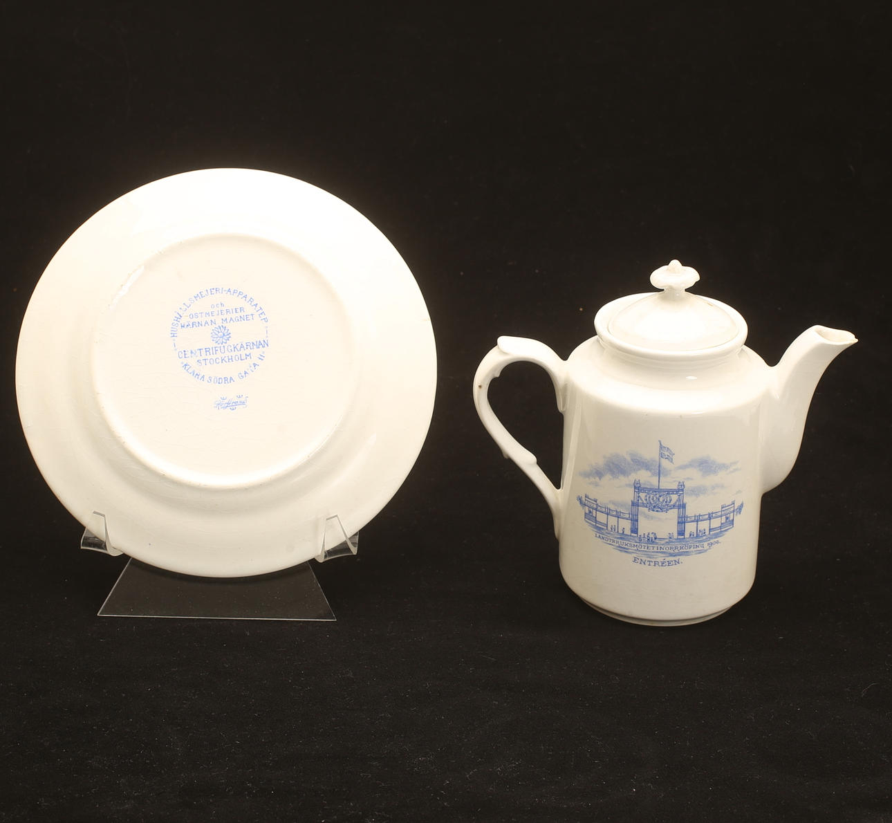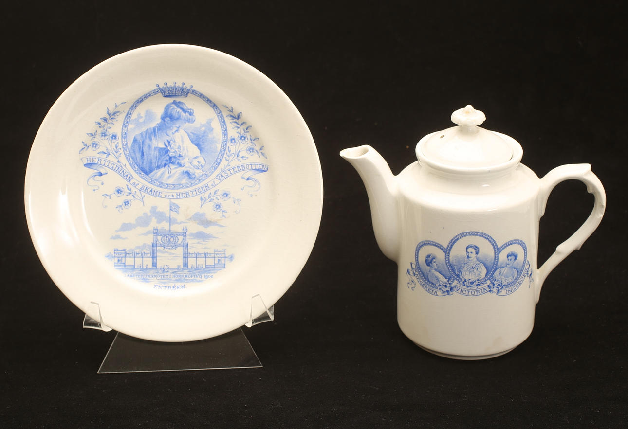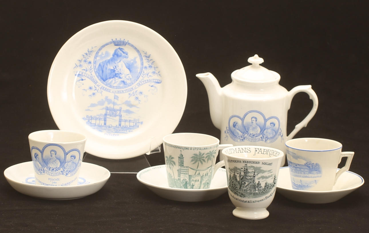 Commemorative porcelain from various exhibitions; "Agricultural meeting in Norrköping 1906" (Cup with saucer, jug with cover, and plate), #Remembrance from the Scandinavian coffee processing company's serving pavilion at the exhibition in Stockholm 1897", (cup with saucer), "Hultman's factories, the Art and Industry Exhibition in Stockholm 1897 " (cup), "Militärförläggingen iArkösund" (cup with saucer).