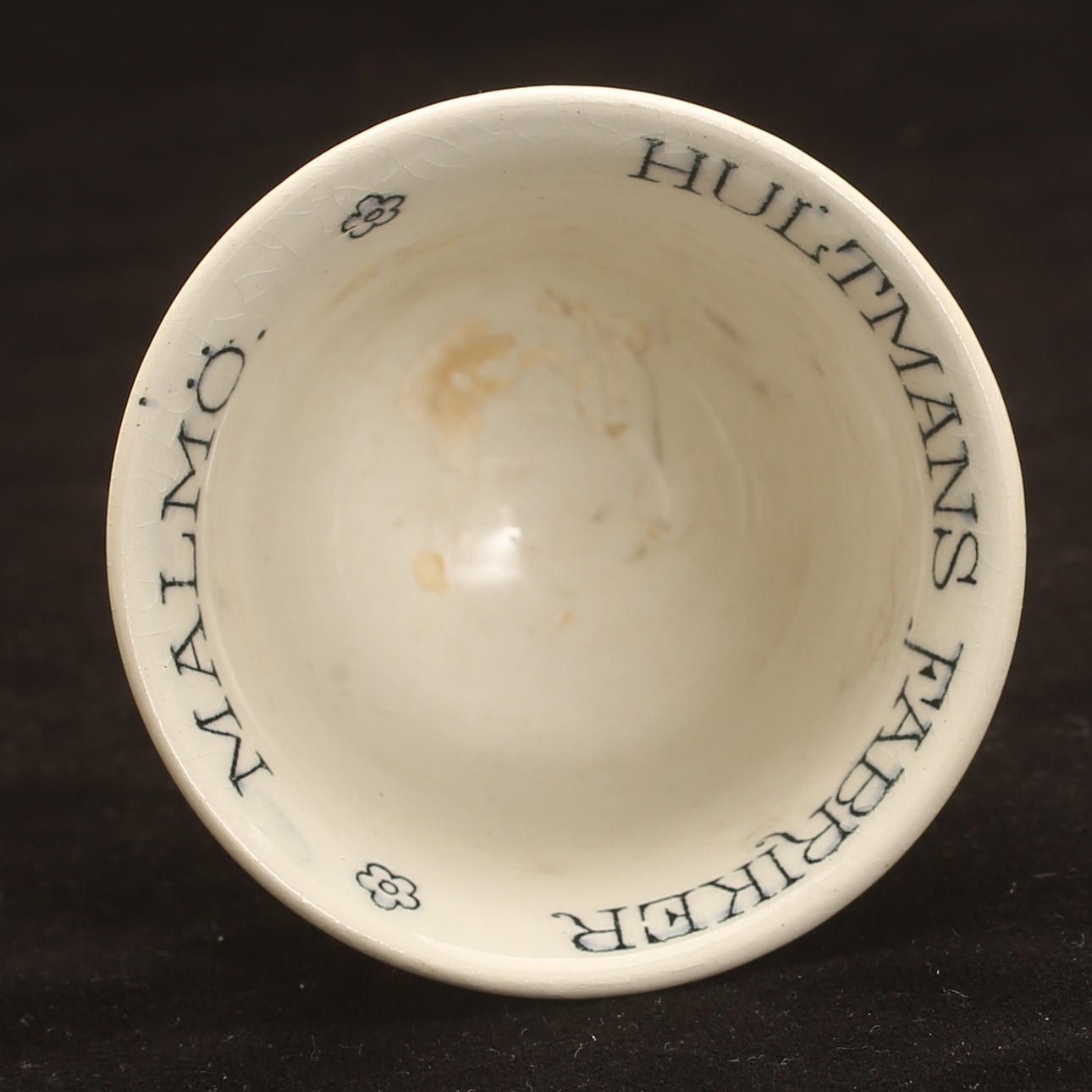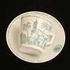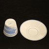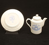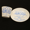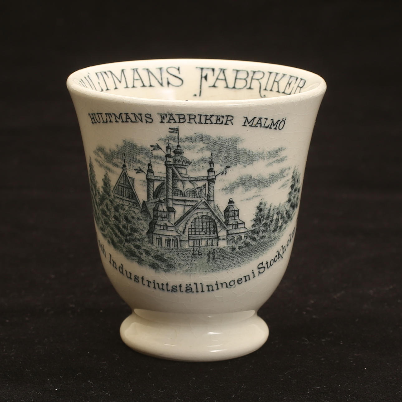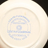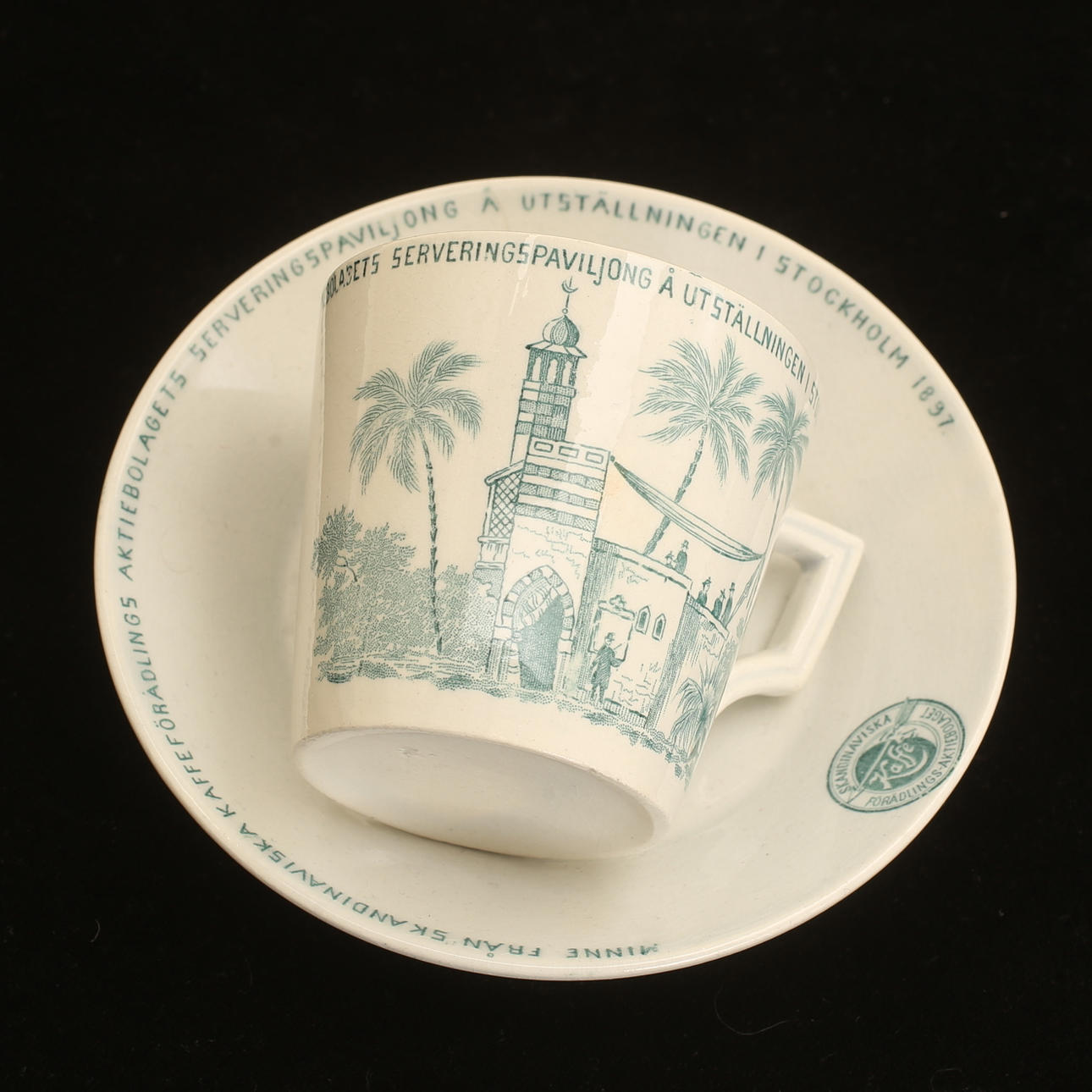 Commemorative porcelain from various exhibitions; "Agricultural meeting in Norrköping 1906" (Cup with saucer, jug with cover, and plate), #Remembrance from the Scandinavian coffee processing company's serving pavilion at the exhibition in Stockholm 1897", (cup with saucer), "Hultman's factories, the Art and Industry Exhibition in Stockholm 1897 " (cup), "Militärförläggingen iArkösund" (cup with saucer).