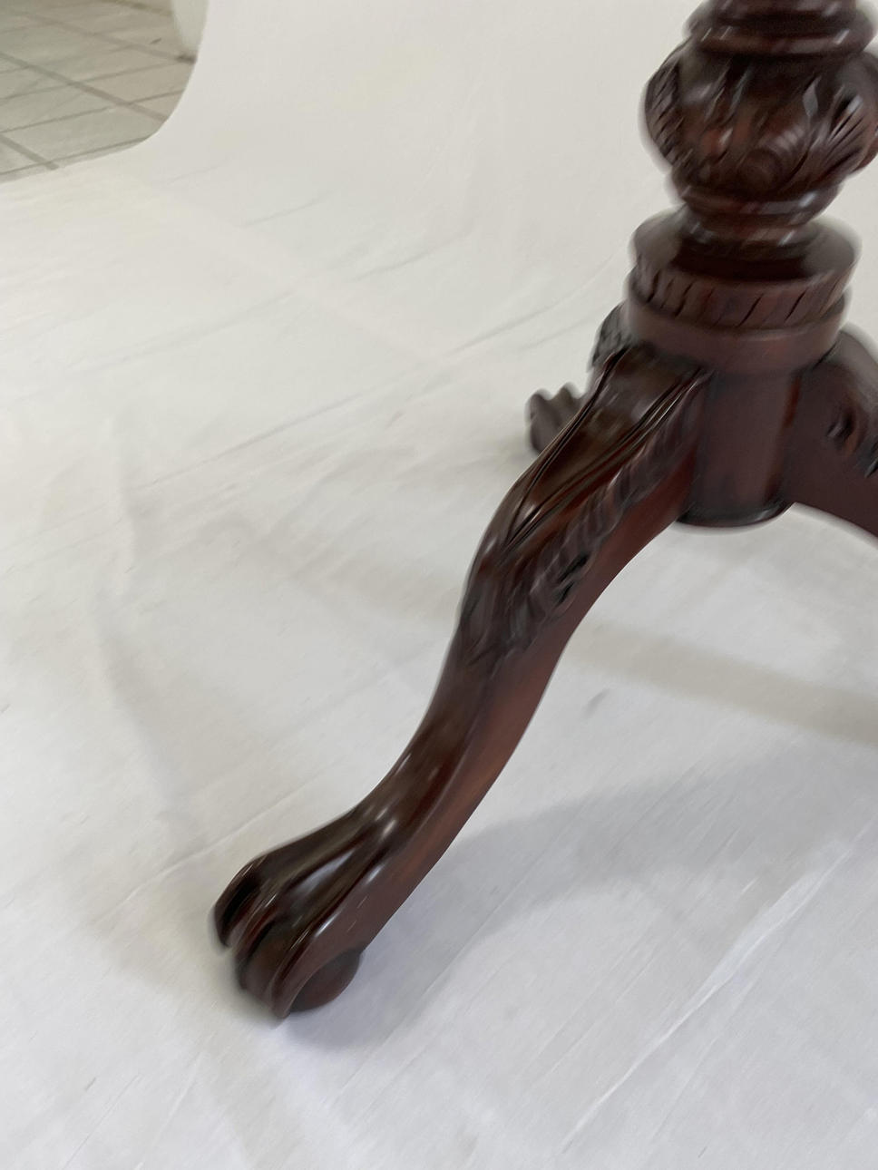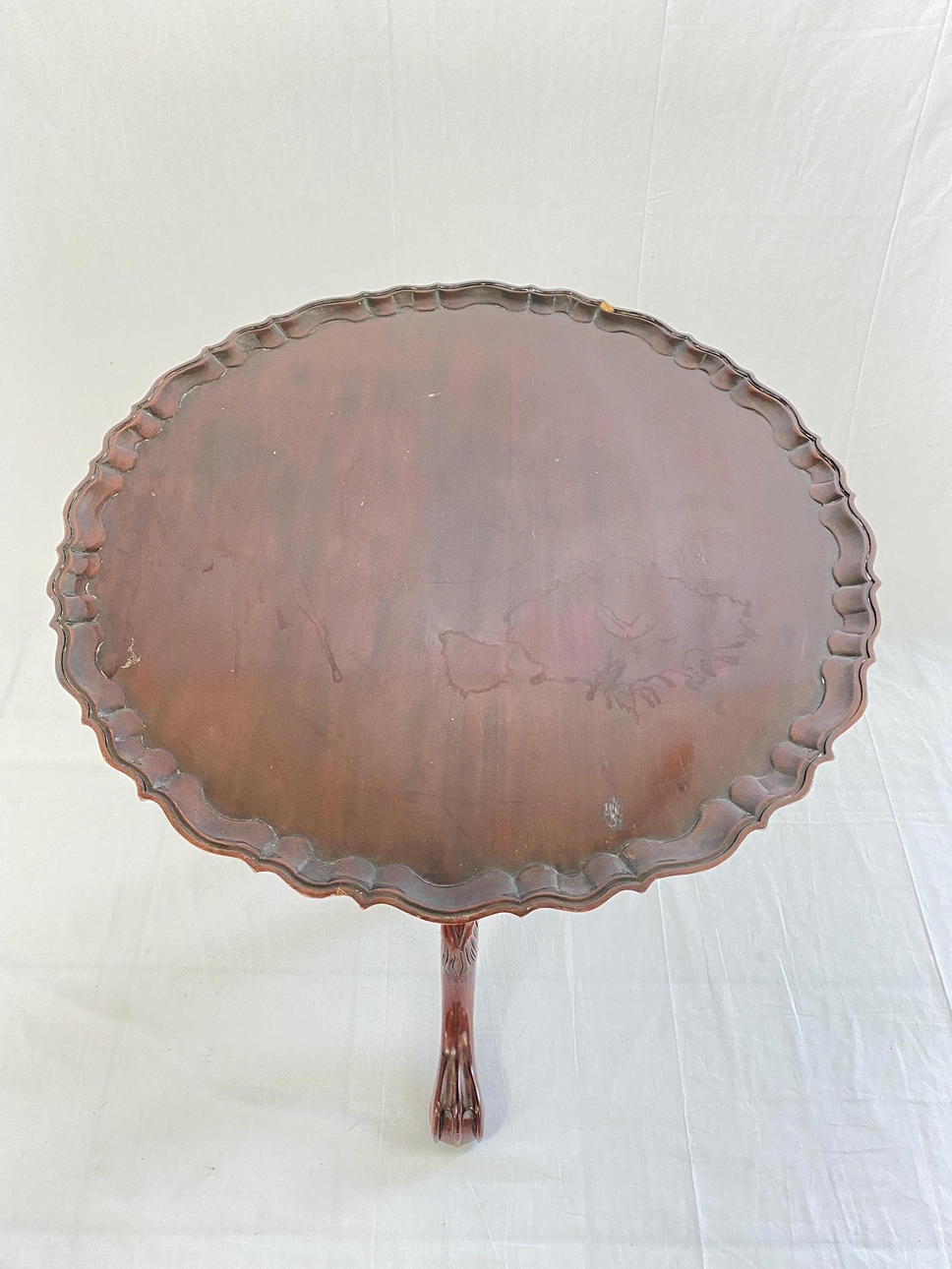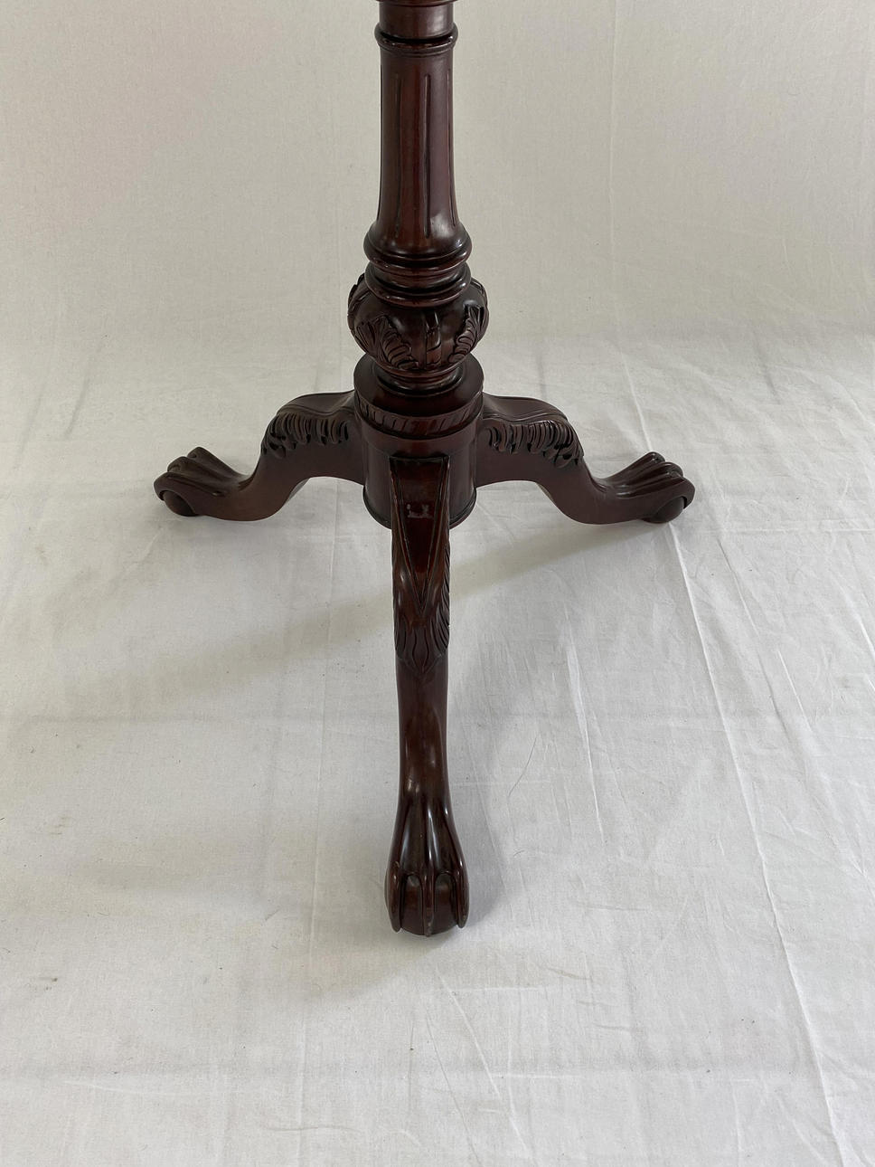 loose plate with slightly raised, curved edge, on three curved paw feet with relief ornamentation and central fluted column shaft, HxD:ca.77x70cm.