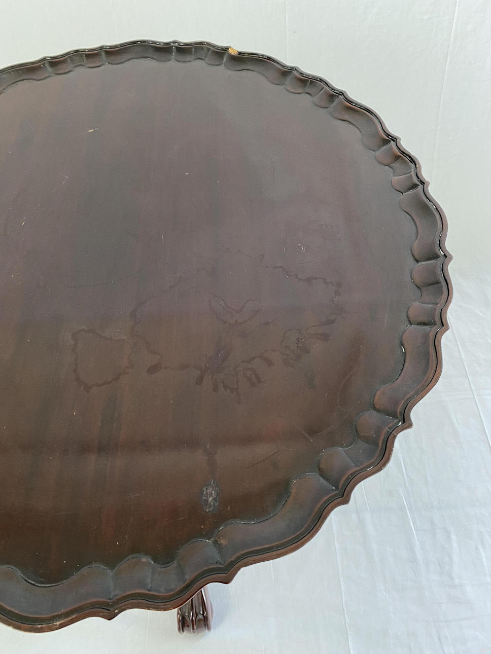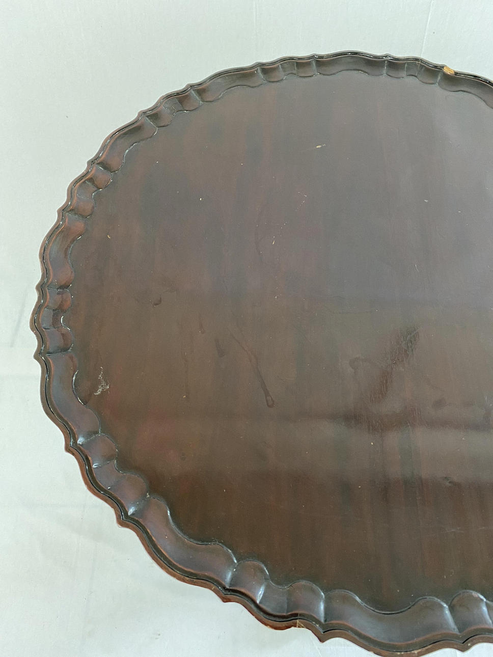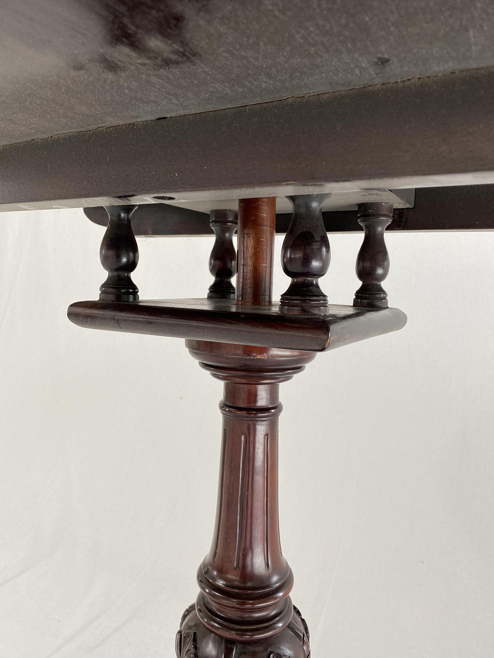 loose plate with slightly raised, curved edge, on three curved paw feet with relief ornamentation and central fluted column shaft, HxD:ca.77x70cm.