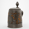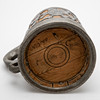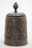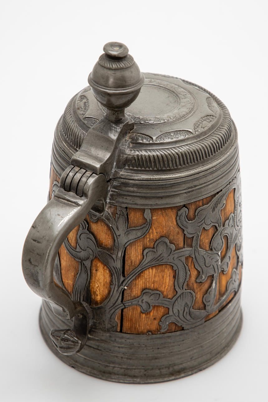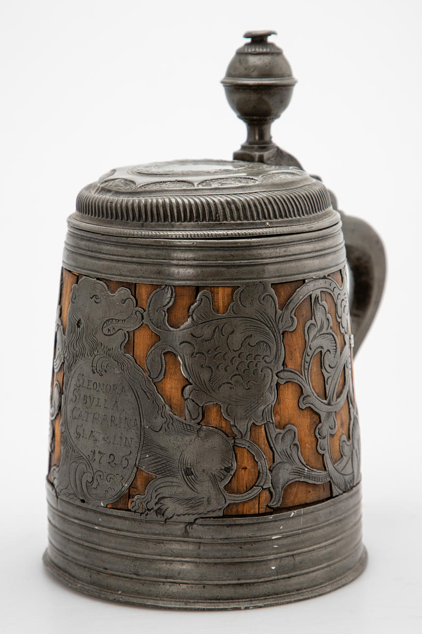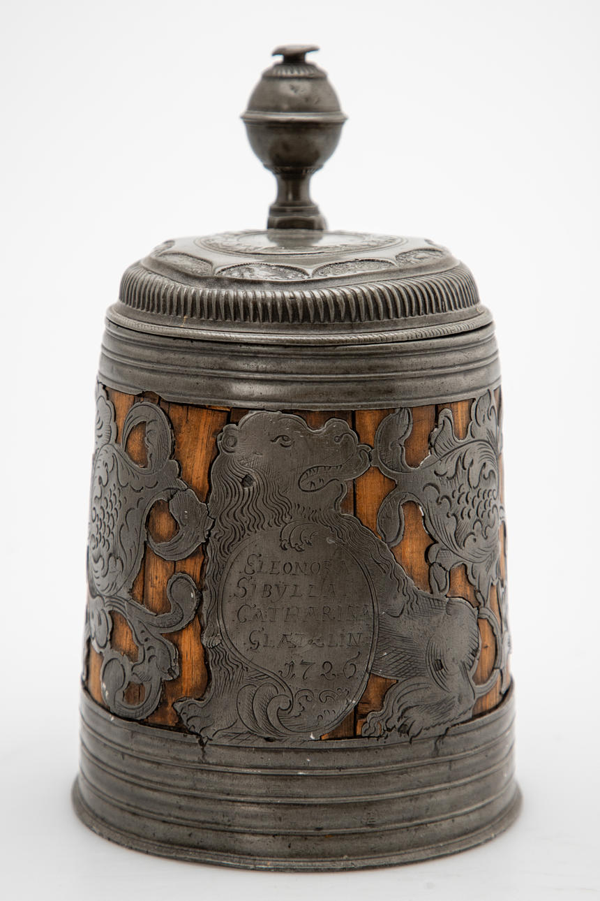 Fruitwood/tin, cast and engraved. Cylindrical, slightly conical body assembled from staves. Bordered at the top and bottom by wide profiled tires. Circumferential, open-worked plant tendrils with the owner's coat of arms on the front, held by a lion. Inscribed 'SLENORA SIBYLLA CATHERINA GLATZLIN 1726'. Hinged tin lid with double-confirm thumb rest and curved handle.