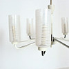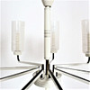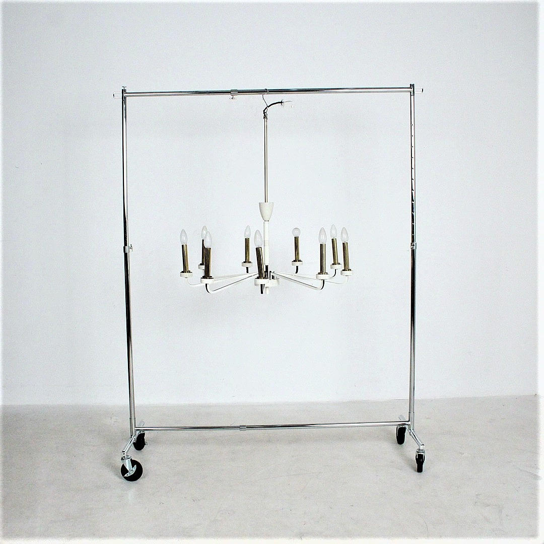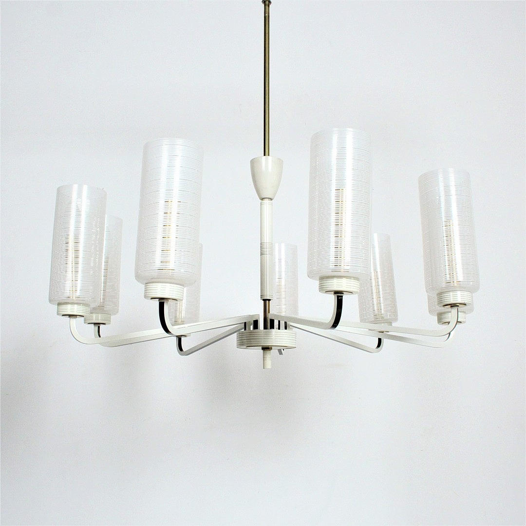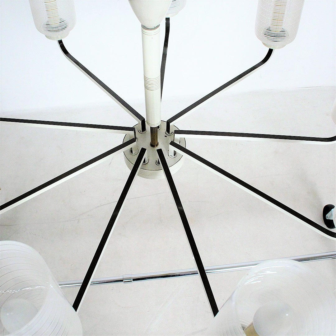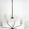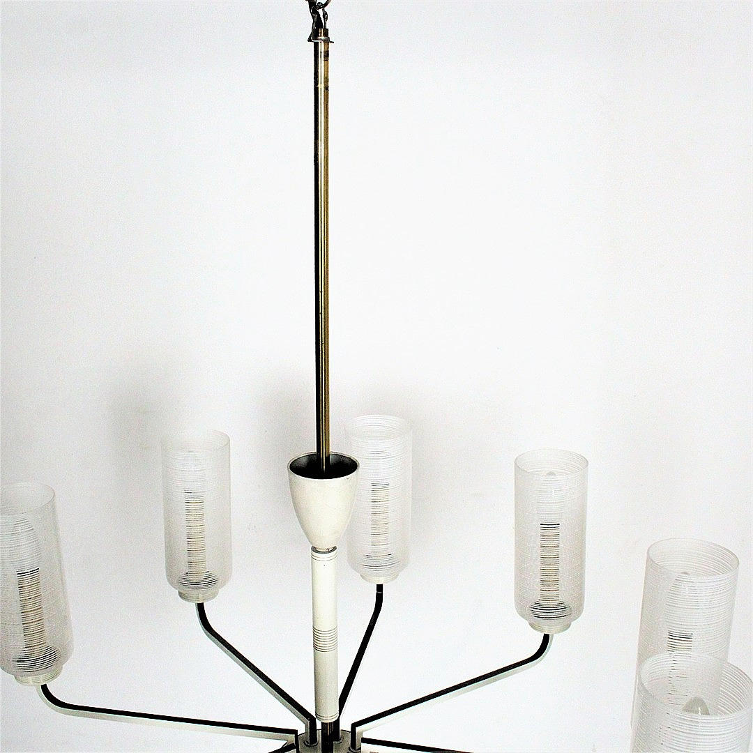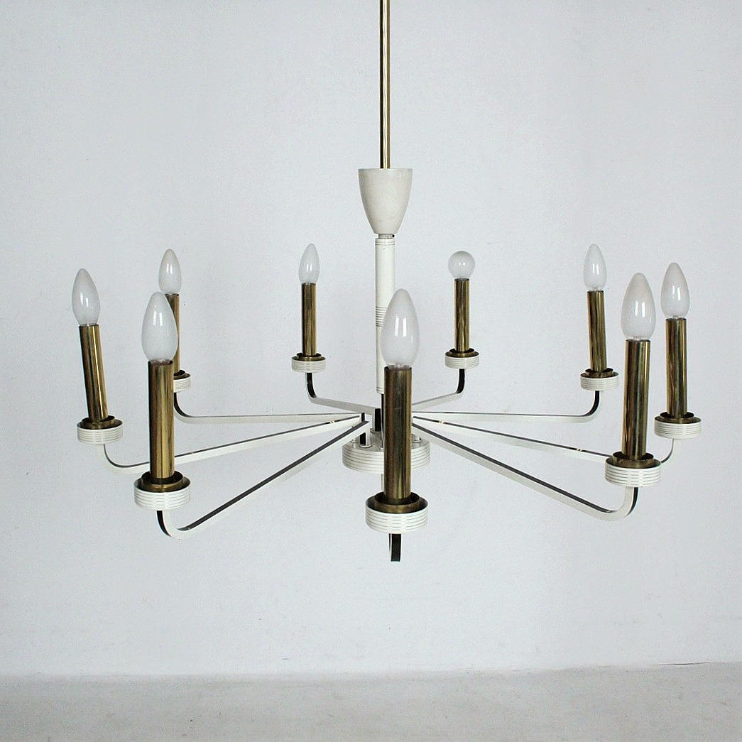 Mid Century 9-armed ceiling chandelier, material: brass, painted metal, glass.