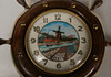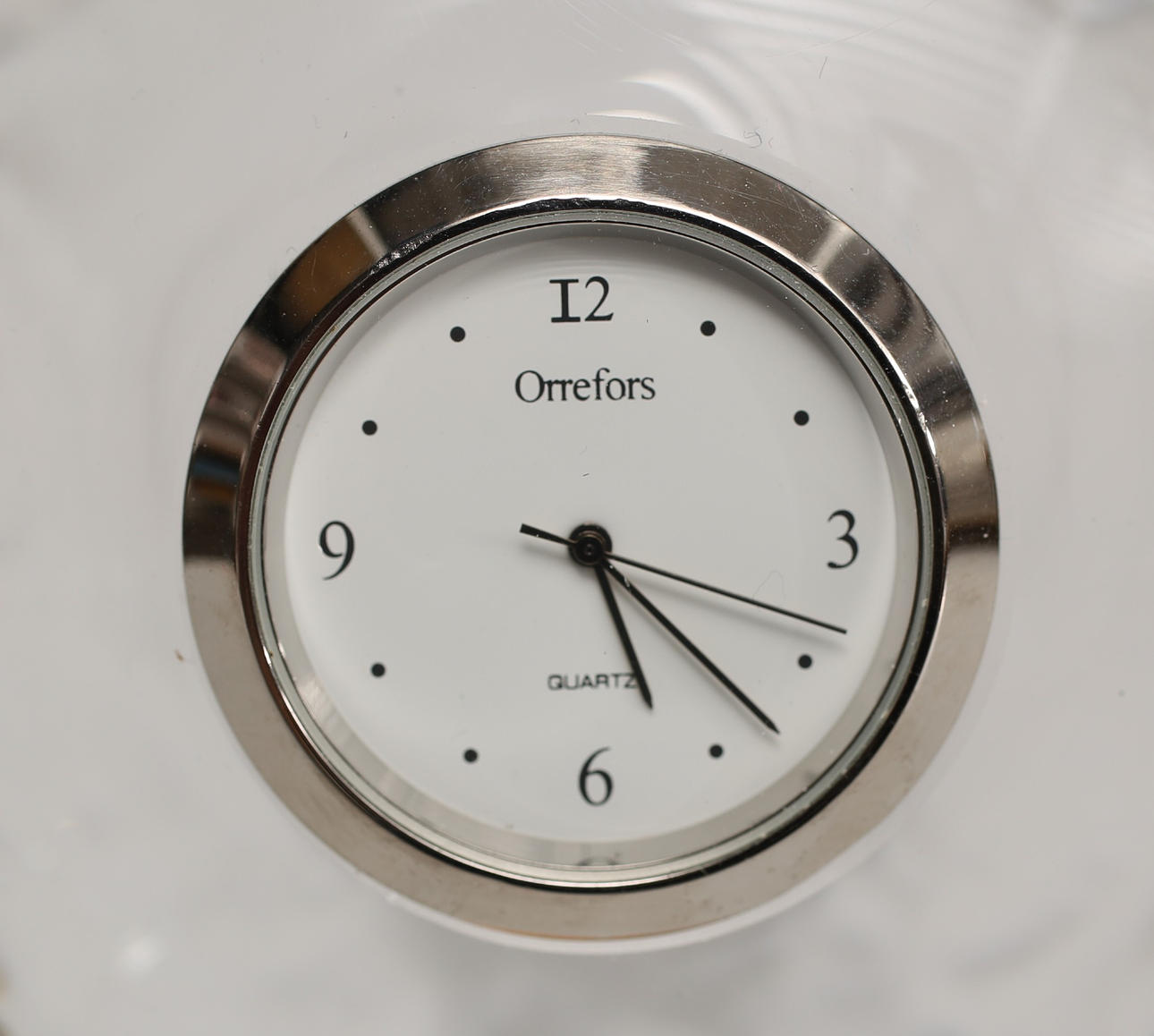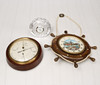 Table clock Orrefors 10 cm Barometer, wooden case, approx. 15 cm Mechanical wall clock in the shape of a boat steering wheel 23 cm.