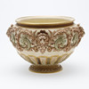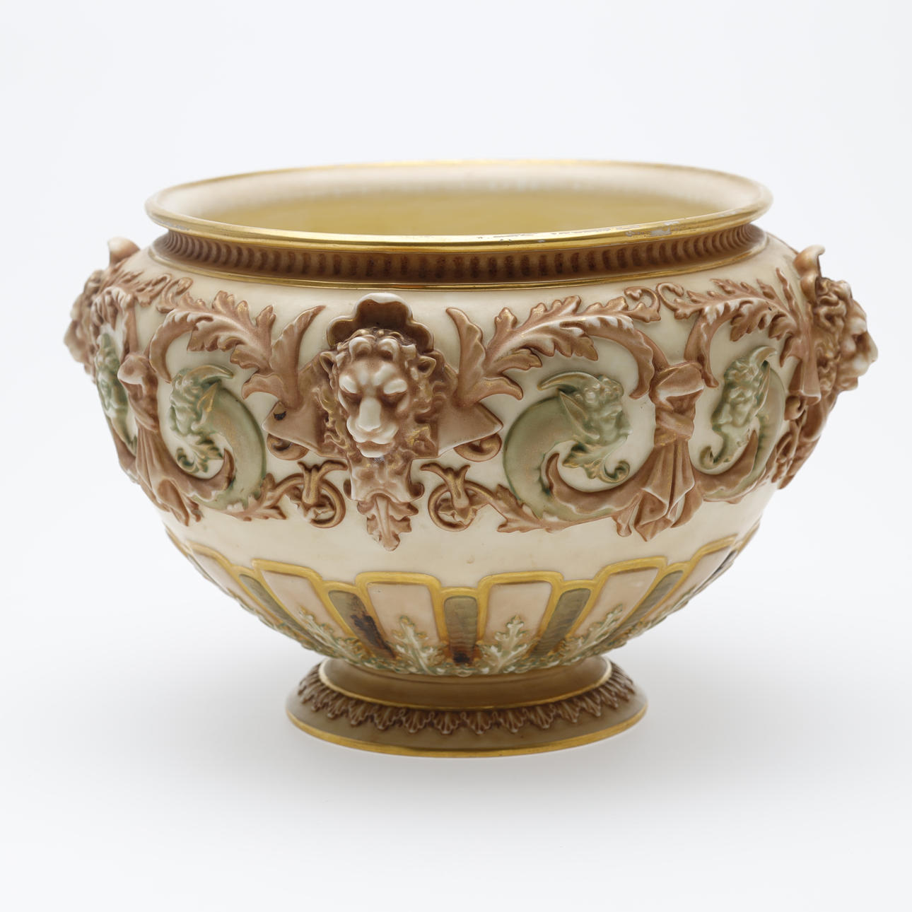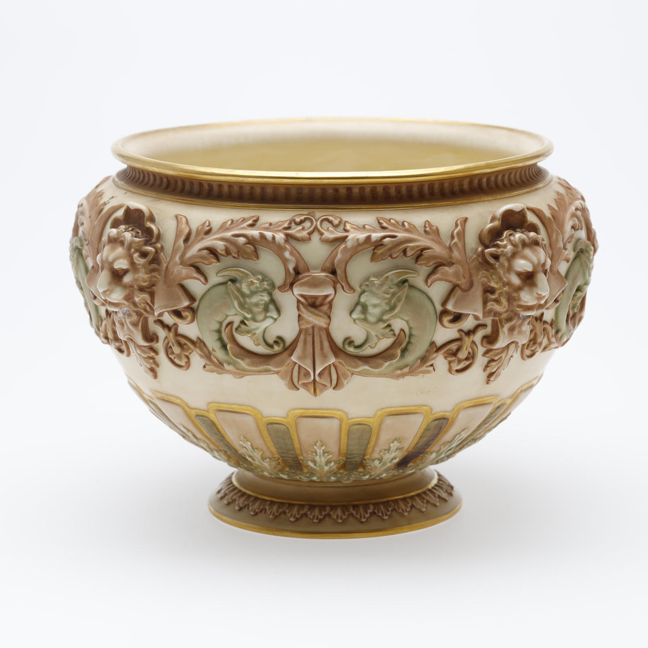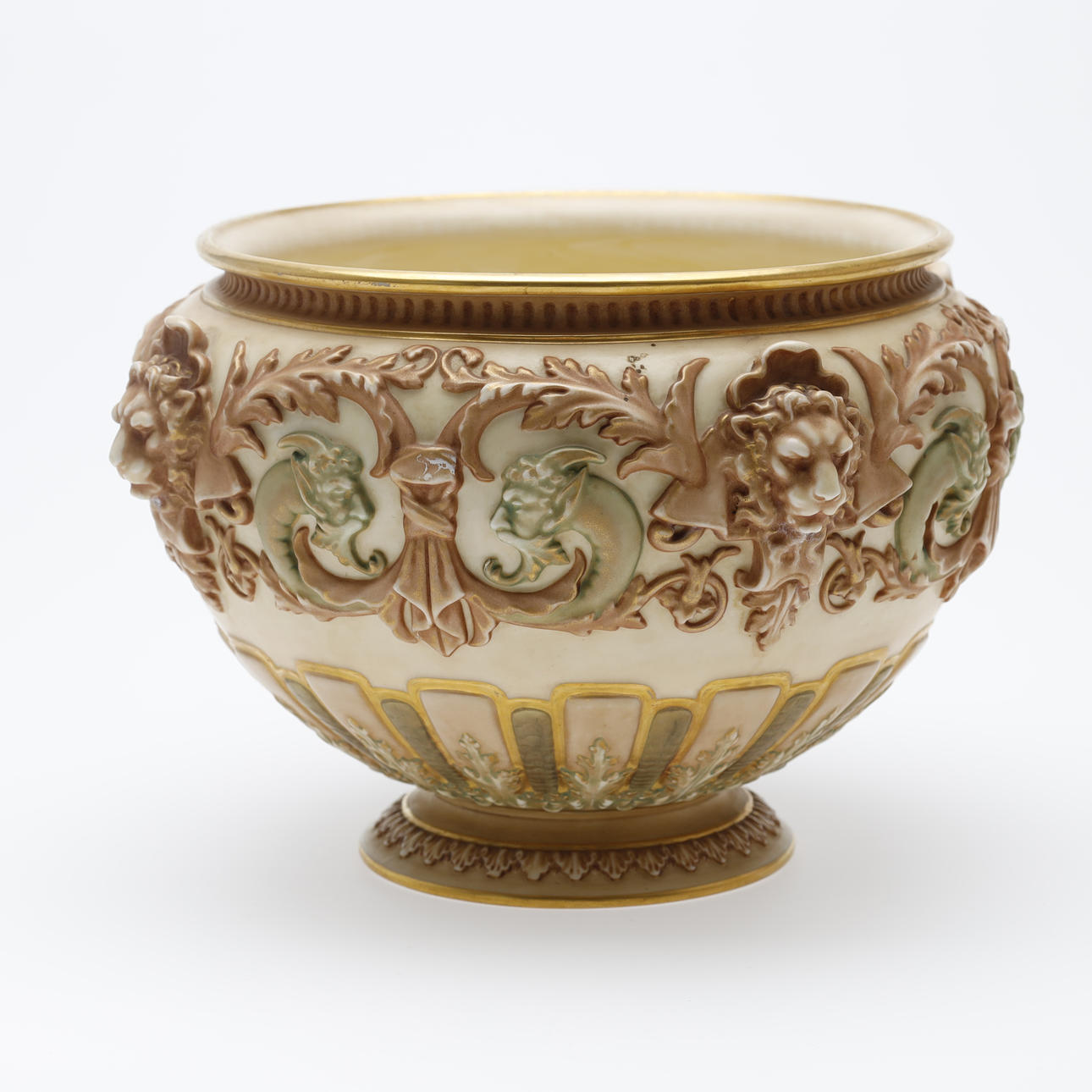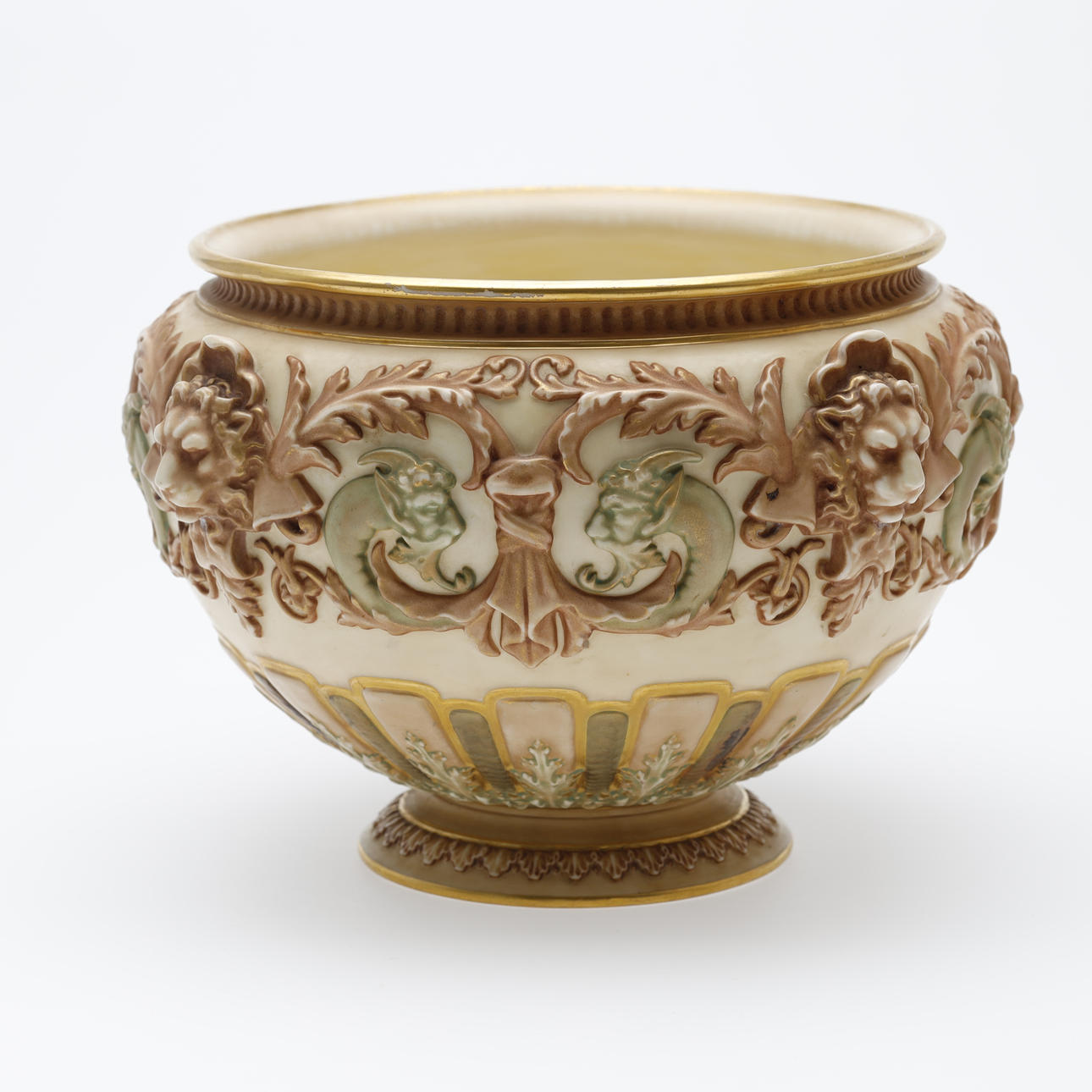 Jardiniere/bowl made at Royal Worcester around 1900. Decorated with ivory lion heads, pale green satyrs, tendrils and gilding.