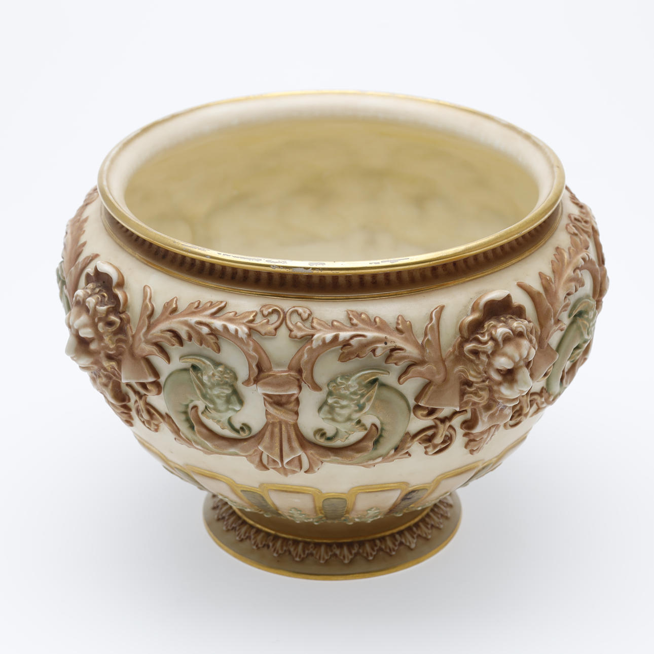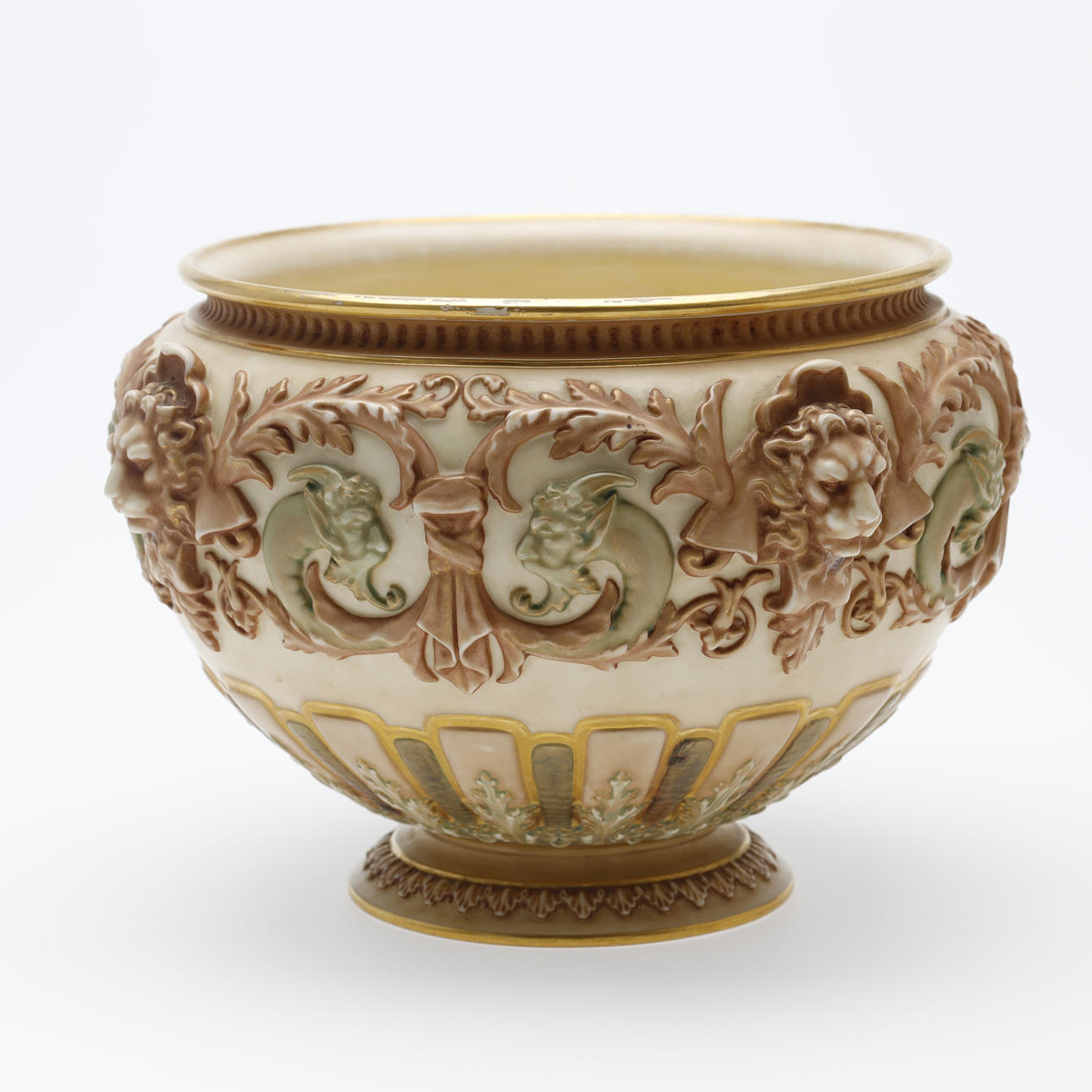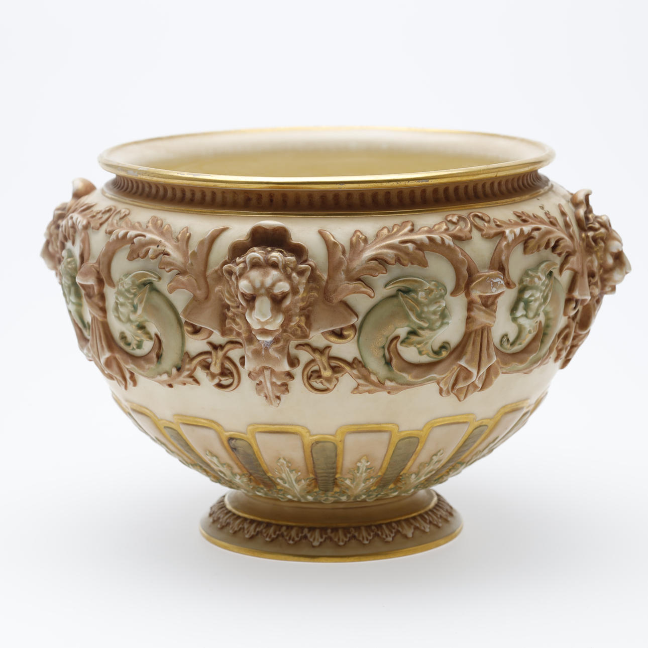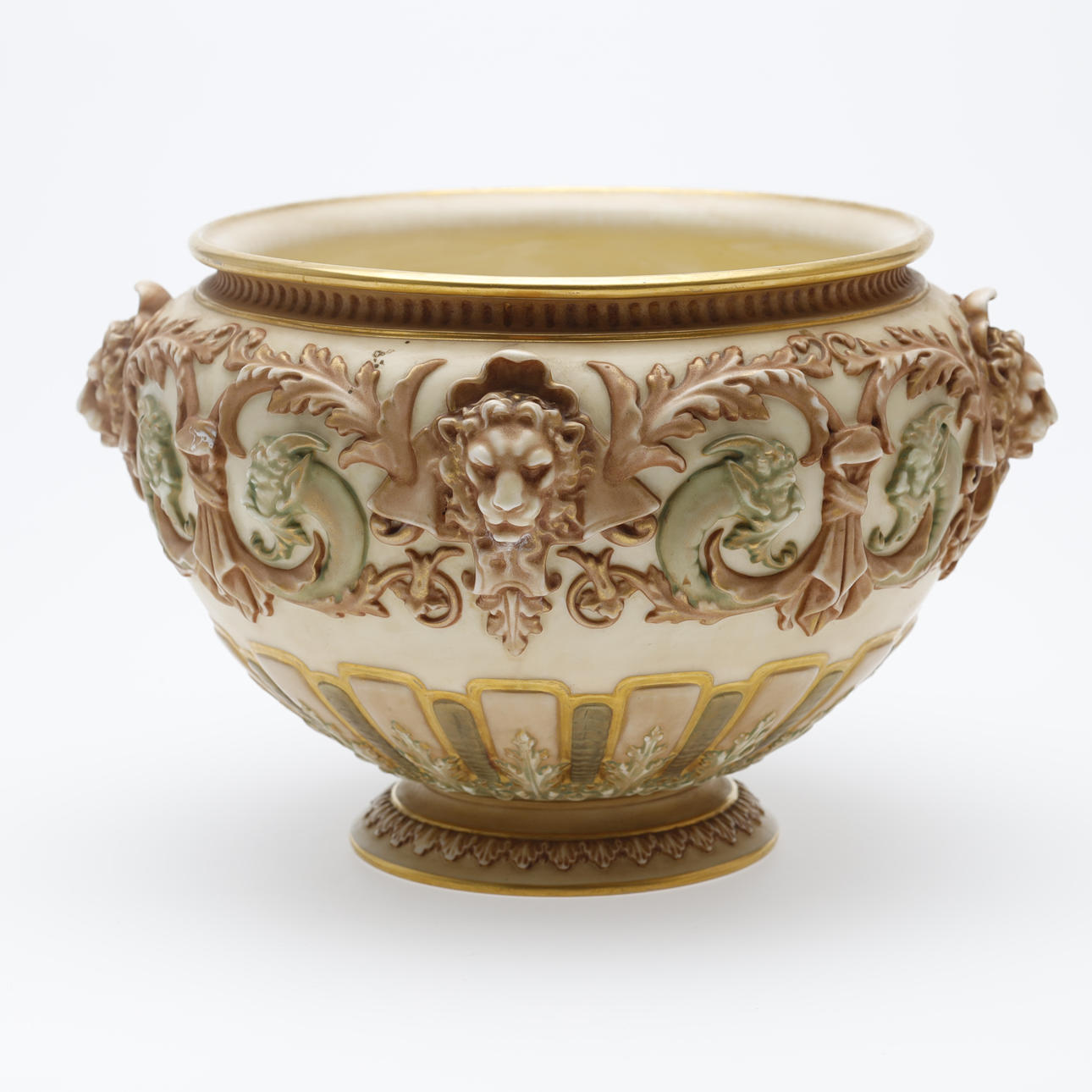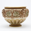 Jardiniere/bowl made at Royal Worcester around 1900. Decorated with ivory lion heads, pale green satyrs, tendrils and gilding.