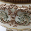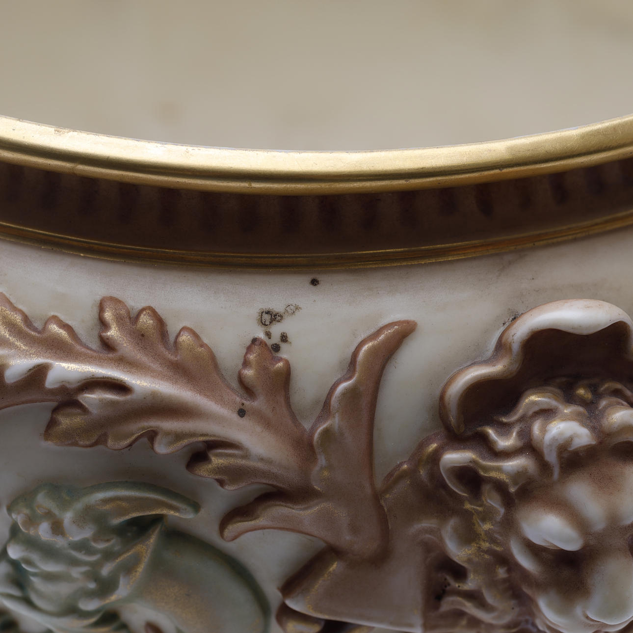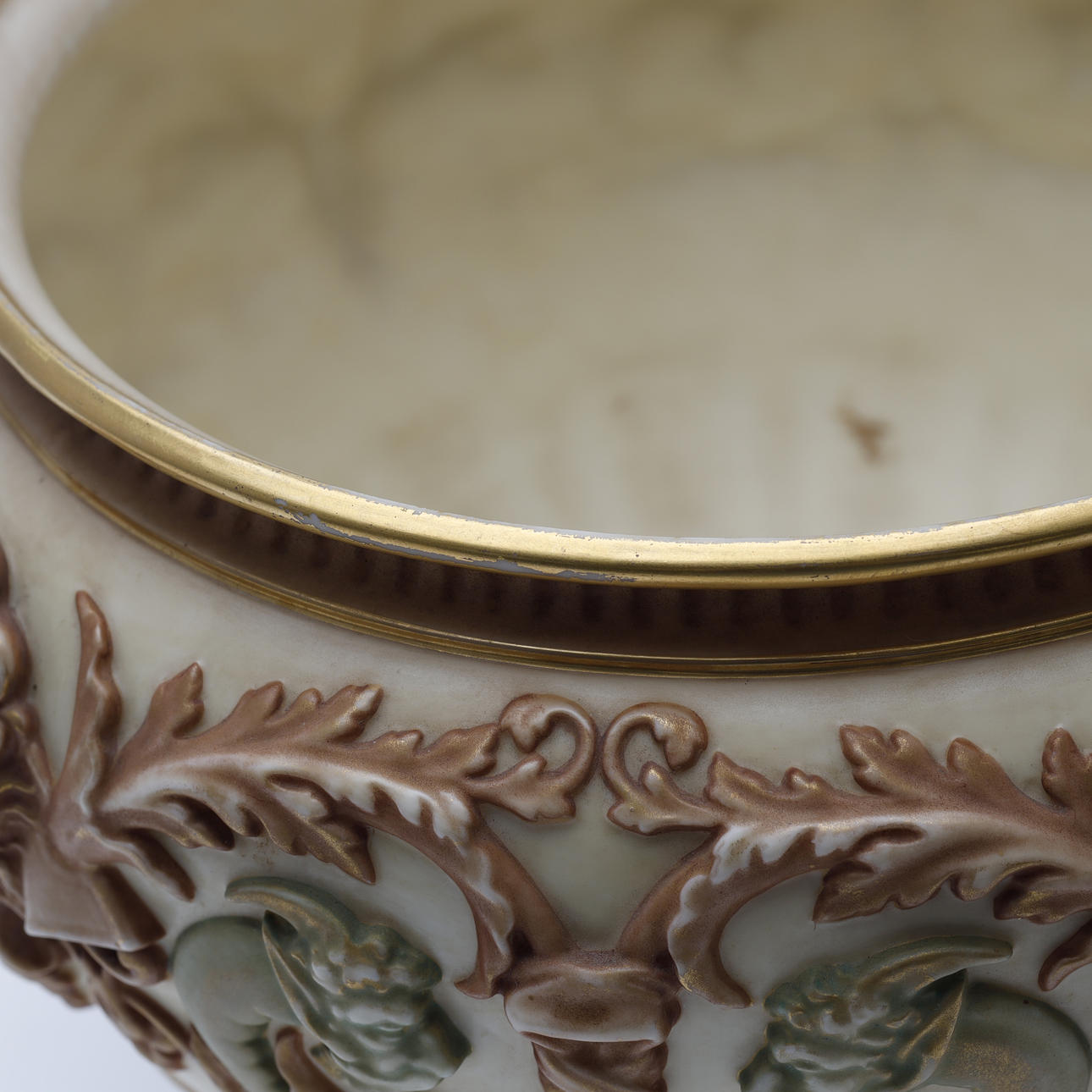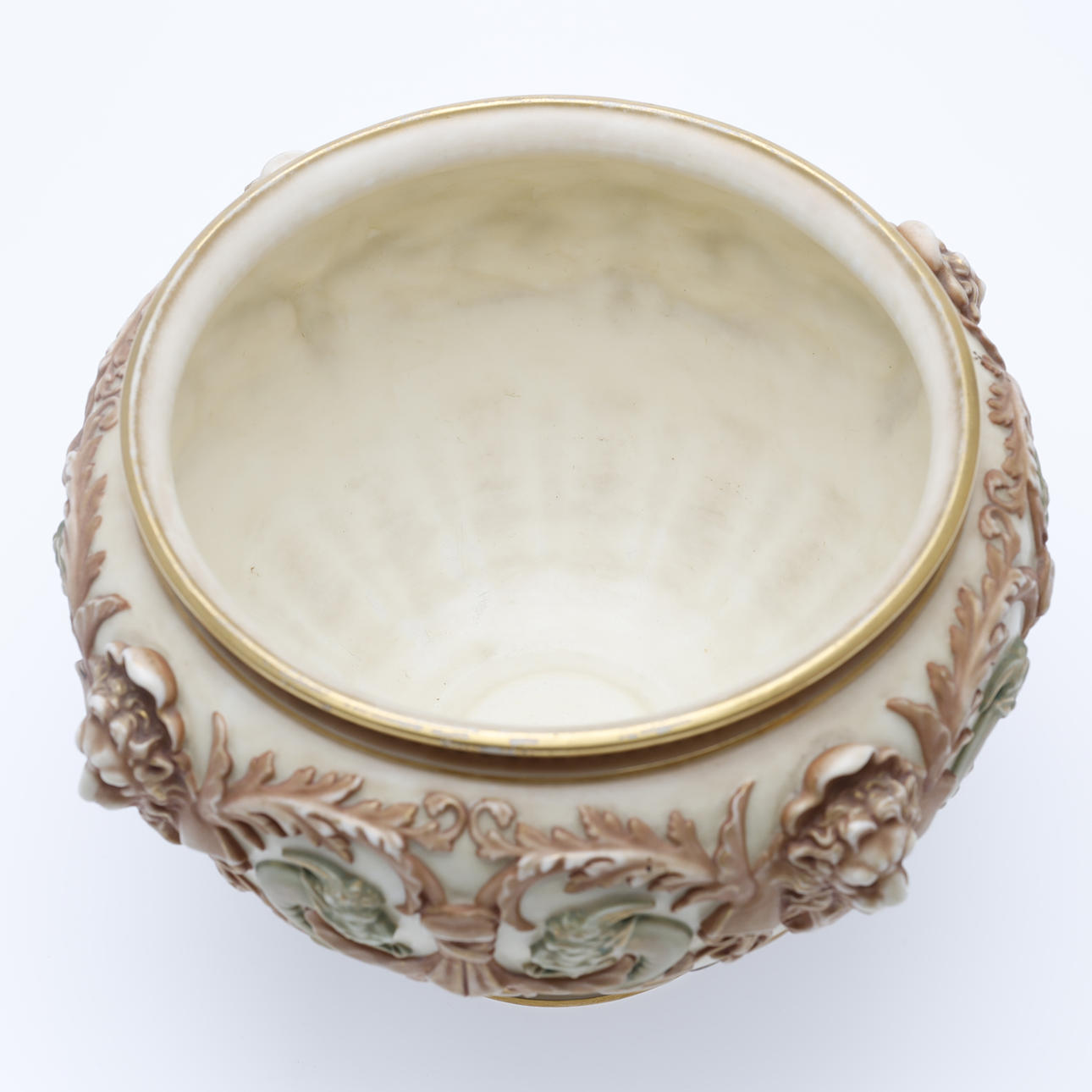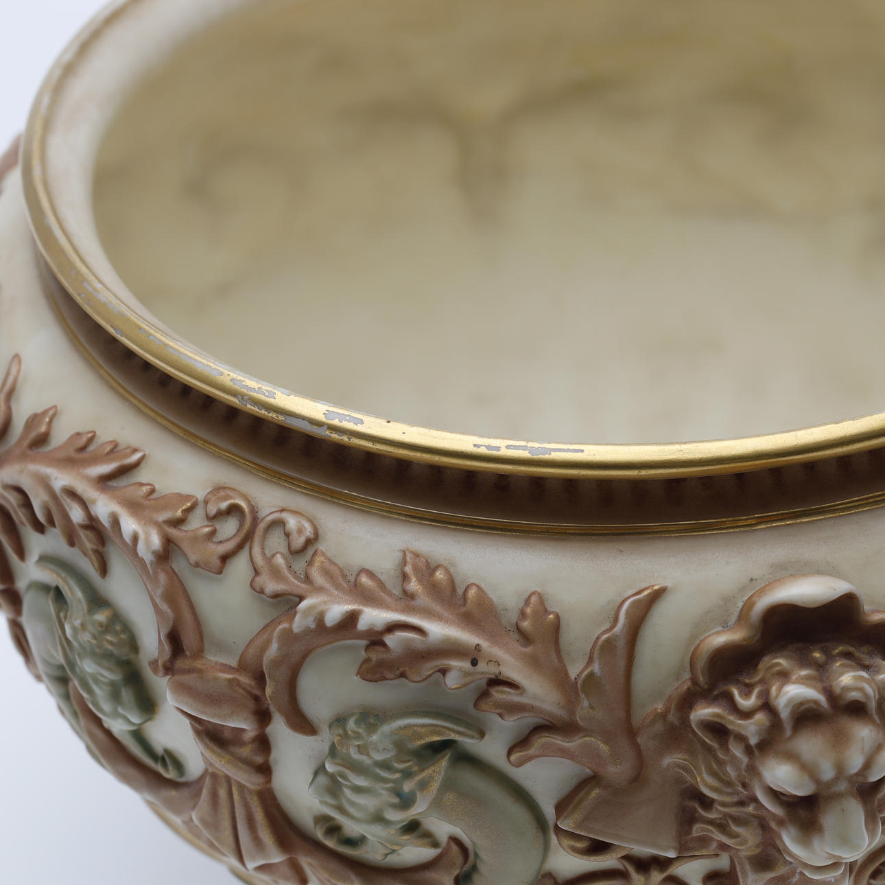 Jardiniere/bowl made at Royal Worcester around 1900. Decorated with ivory lion heads, pale green satyrs, tendrils and gilding.